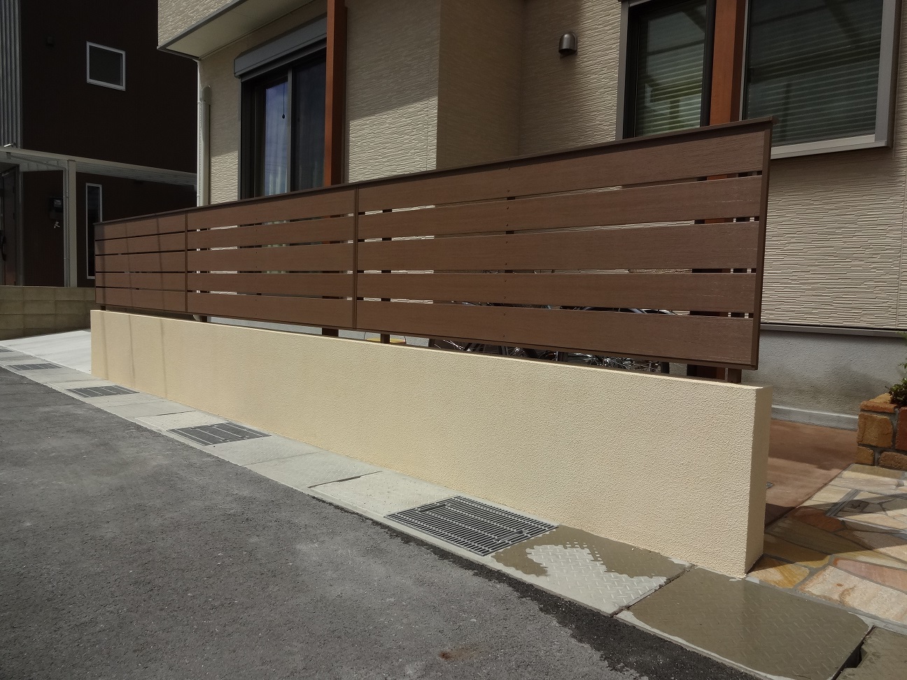 施工実績 太子町新築外構 建物と調和したナチュラルデザイン ベージュ系の外壁や玄関扉の木目調を門周りにも取り入れたデザインとなりました太子町I様邸門袖壁と塀でセミクローズ仕様となっていますナチュラルな雰囲気に合うディーズガーデンポスト/表札などのアイテムを取り入れています塀の後ろに設けたサイクルスペースへの導線も確保した使い勝手の良い門周りとなっています before イメージ図 門袖壁と塀との間より玄関へのアプローチとなります道路との高低差を解消するため可愛い耐火煉瓦でステップを設けています開口部分より見える土間には自然石乱張りで豪華さも兼ね備えています 塗り壁とレンガタイル張りの門柱ディーズガーデン:表札・ポスト・インターホンカバー 門袖壁と合わせた塗り壁の上にはFRP製の木目調アルファウッドフェンス