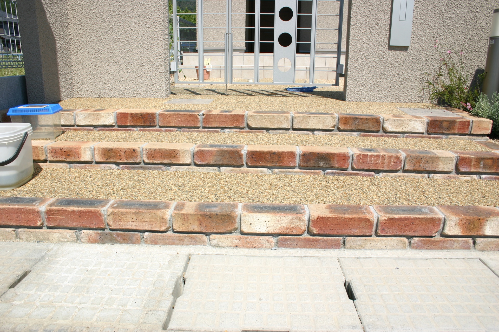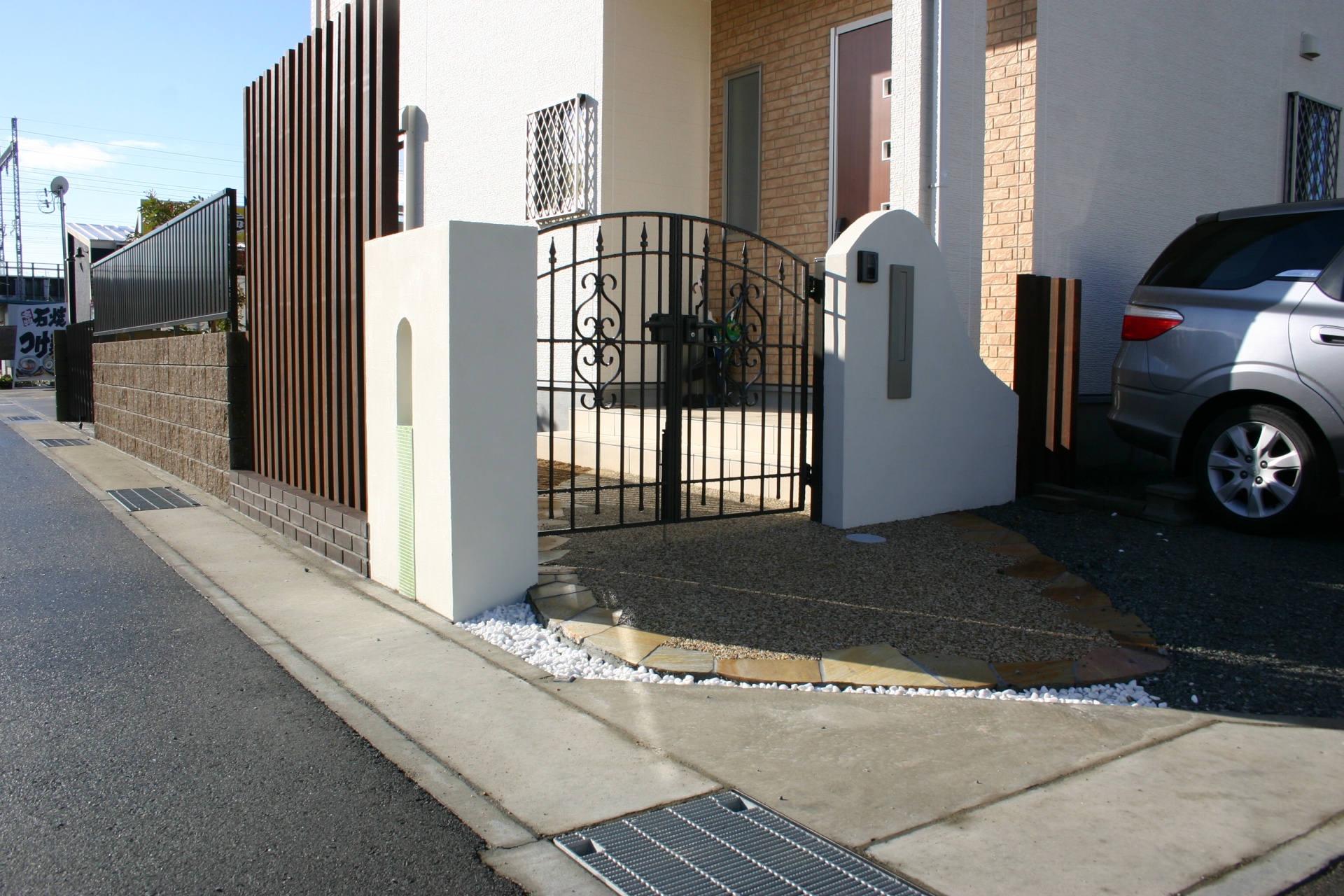施工実績 太子町新築外構 ウッドスクリーン目隠しエクステリア 幹線道路に面している玄関先をいかに自然にナチュラルにカバーするかの御相談でした。ウッドの玄関扉にリンクさせた木製のスリットフェンスで、角度による目隠しをデザインしました。プライバシーを考慮したエクステリア門柱デザインです。 アイアンタイプのリクシル コラゾン門扉で門周りをデザインしました。イエロー系の自然石と淡路自然石洗い出しで明るいアプローチデザインに演出します。 ウッド目隠しスクリーンのサイドにグリーンのワンポイントモザイクをスリット窓でアクセントデザインしました。ライトグリーンのガラスモザイクがポイントです。