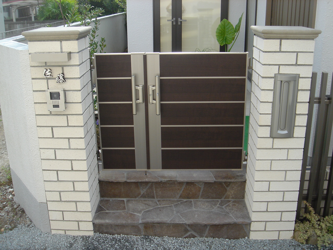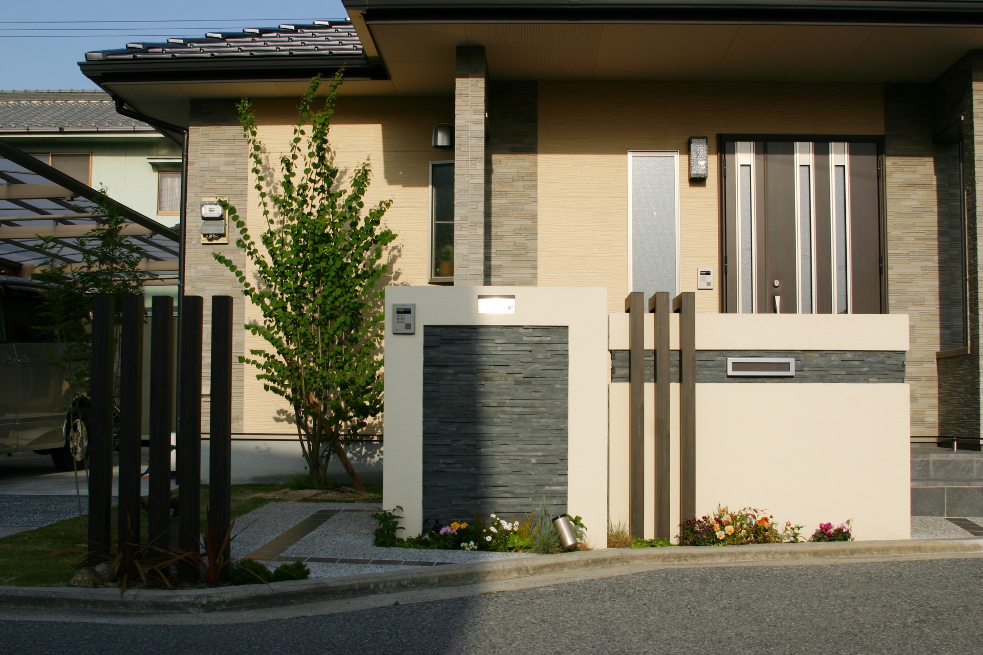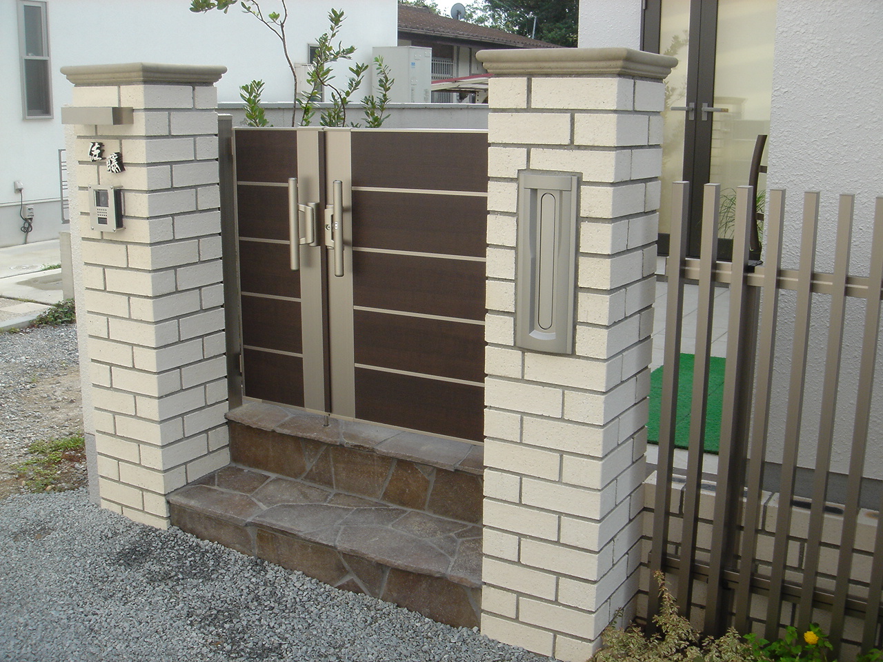 施工実績 姫路市新築外構 レンガ角柱で重厚感があるホワイト門柱 外壁に合わせホワイトのレンガをセレクト。ウッド調の門扉とうまく調和しています。 塀には圧迫感を感じさせないよう、アルミの千本格子をデザイン。 門周りはシルバーで統一。