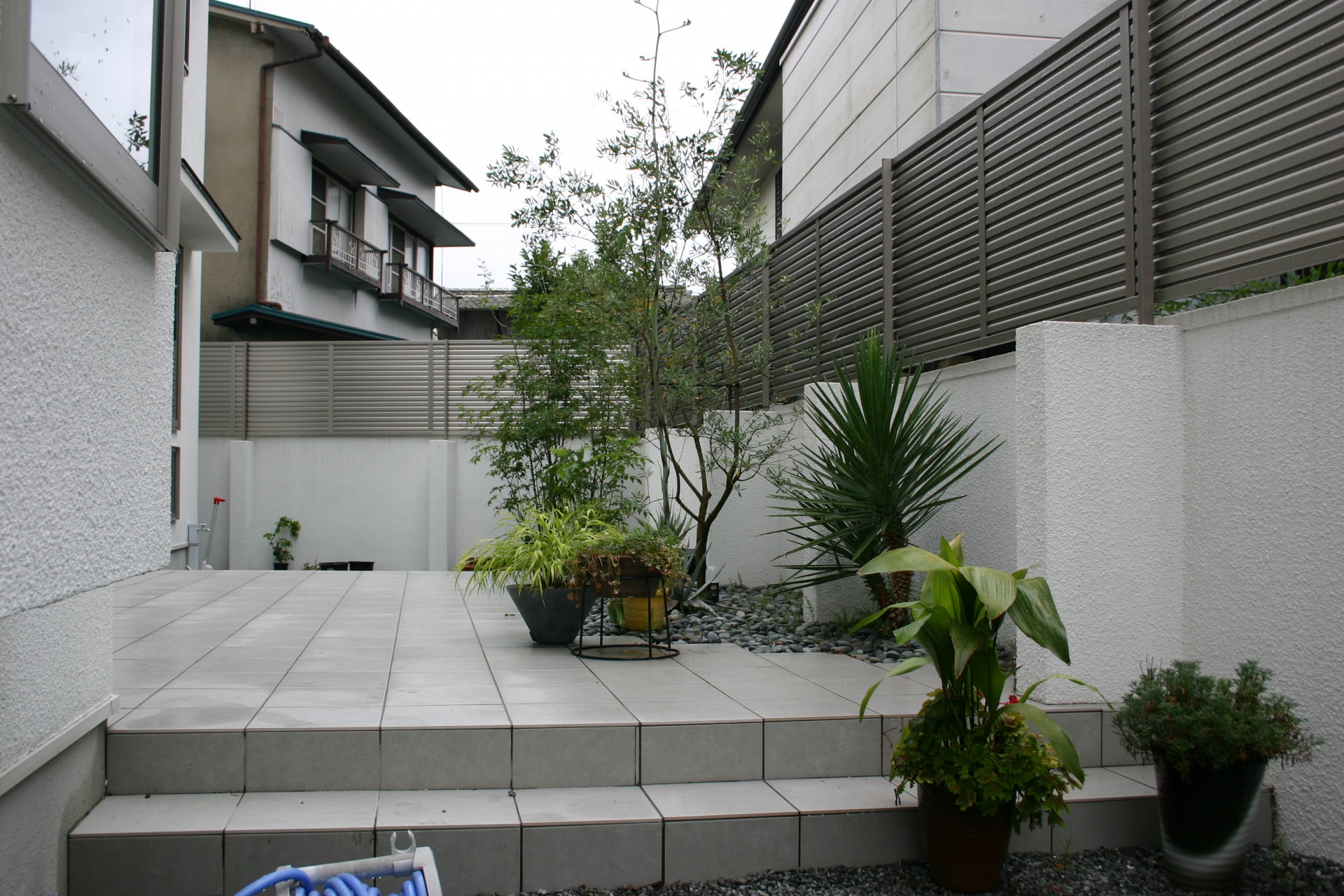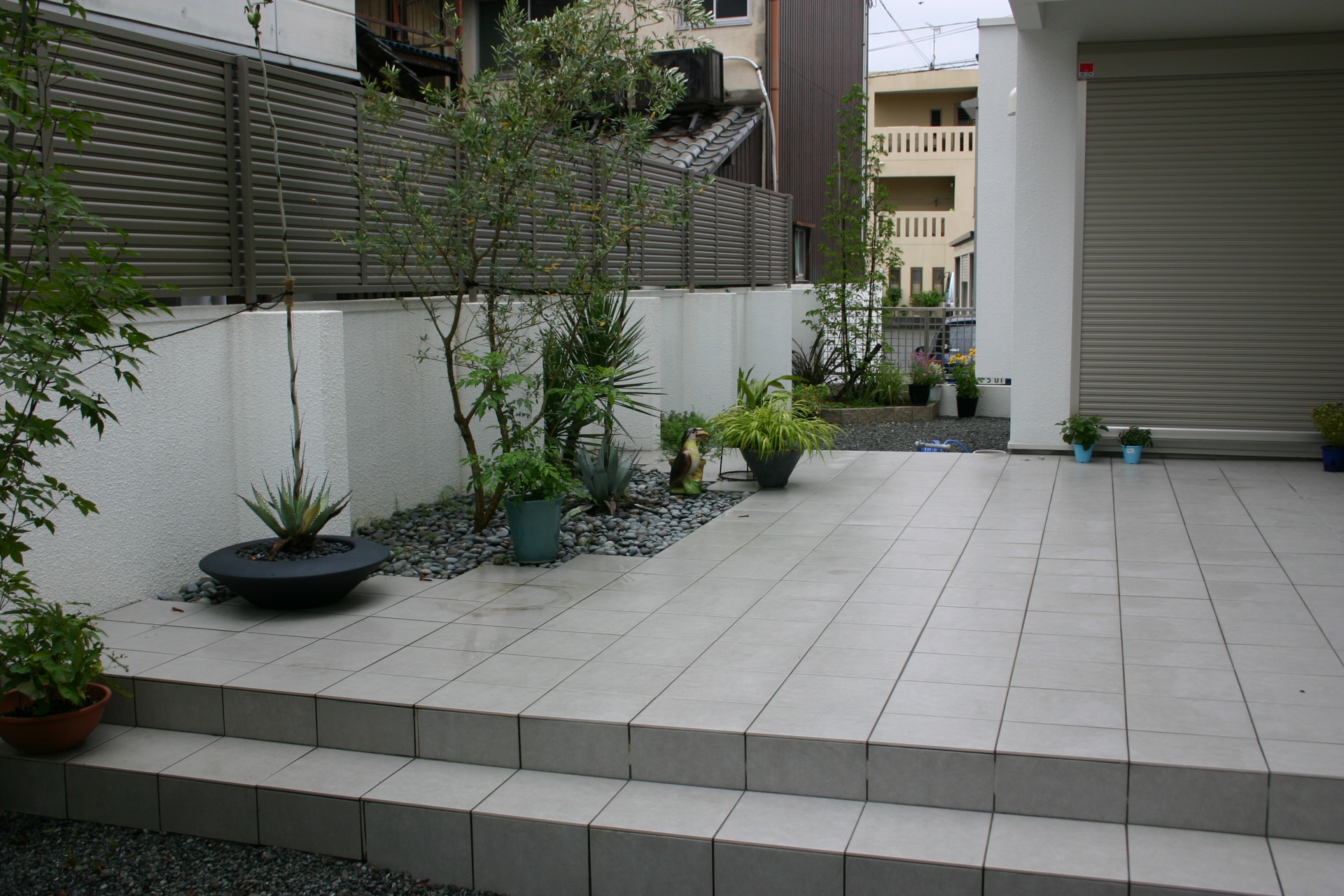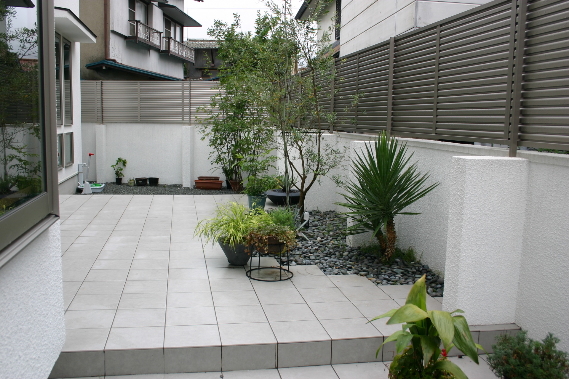 施工実績 ホワイトタイルとグリーンのある暮らし 姫路市K様邸 ホワイトのタイルに外壁の姫路市K様邸。境界はアルミフェンスでプライバシーを確保し、中央にグリーンを配置しました。ホワイトタイルの中央にデザインしたグリーンスペースがリビングから見た癒しの空間に演出してくれます。