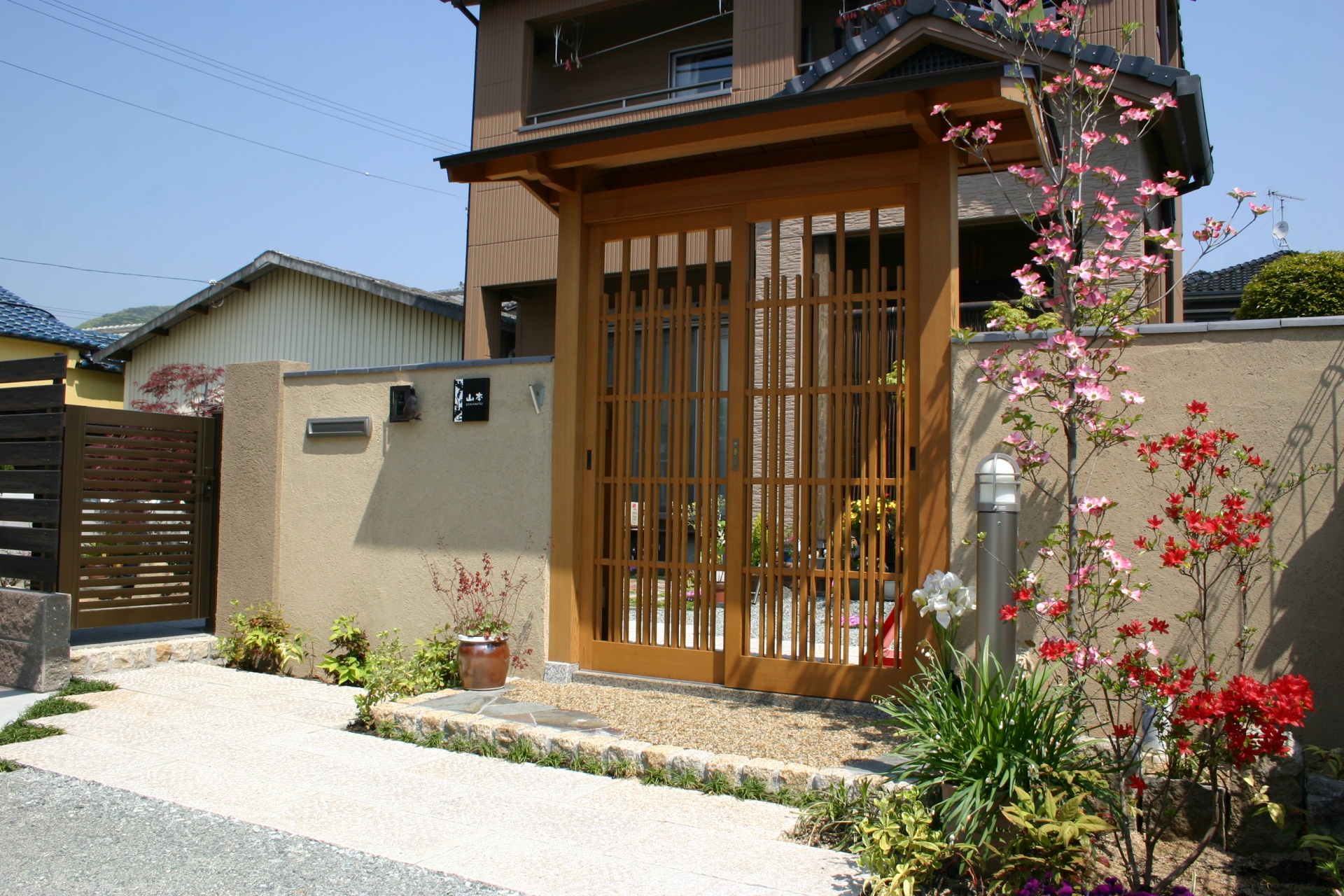 施工実績 ブラックシンプルエクステリアデザイン 赤穂市外構 ブラックのシンプルモダン門柱デザイン赤穂市のエクステリア施工例です。銅葉のニューサイランの鉢植えに直線的なアプローチデザインを組み合わせたモノトーンエクステリアデザイン。レッドの玄関扉がポイントです。