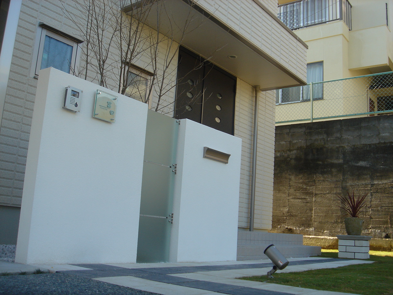 ホワイトベースの門柱のセンターにポリカパネルをデザインしました。
