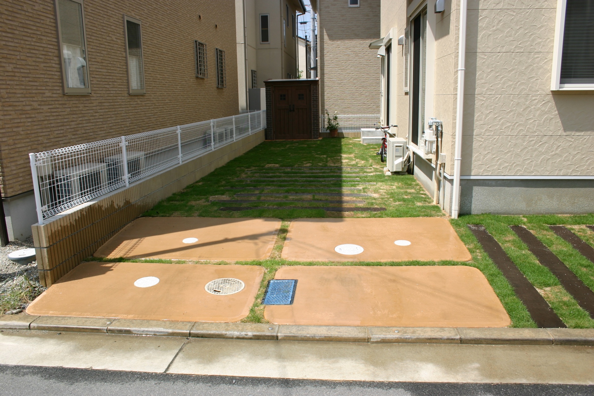 施工実績 カラーコンクリート仕上げ車庫 加古川市エクステリア カラーコンクリートでナチュラルな車庫土間デザインを設計しました。芝生に合うナチュラルなデザインガーデンエクステリアになりました。どことなく土のイメージを意識した土間デザインです。