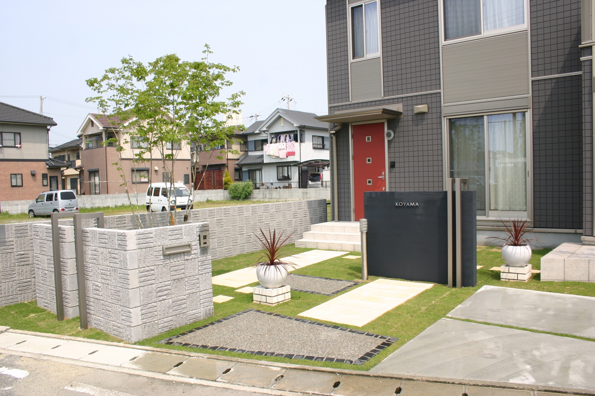 キューブ化粧ブロックとブラック門柱のコラボエクステリア