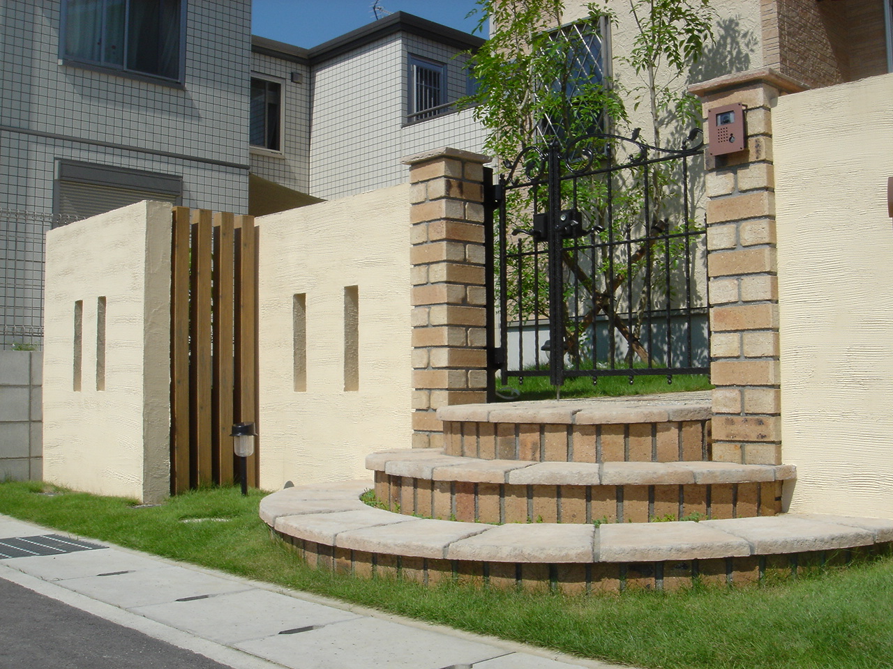 アプローチのサークルステップの蹴上にレンガを縦積みでデザインしました。門柱の角柱とうまくコラボレーションしています。