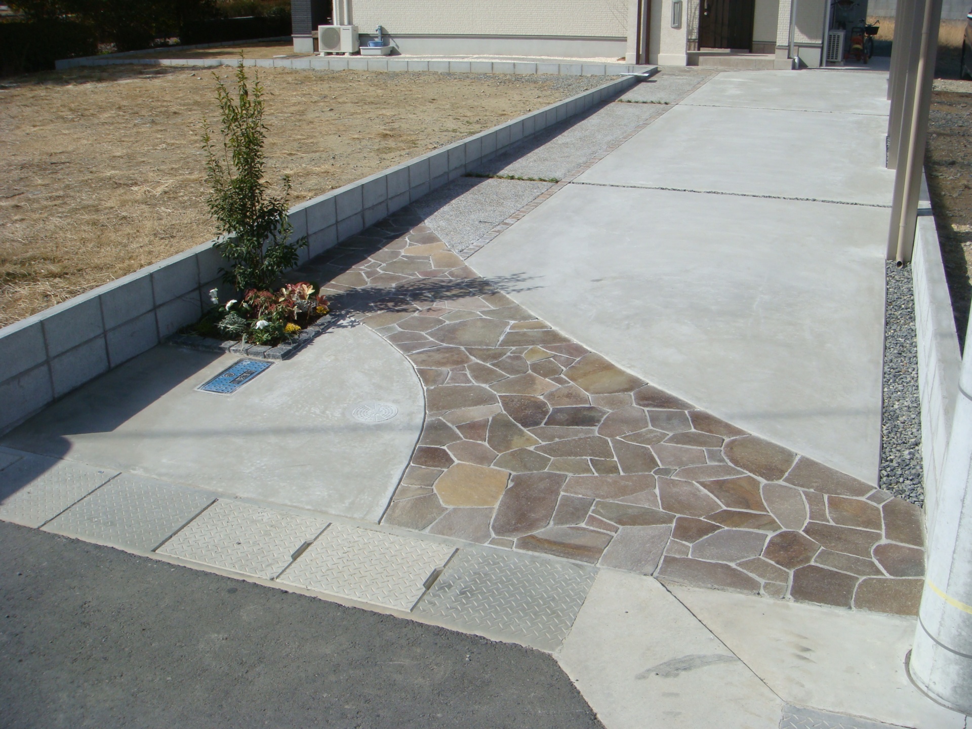 車庫兼用のアプローチに自然石でアクセントをデザインしました。