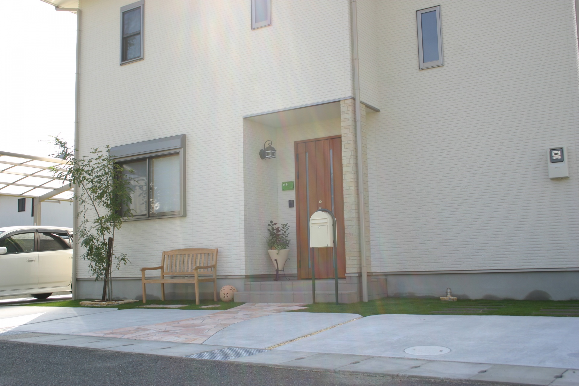 ステンレスバーとイエローポストのコラボエクステリア