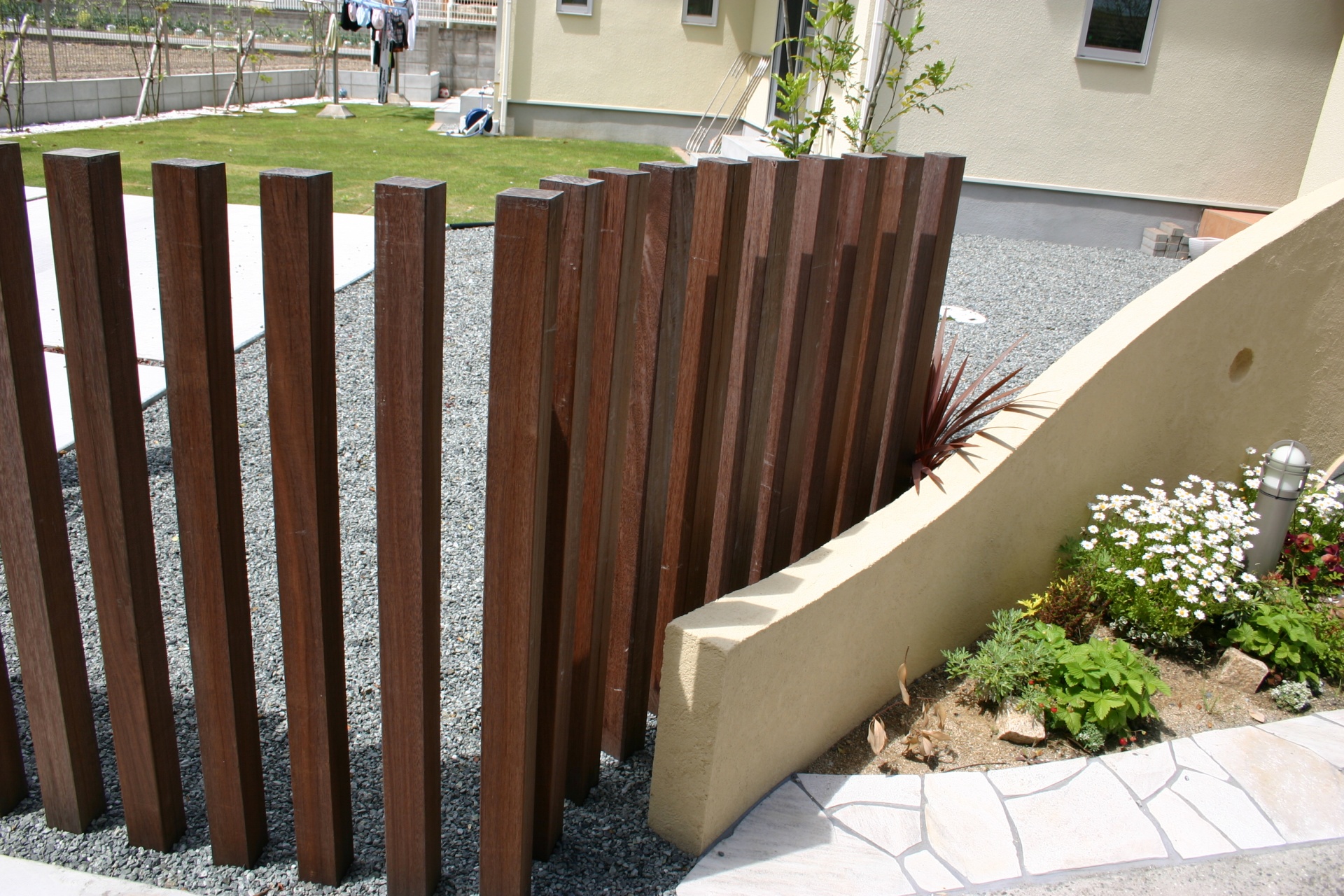 施工実績 ウッドアーチのガーデンポイント 意匠壁にデザイン性のあるウッドアーチをデザインしました。門灯の円形照明が夜を素敵にライトアップしてくれます。銅葉のコルジルネがガーデンアクセントになっています。