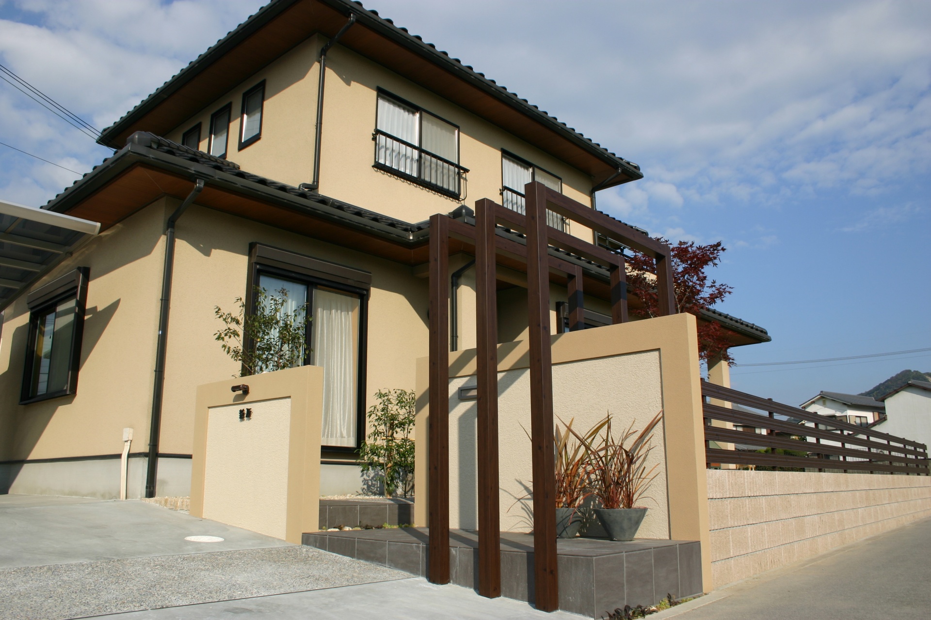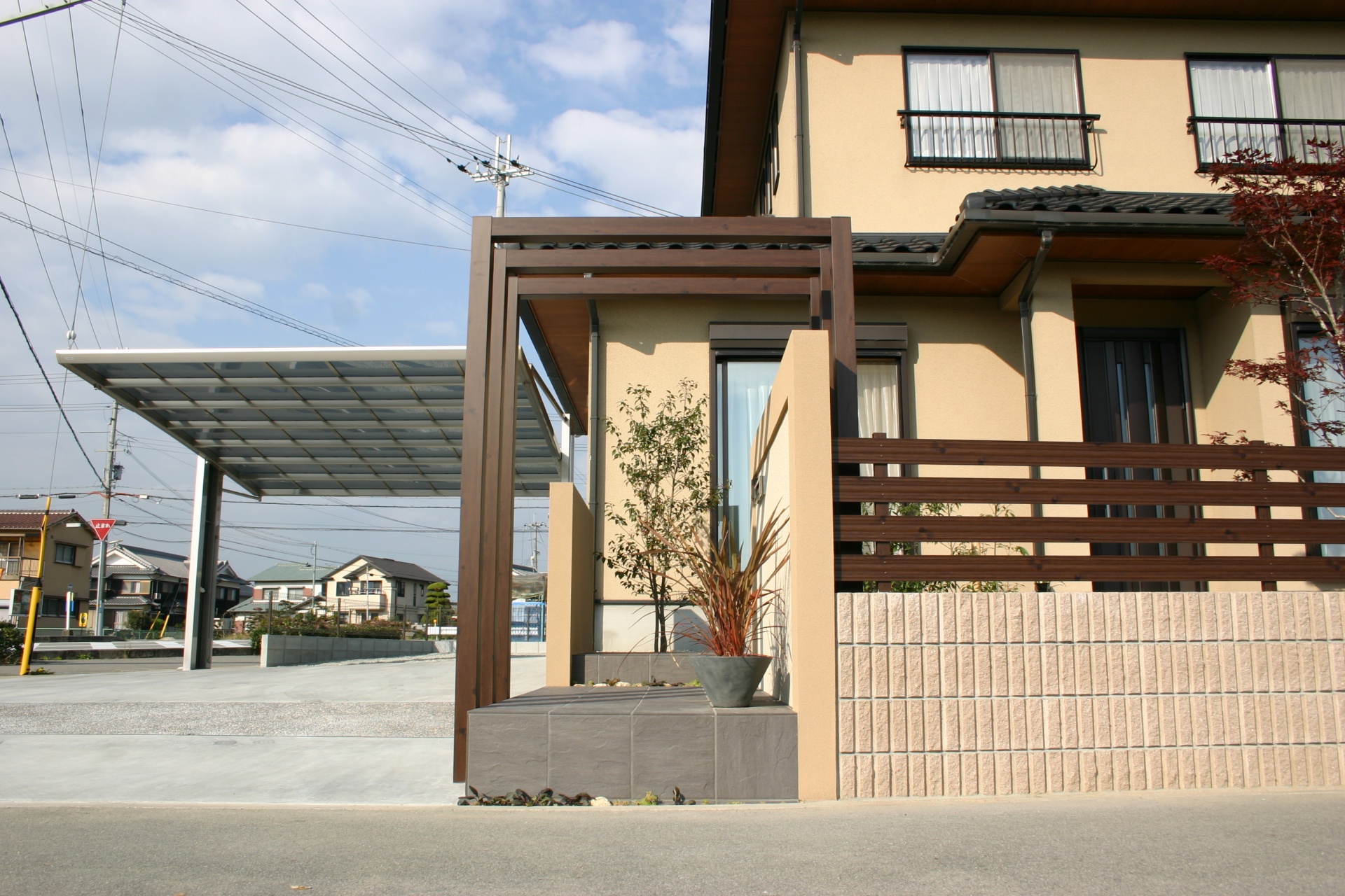 施工実績 建物と調和した門周り|アーチで空間をつなぐ 姫路市H様邸 和の雰囲気のある建物の姫路市H様邸。 駐車スペースはオープンに、門周りはセミクローズをご希望されていました。 カーポートは出入りの事を考えると2本足のマイポートを設けました。 門周りは建物ラインで仕切ったのですが敷地の広さ、建物のボリュームも考慮し門周りに3本のアーチをかけ繋がりを持たせました。 全体的にベージュなど落ち着いた色目でまとめ、アクセントにこげ茶で引き締めます。 赤葉のノムラモミジやニューサイランがより一層建物との調和を引き出してくれています。 フレーム効果で奥行きを感じる門周りに