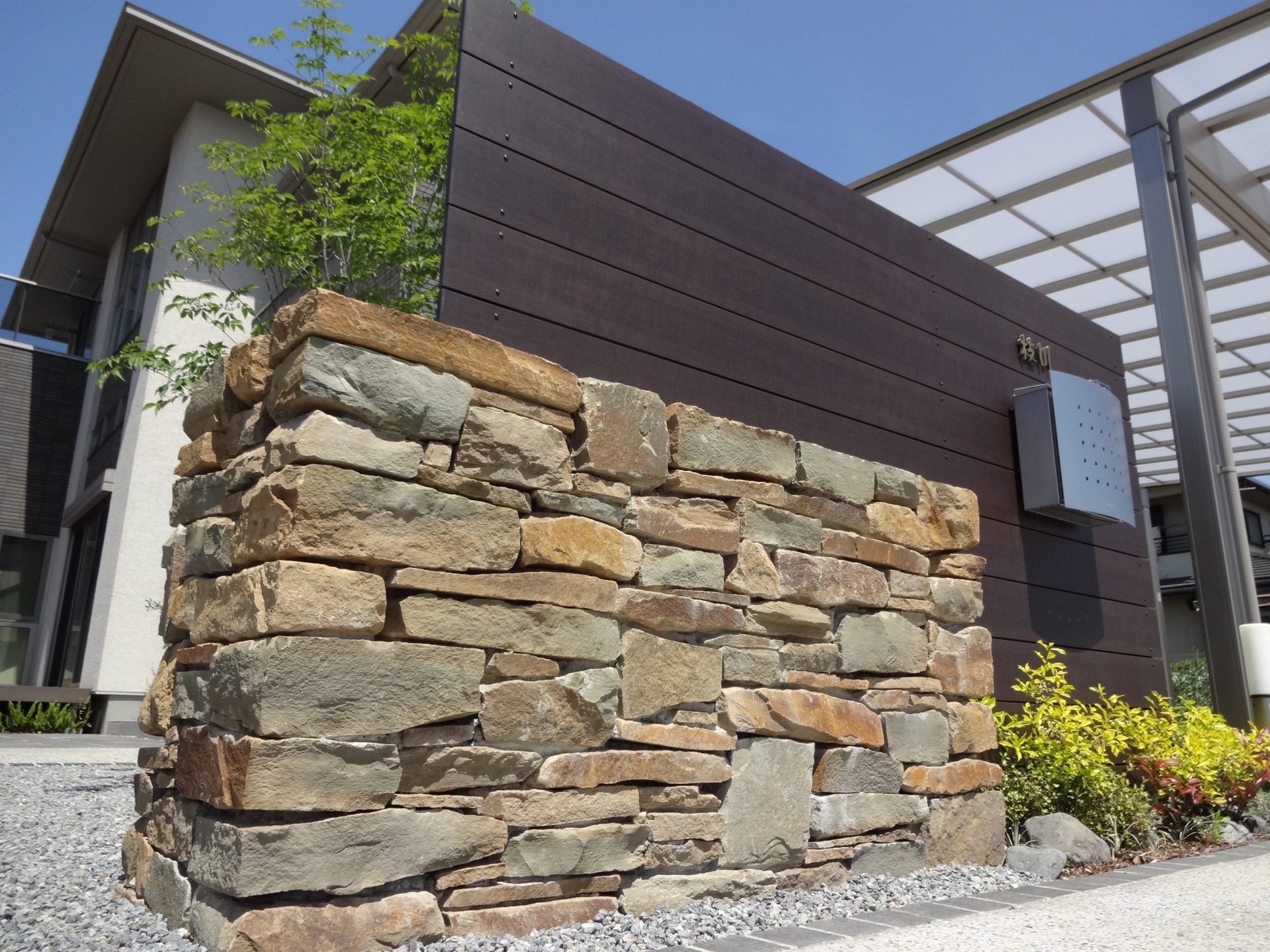 施工実績 姫路市新築外構 アルデンヌウォーリングで重厚感のある門回り エッジラインが美しい姫路市E様邸建物のボリュームに負けない存在感のあるアルデンヌウォーリング積みの門柱建物の特徴を門柱にもリンクするように角の石使いには気を配りました自然石コバ積み特有の深みのある色合いがナチュラル感を醸し出してくれます植栽との相性も良く建物に合った落ち着いた雰囲気のお庭が完成しました 木目調の板材を隙間を小さくして取付けることで板塀としての趣があります シンボルツリーにはアオダモを選びました アルデンヌウォーリングを空積み仕様で積み上げ石の持つ豪華さや上質な感じが家の顔となっています