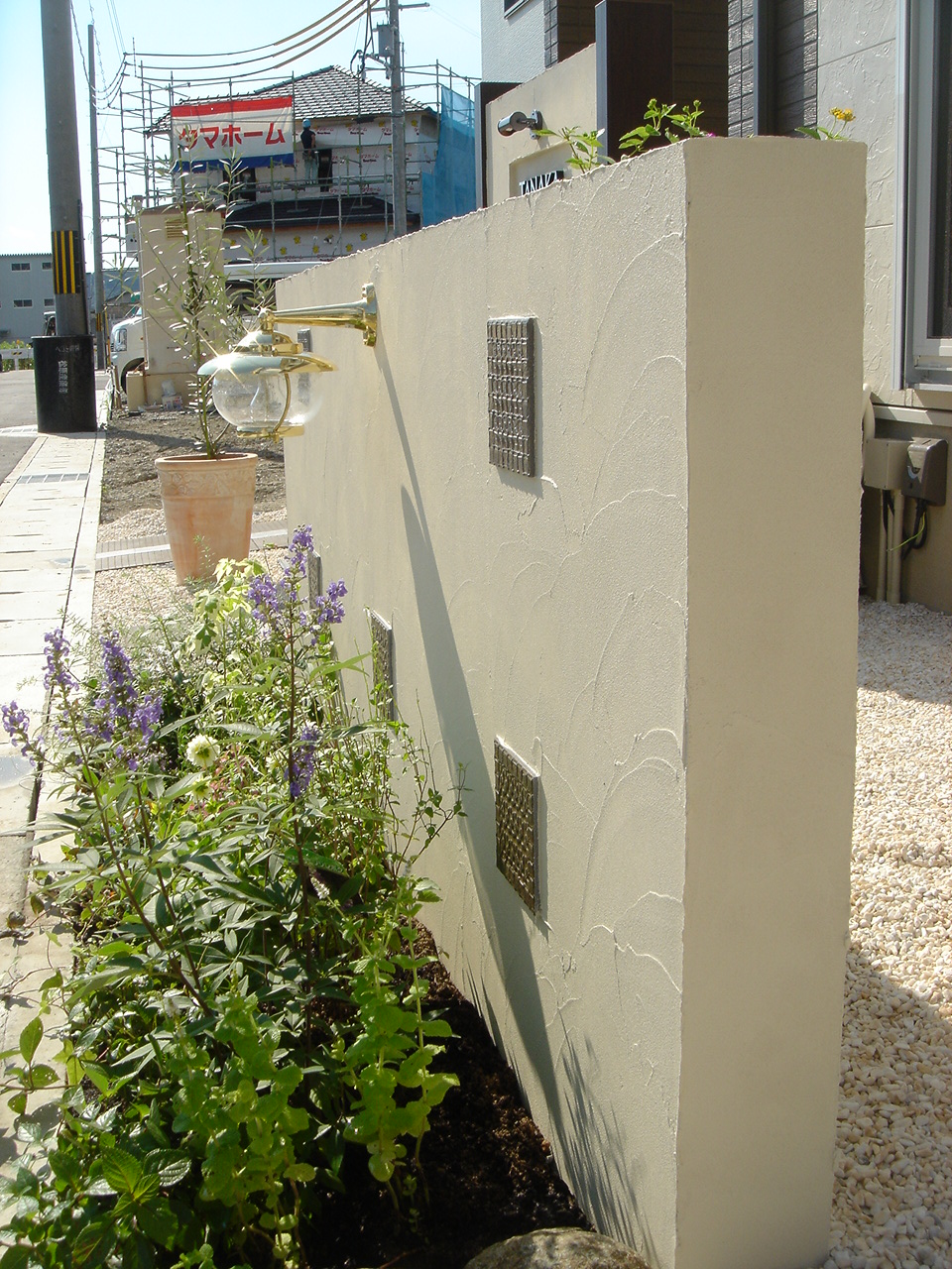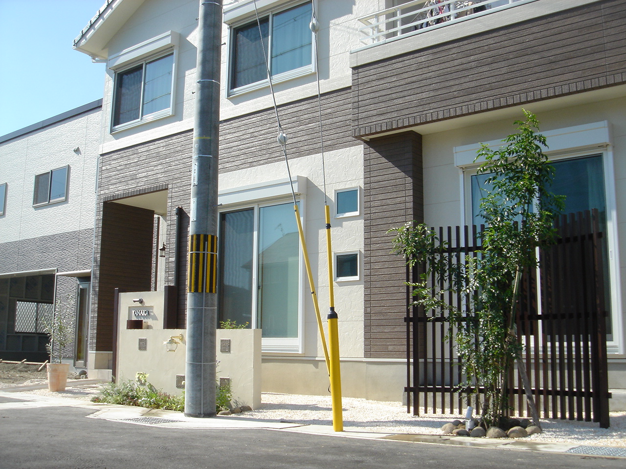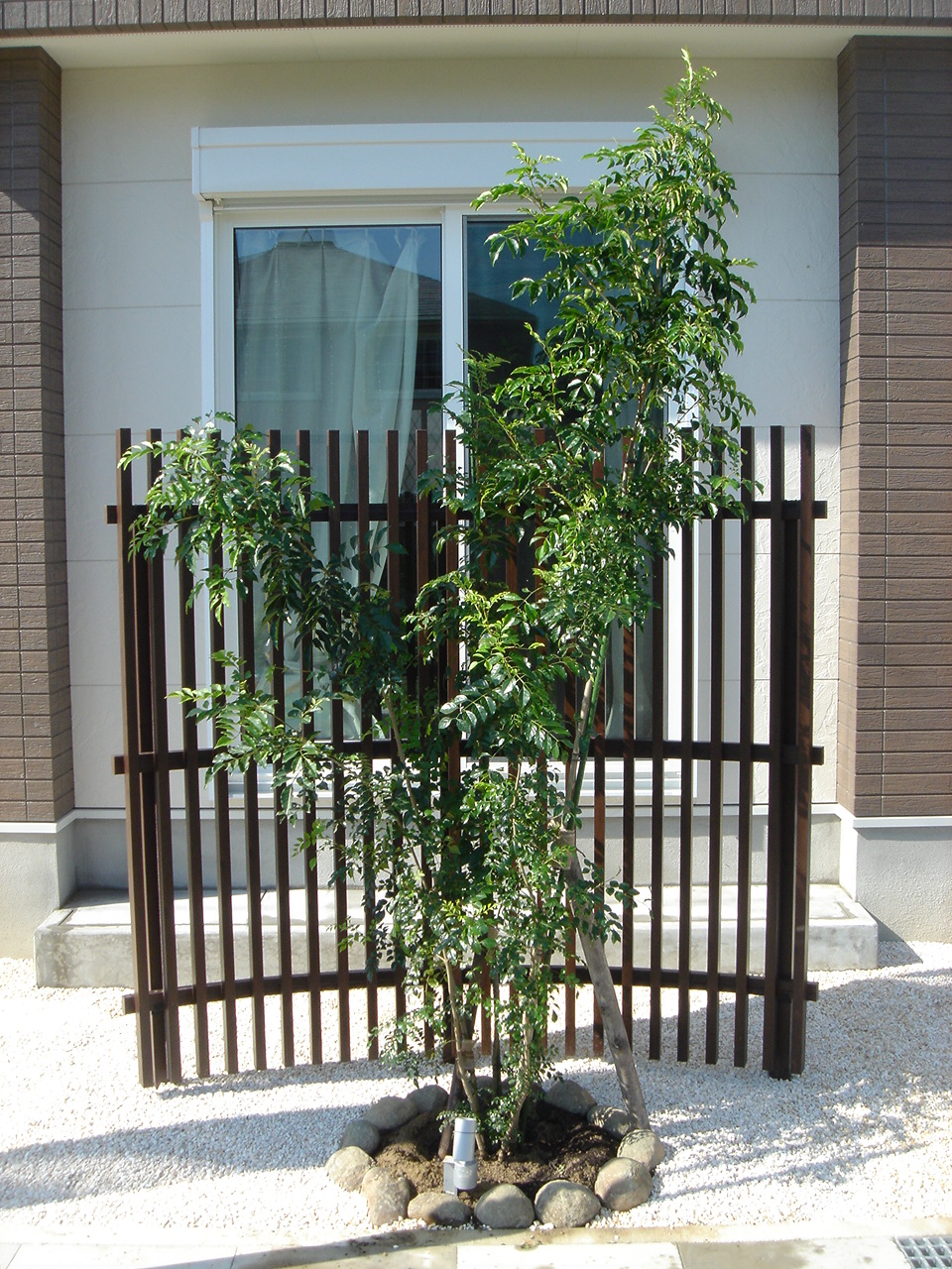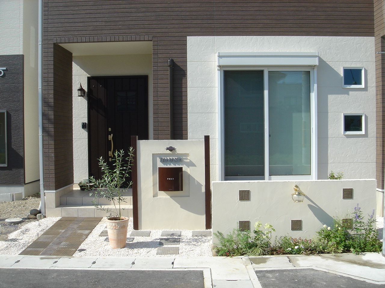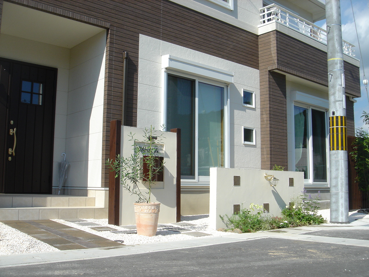 施工実績 ベージュとこげ茶のコントラスト 姫路市T様邸 建物のシンプルな色目に合わせ、エクステリアでも茶系+白系の色目で統一しました。 2枚の塀を前後に配置し、高さを変え奥行感を演出しました。 門柱は四角にニッチ加工しアルミ柱で挟み込みすっきりとしたイメージに。 リビング前にはアール型の縦格子スリットフェンスに常緑シマトネリコ。 外内どちらからも見て楽しめます。