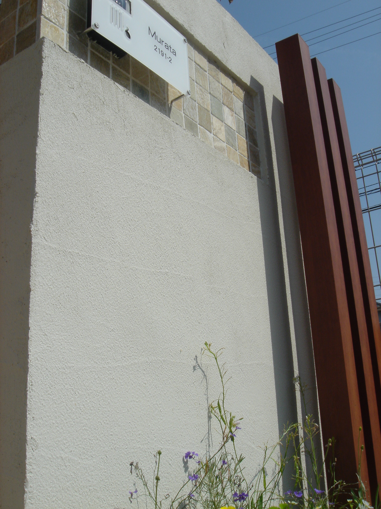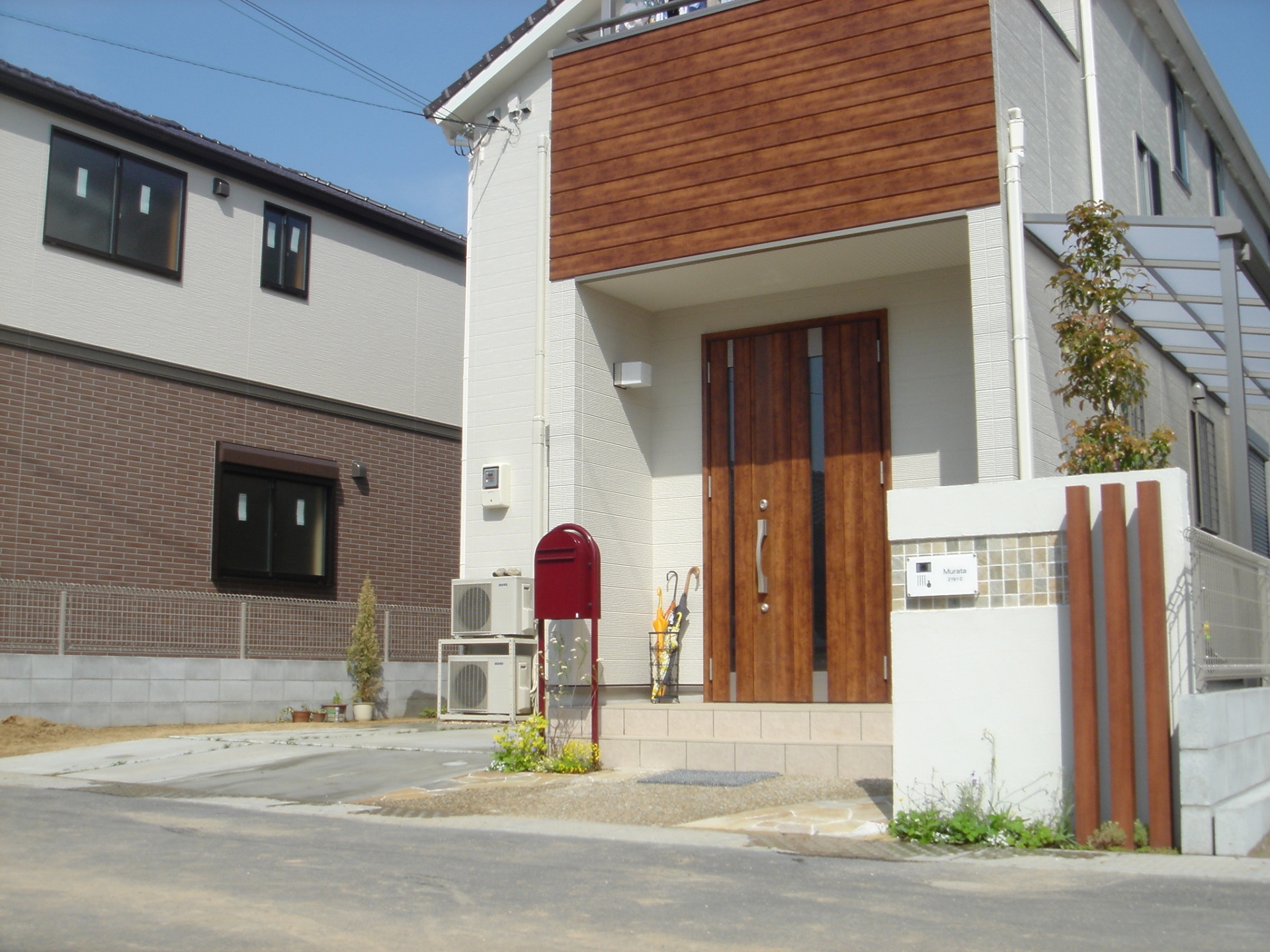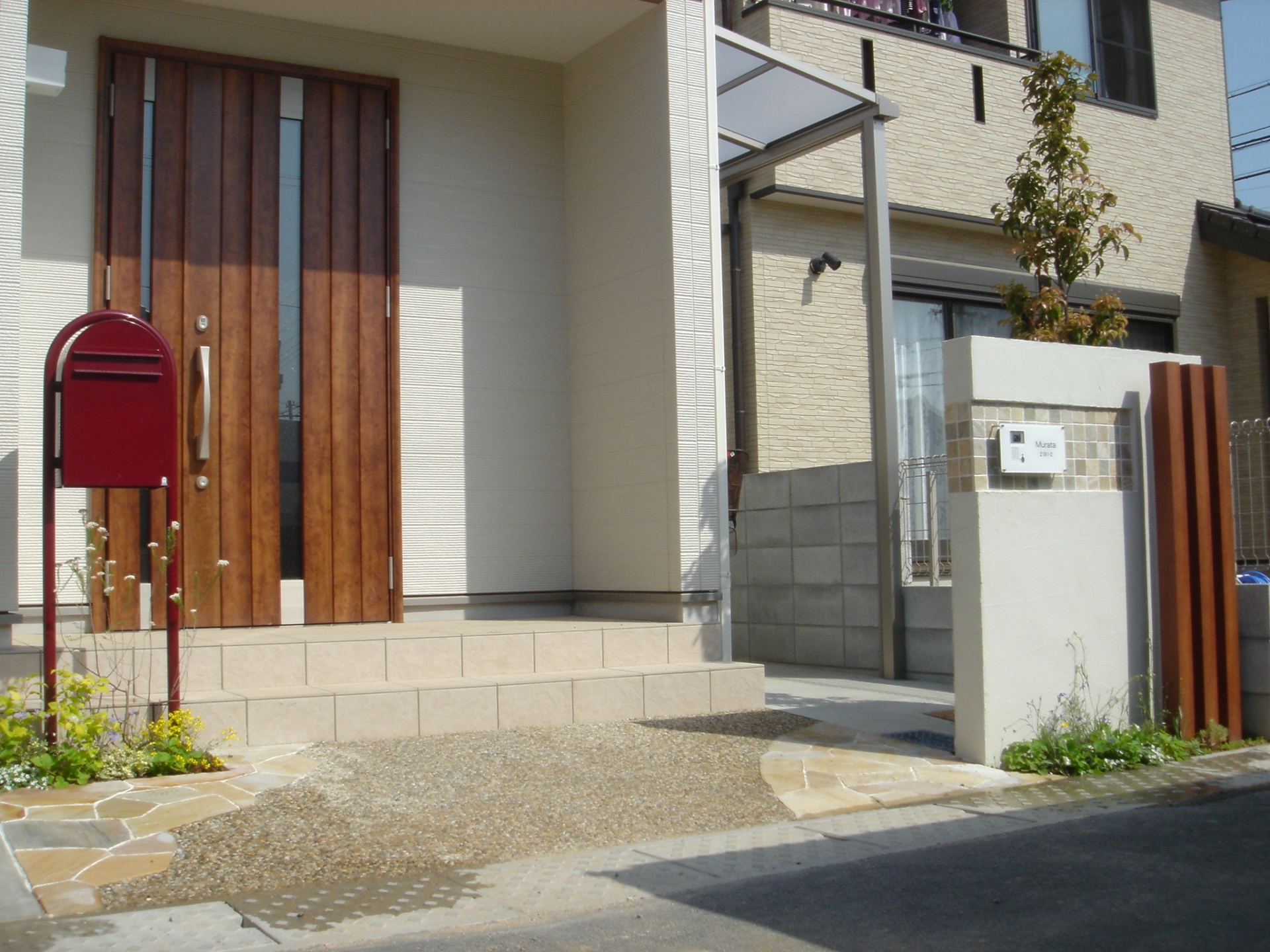 施工実績 鮮やかなボビポスト(ボルドー) 加古川市M様邸 バルコニー、玄関扉の木目調が印象的な加古川市M様邸。 門柱にはスクエアストーンでアクセントを付け建物に使われている 木目カラーに合わせてエバーアートウッドを立てました。 ポストは白の外壁に映えるボンボビ(ボルドー)を使用しました。 植栽、草花も門柱周り、ポスト足元に植え可愛く仕上がりました。