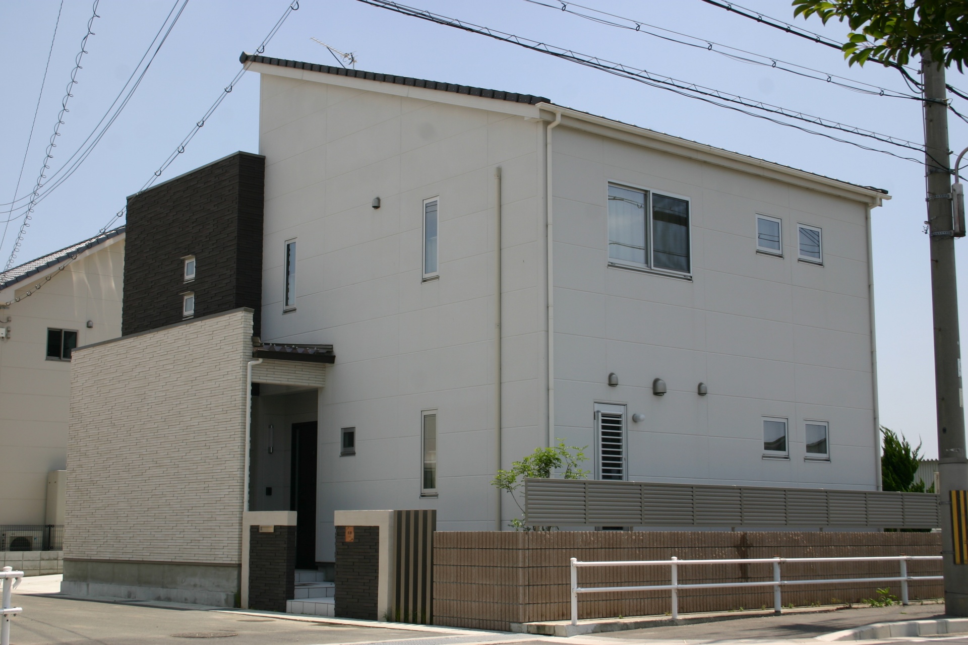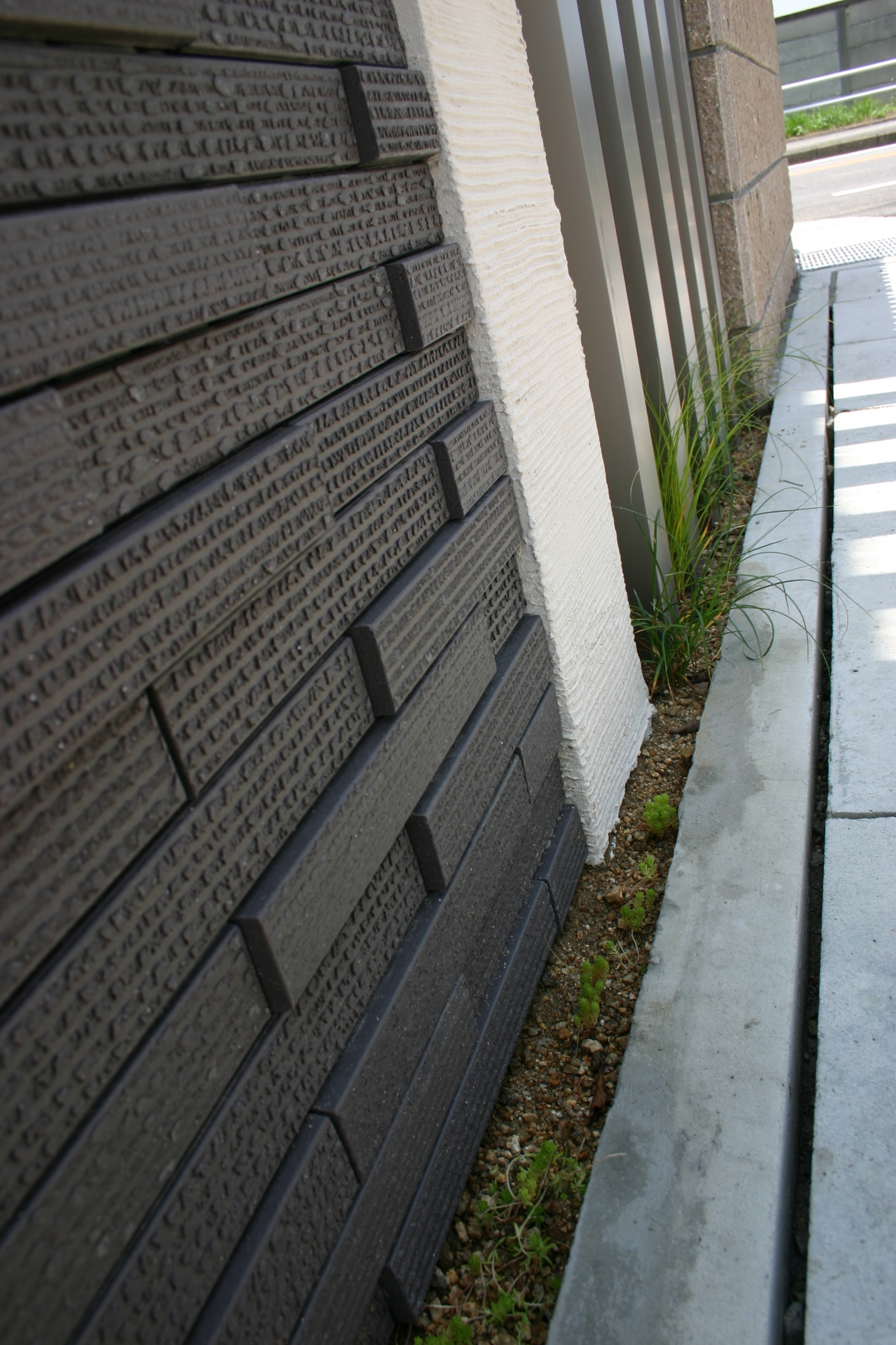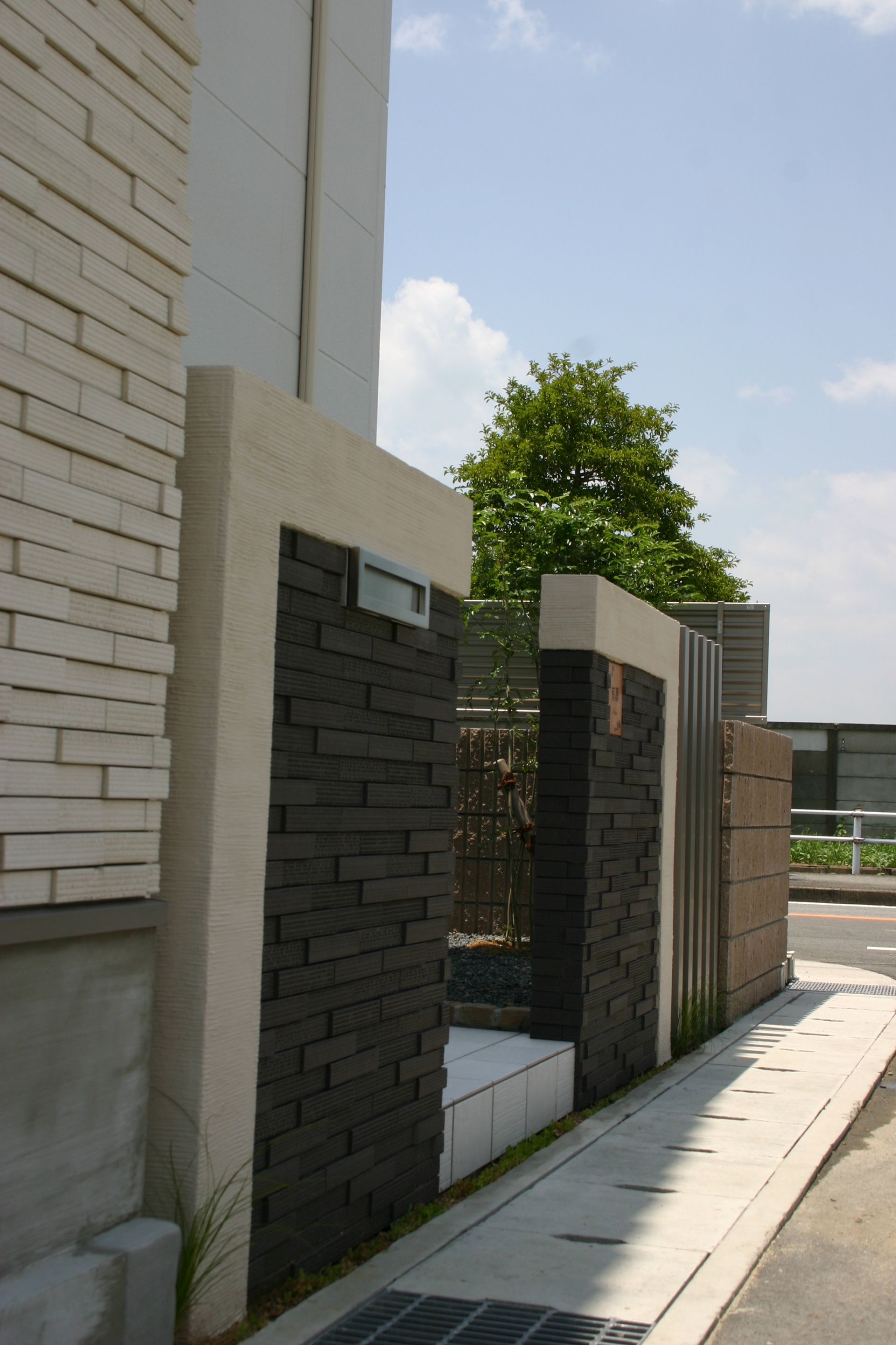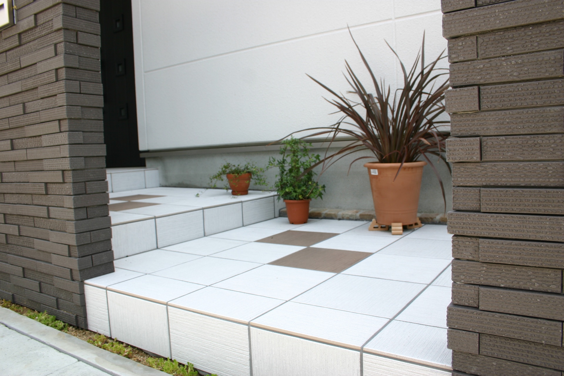 施工実績 デザインタイルでシンメトリーに 太子町A様邸 ツートンカラーとシャープで直線的なラインの印象的な建物の太子町A様邸。 白い部分が多かったので、門周りに濃い色で仕上げ、全体的にまとまりのある外構にしました。 門柱横のステンカラーのスリットフェンスがシャープなラインを強調しています。