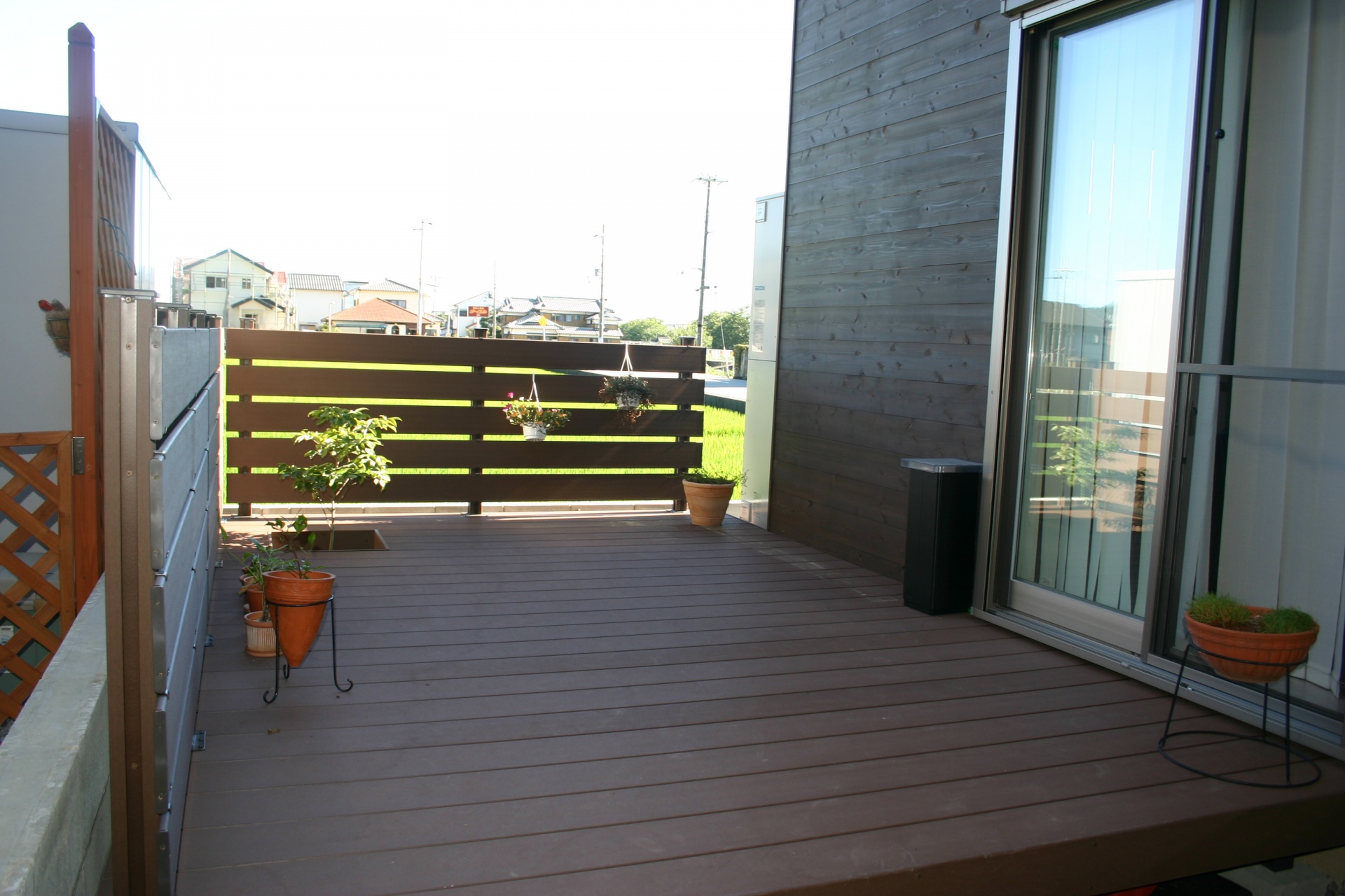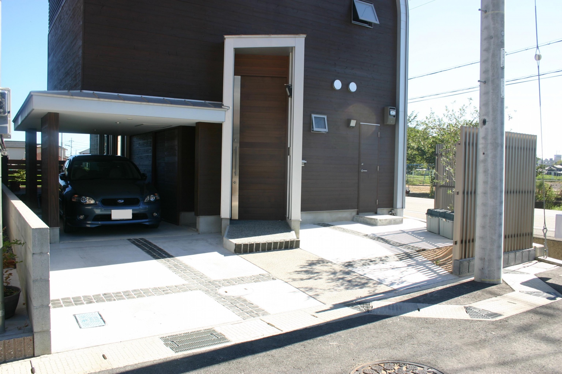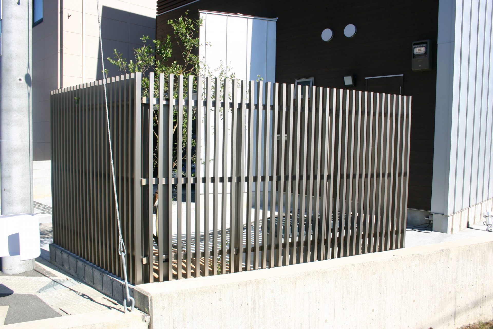 施工実績 デザイナーズハウスにデザイン格子 太子町Y様邸 お施主様こだわりのデザインハウス。 極力シンプルにというテーマでエクステリアも考えました。 目隠し兼仕切りには、縦格子のシルバー色のスリットフェンス。 フェンス越しには、ドライなイメージのオリーブを配置しています。 車庫スペース奥のお庭スペースにはウッドデッキでリビングからの繋がりを考慮しています。