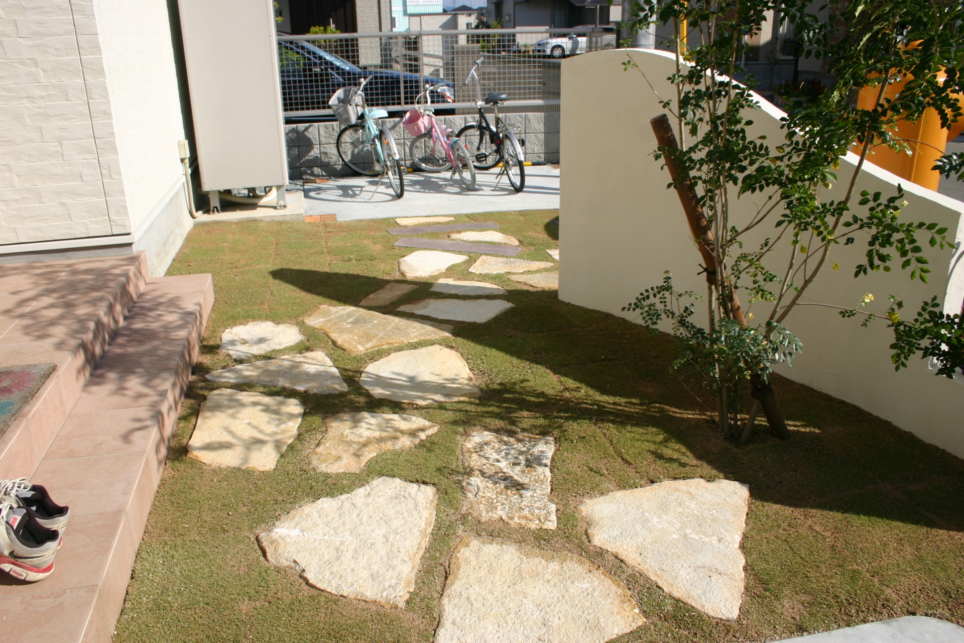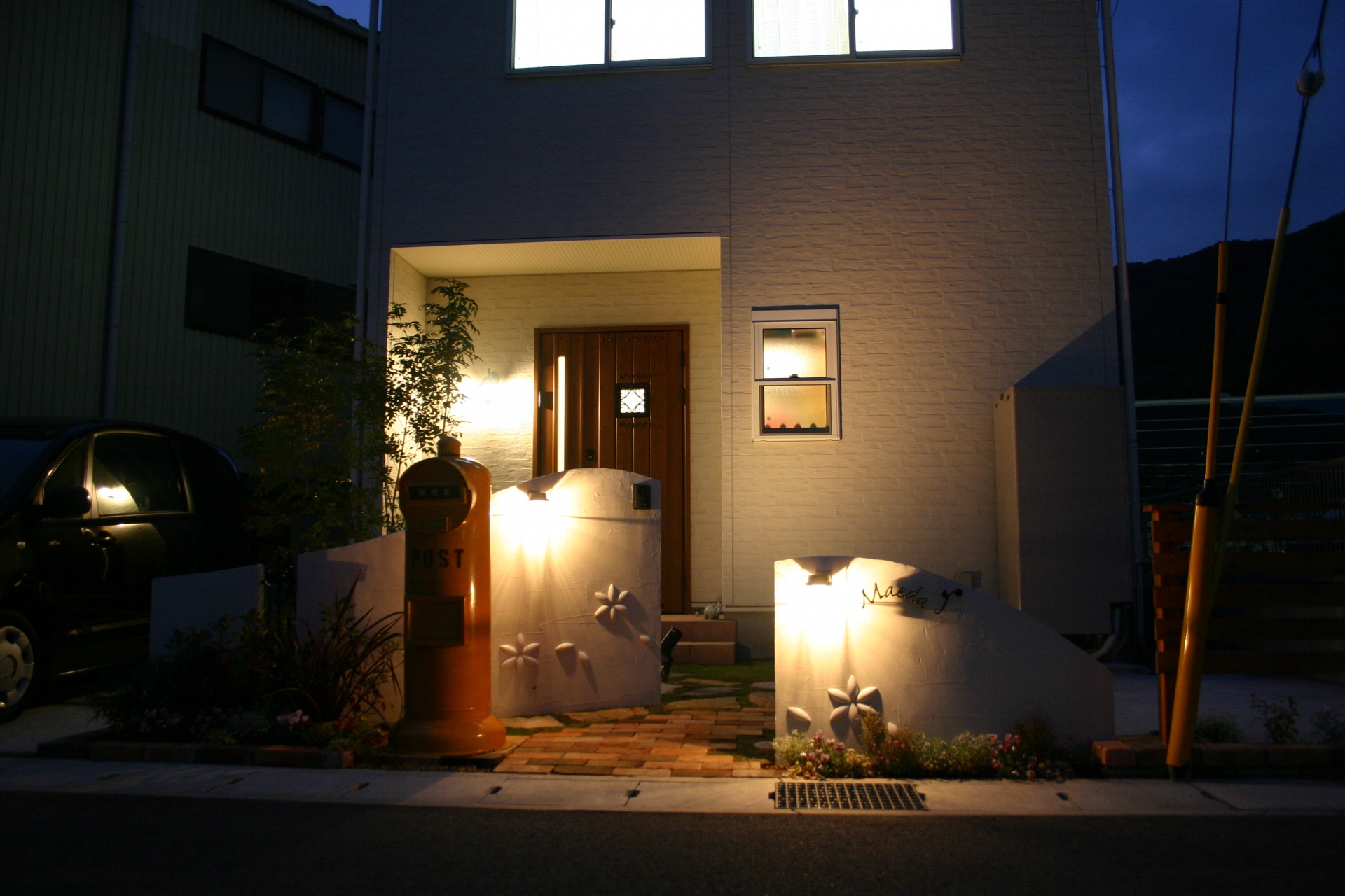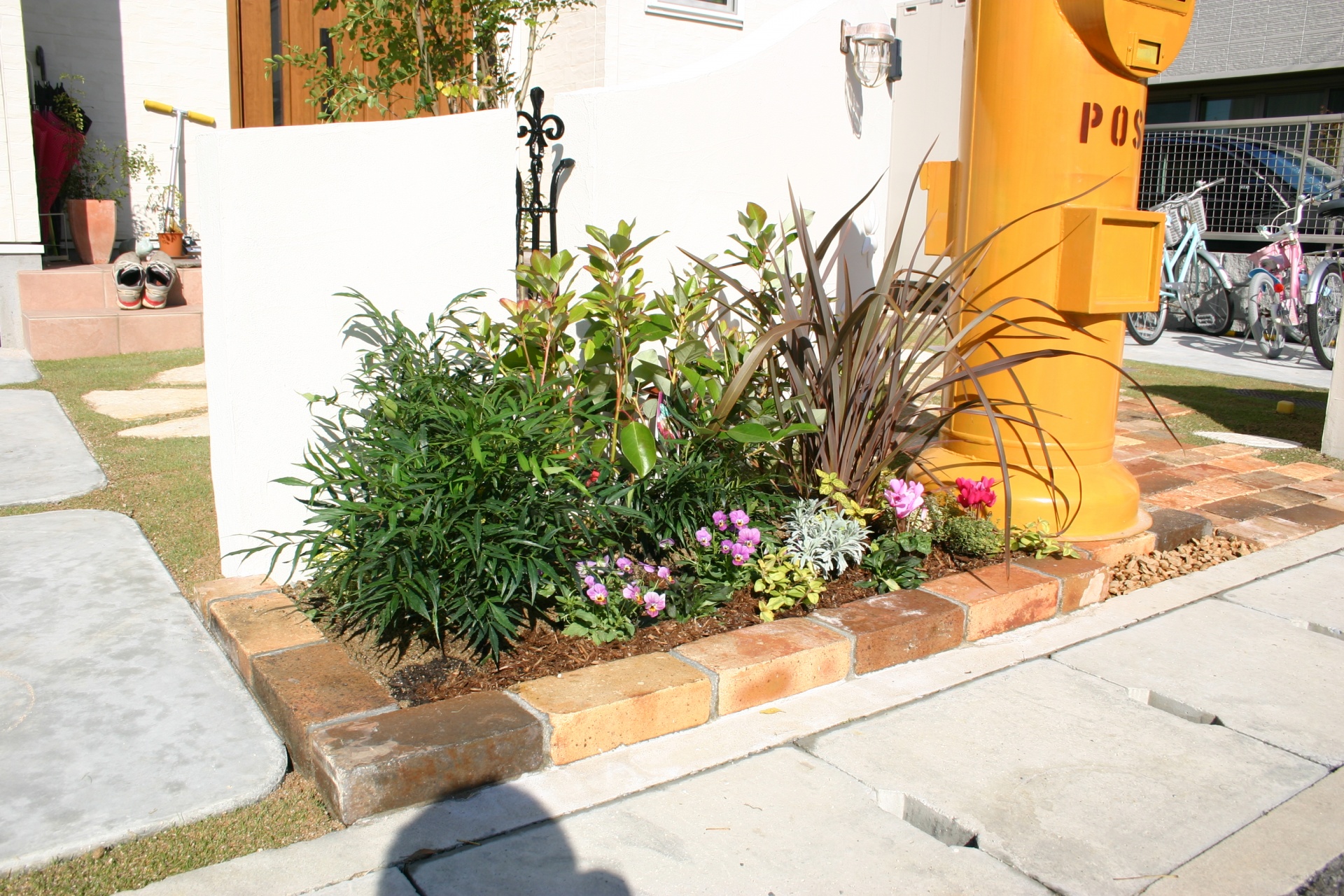 施工実績 DIY|ご家族と共にお庭づくり 姫路市M様邸 DIYが得意な姫路市M様邸。 既設の黄色い「Theポスト」をワンポイントに取り入れ、曲線の門柱で高低差を生かしたデザインに設計しました。 アプローチもラフなイメージでレンガと自然石で仕上げています。 ホワイトウォールの前に銅葉のニューサイランと小花達が門周りを明るく彩ってくれます。 アプローチはビンテージレンガとコッツランドストーンの厚みのある自然石でナチュラルに仕上げました。 車庫のコンクリートは角を落とし丸みを付けています 門柱のワンポイントにさり気なくフラワータイルを貼り付けました。