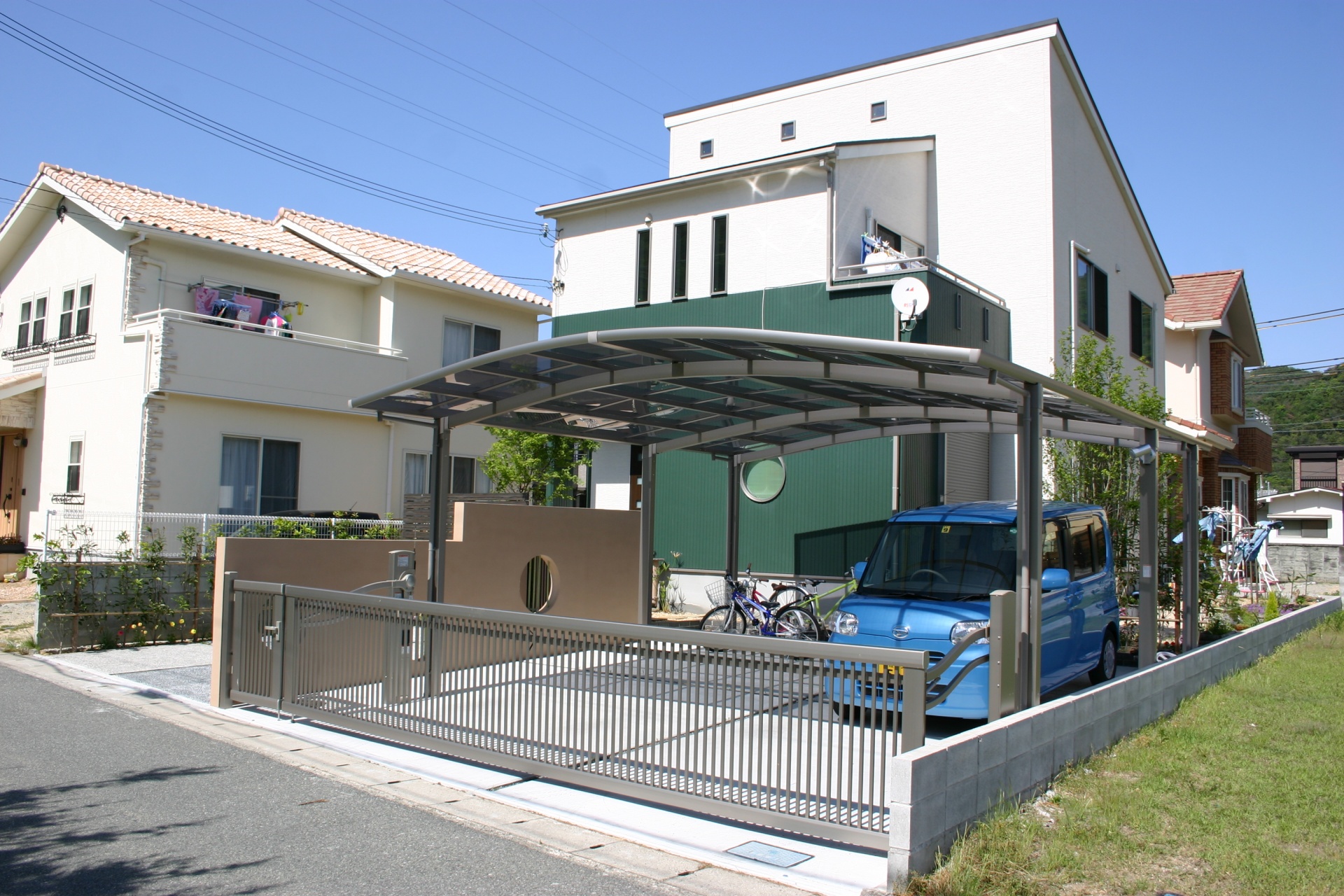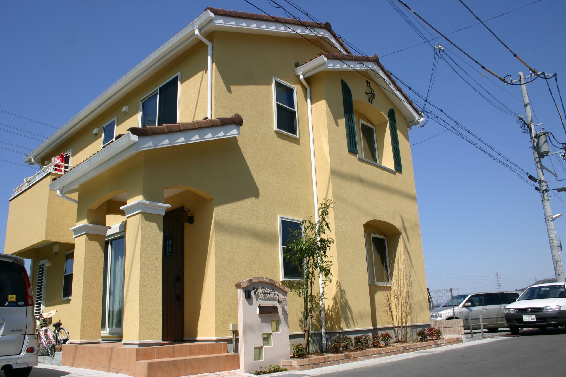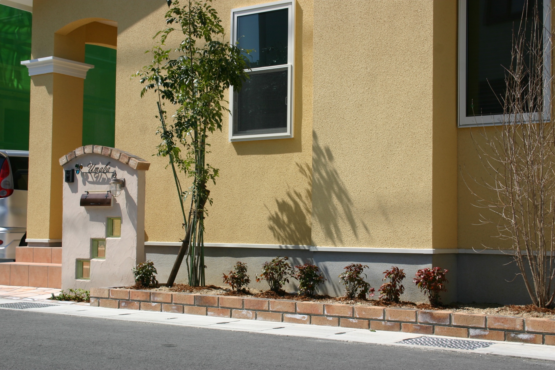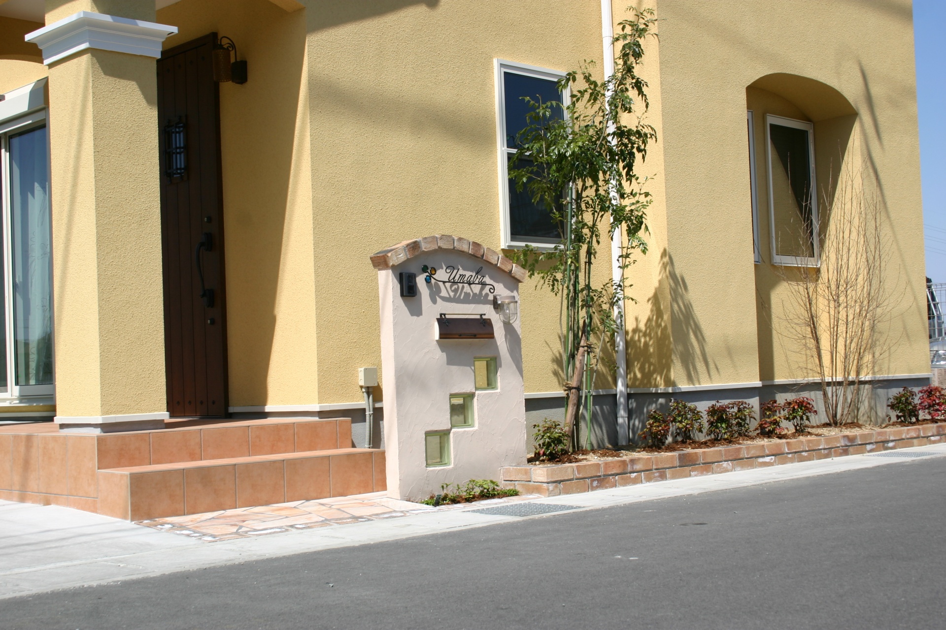 施工実績 ガラスブロックの入った可愛い門柱 姫路市U様邸 ソフトイエローの外壁に淡いピンクの塗壁門柱をデザインしました。 3つのガラスブロックが連なるインパクトのある門柱になりました。 シンボルのシマトネリコの葉が優しくお客様をお出迎えしてくれます。