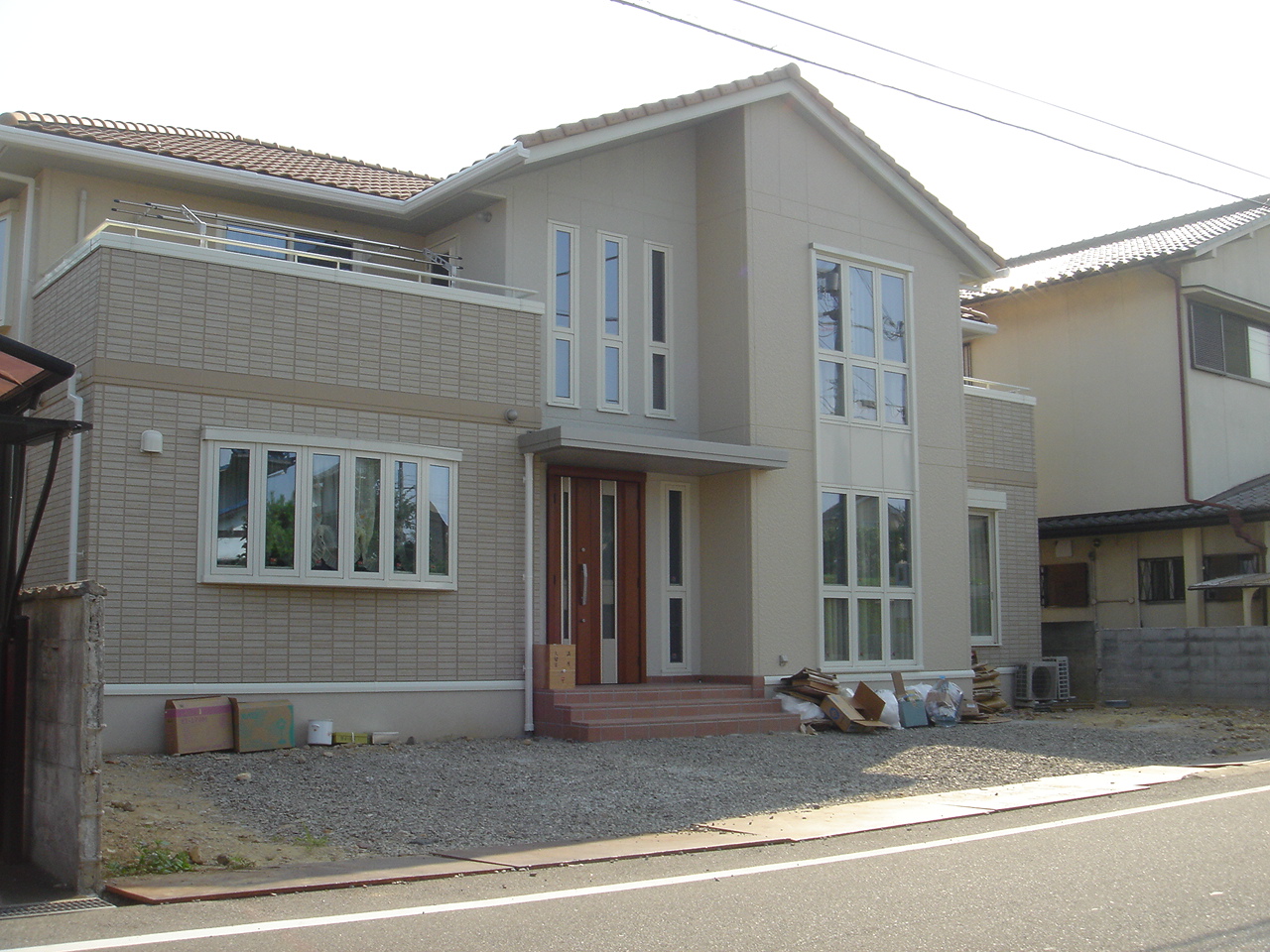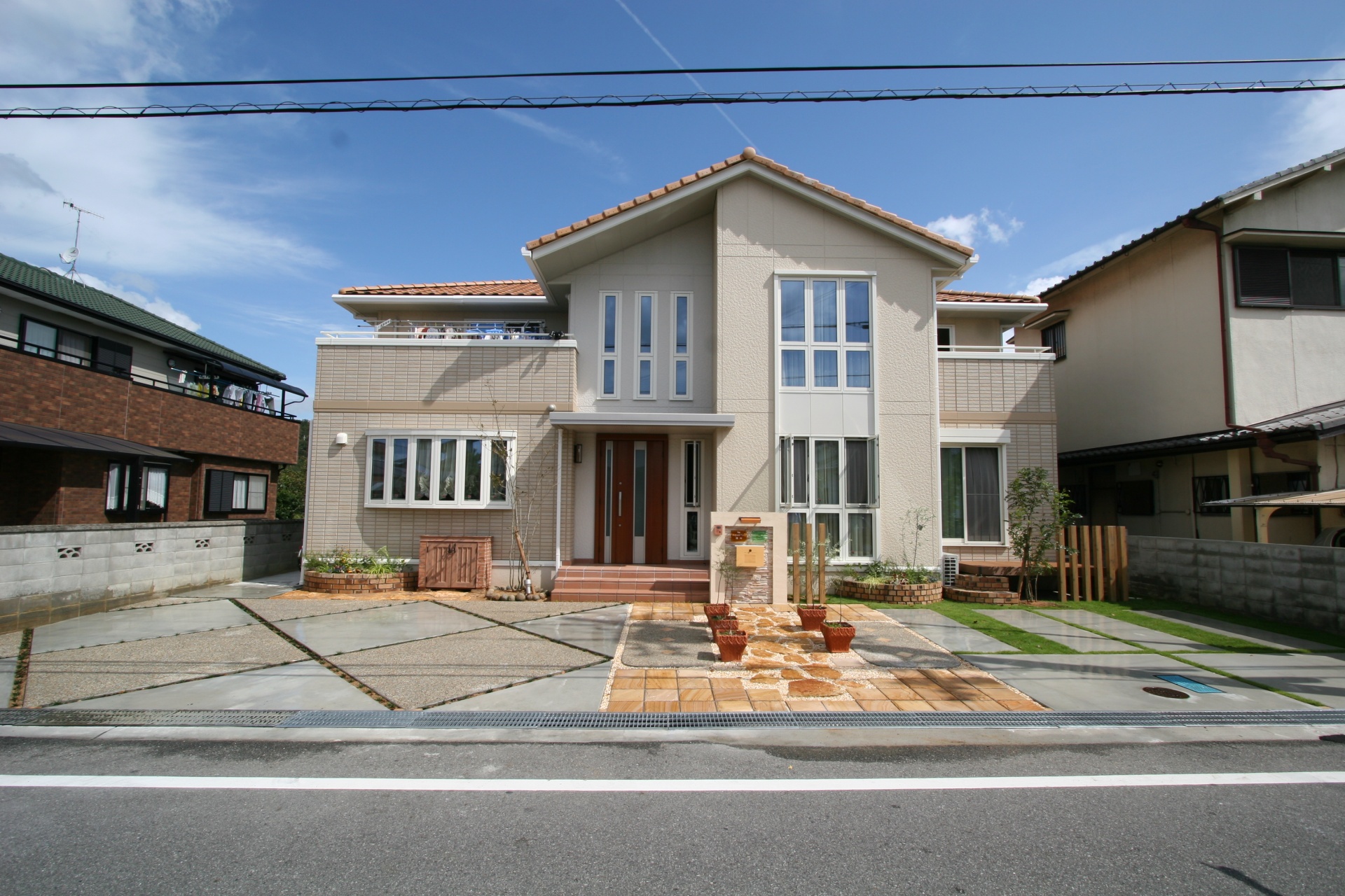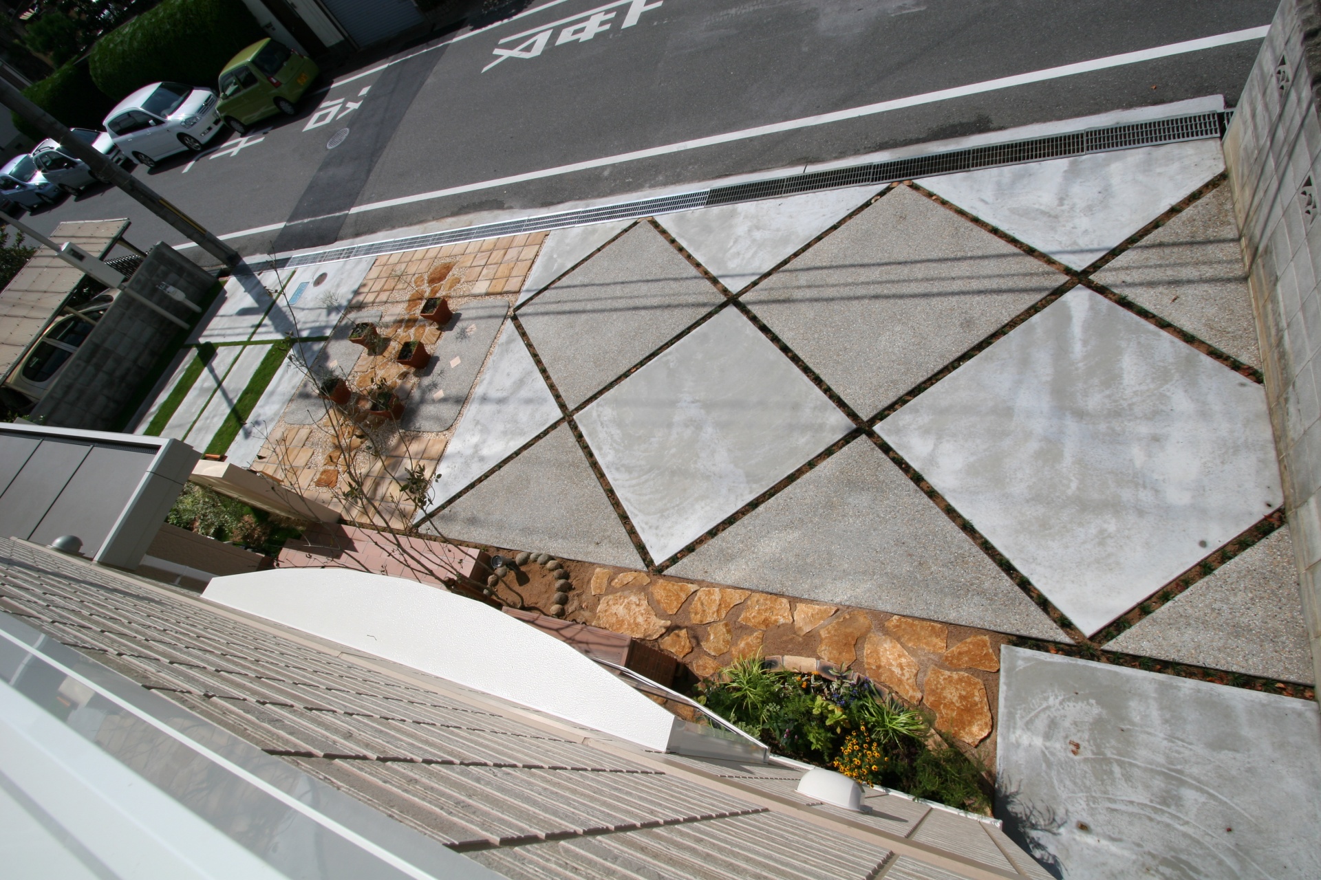 施工実績 開放的なオープンエクステリア 加古川市M様邸 テラコッタ鉢に囲まれた石張りのアプローチの先には門柱があります。 施工前 車庫スペースを5~6台分確保し且つ温かみのあるエクステリア・ガーデンを造ってほしいというお客様からのご希望でした。 道路面より約5.0m分を車庫スペースと建物際に花壇、ウッドデッキ等を設け庭の要素を取り入れました。 アプローチの部分も車を停める際に植木鉢をのければサブの駐車スペースになります。 スペースが限られている為玄関ポーチ前に門柱、それにつながって行くアプローチにはお家の屋根の色と合わせる様に温かみのあるオレンジ系の色目でまとめてみました。 コンクリート等で固めるという冷たいイメージの中にオレンジ系+植栽のグリーンをうまく合わせることにより建物に合った温かみのあるお庭が出来上がりました。 最大6台停まる車庫スペースにコンクリートと洗い出しでデザイン性を持たせました。 開放的なデッキスペースにする為、フェンスは設けずスリット格子と植栽で転落防止に 夜にはオレンジの光が灯ります。 ライトアップ特集はこちらからどうぞ 工事日記はこちらからどうぞ 出窓の下にしっくり納まるカンナミニ