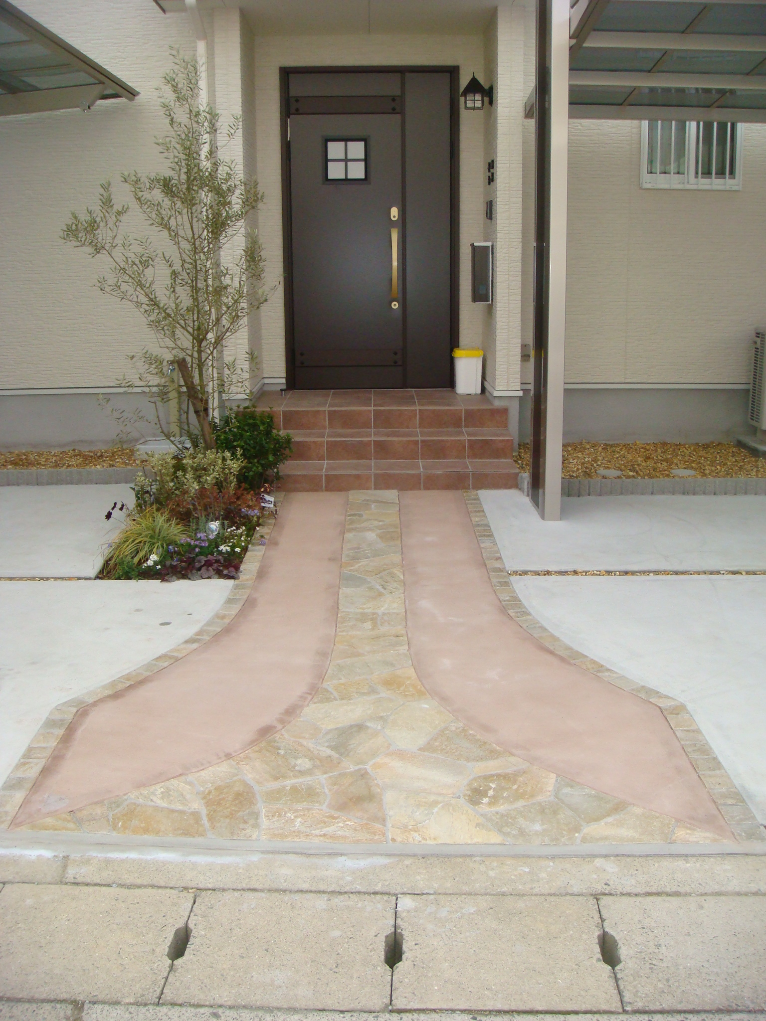 拘りの玄関扉へ続くアプローチ たつの市S様邸
