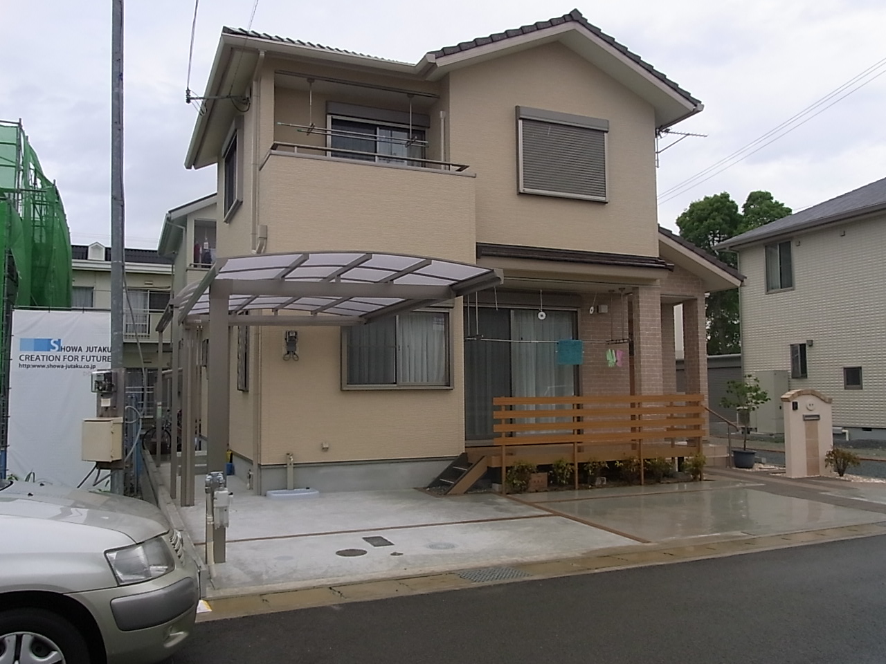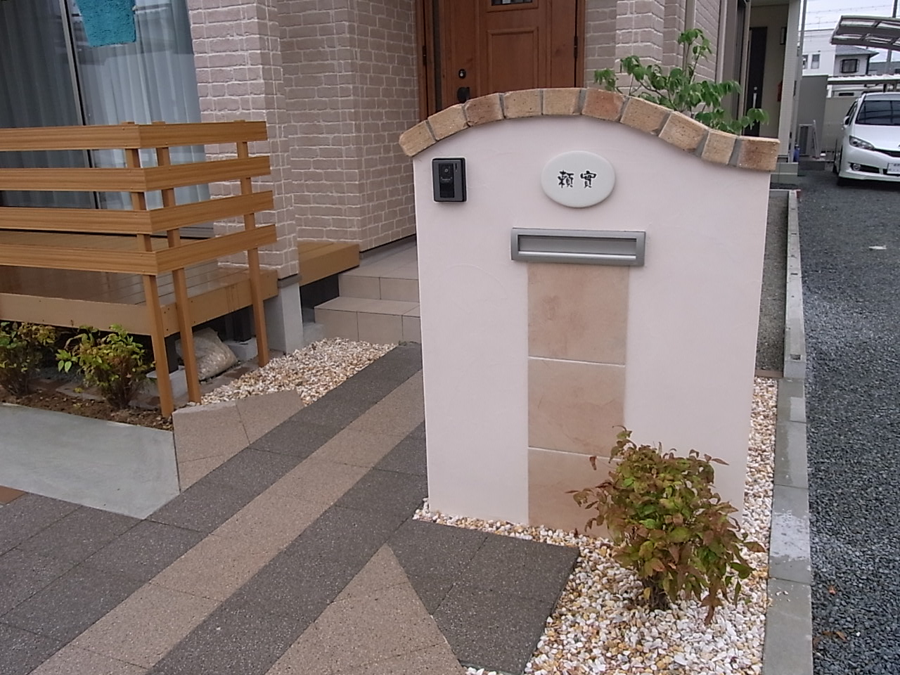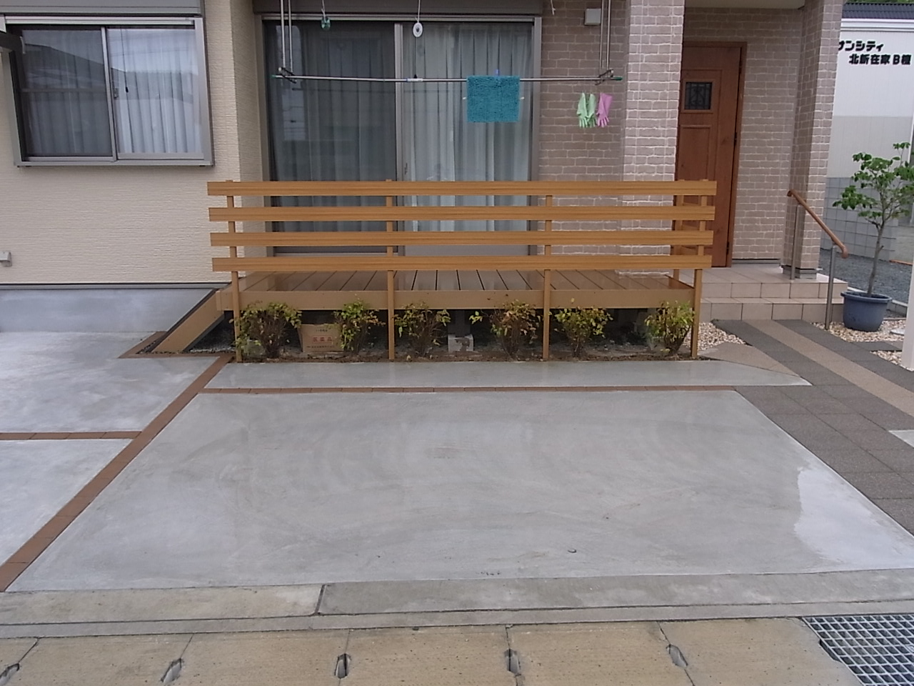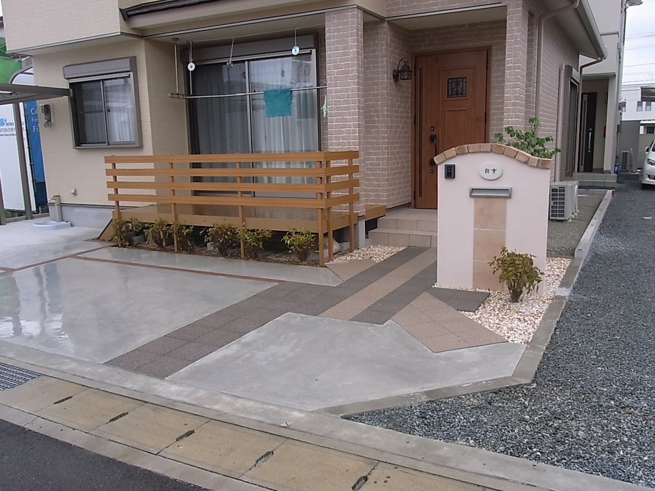 施工実績 交差するアプローチ|レンガ笠木門柱 姫路市Y様邸 ベージュな外壁に合わせ、レンガや木目調を取り入れた優しいエクステリアとなりました。 敷地角が隅切りされており、人の導線に合わせたアプローチが交差するプランになっております。 掃き出し窓から段差なく設けられたウッドデッキで洗濯物が干しやすくなりました。