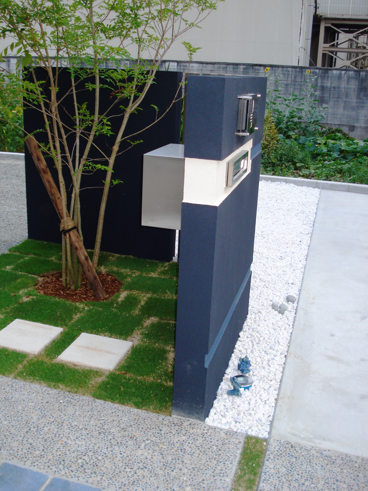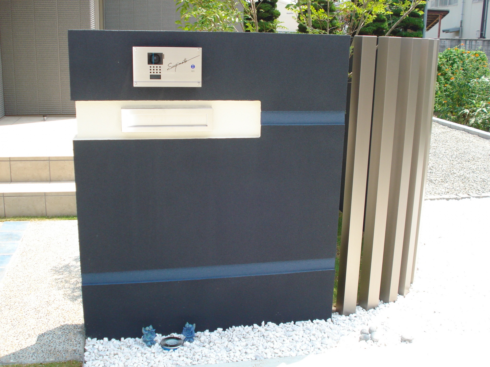 施工実績 黒壁に青の水平ラインがアクセント たつの市S様邸 毎年夏には沖縄を訪れていらっしゃるという大の沖縄付きのS様ご夫妻。 今回は「沖縄」をキーワードに、青い海や真っ白な砂浜、緑の木々などを想像しながらプランニングしました。 広い敷地を海に見立て、土間の目地で波を表現したつもりです。