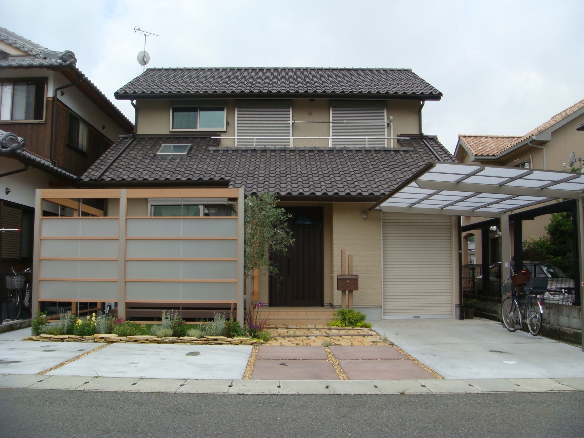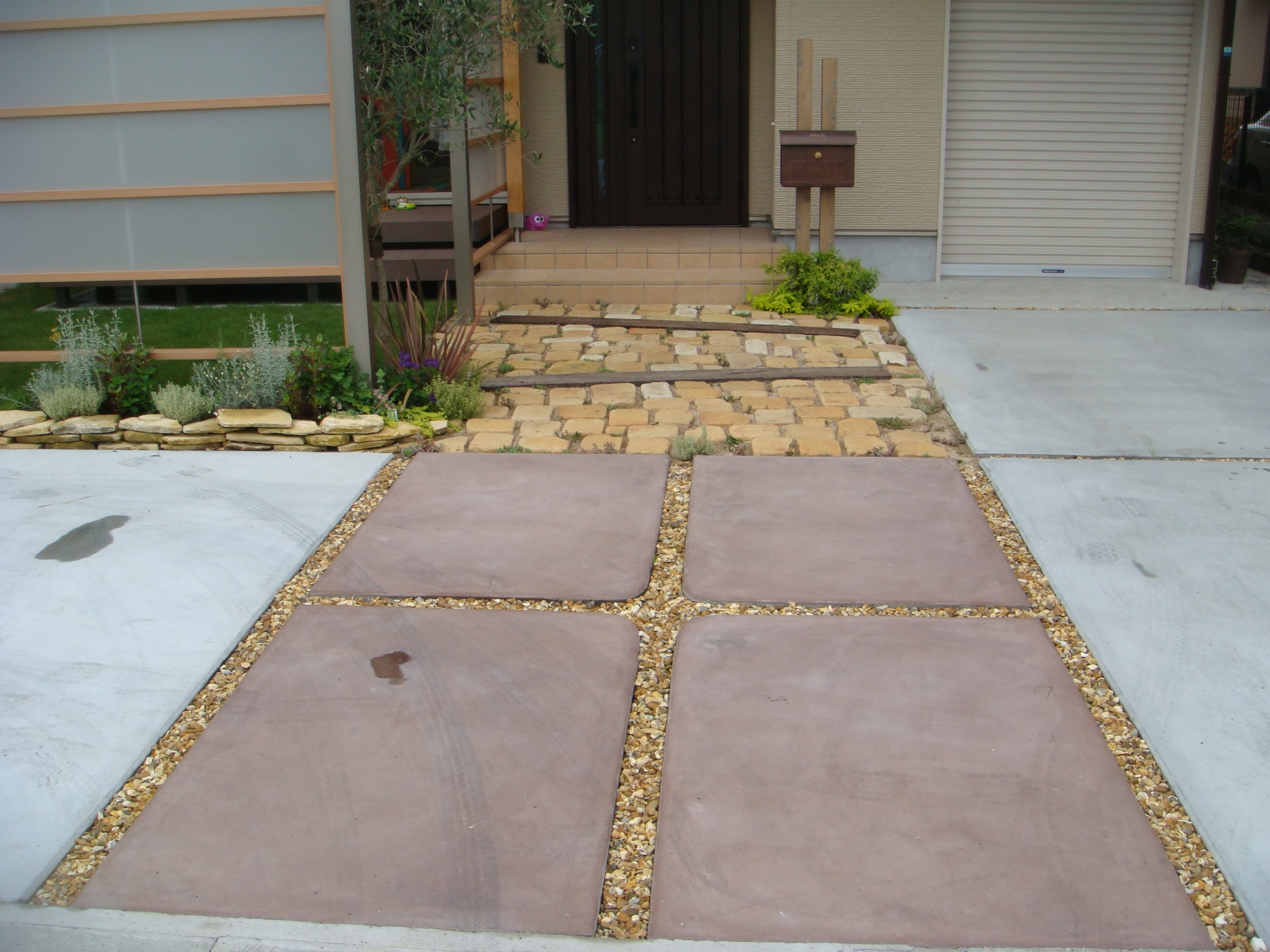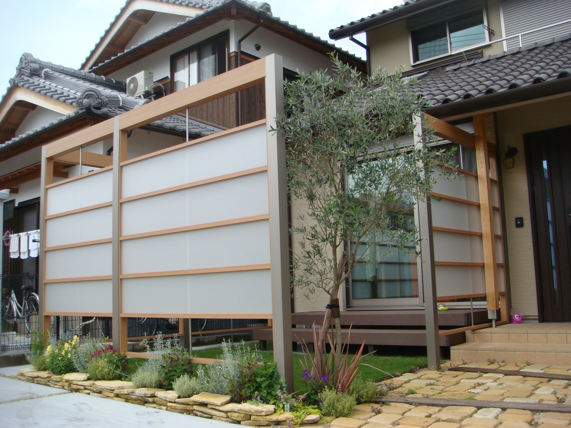 施工実績 空間を間取るアイテム|プラスG 相生市I様邸 前面道路より、リビング丸見えでカーテンが開けれないお悩みをお持ちでした相生市I様邸。 そんな悩みをプラスGで解消。 1台の車庫スペースも道路面より縦列でとることで、芝生の広がるお庭も出来ました。 アプローチなどは少し古びたイメージのものがお好みでしたので、 経年変化でより雰囲気が出る異形のアンティークレンガ敷き。 目地は土で仕上げ、隙間にはセダム。 今後が楽しみです。 風と採光を取り込むことができる目隠しフェンス。 下の隙間からは花壇のハーブ類が外内、どちらからも目、香りを楽しませてくれます。 プラスGでほぼ三方囲うことでプライベート空間はしっかりと確保できました。 ウッドデッキは大きなはきだし窓から芝生のお庭への架け橋