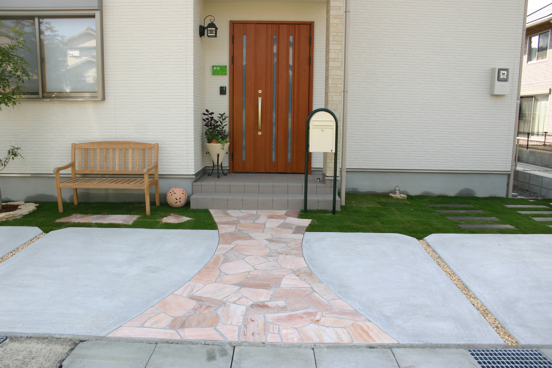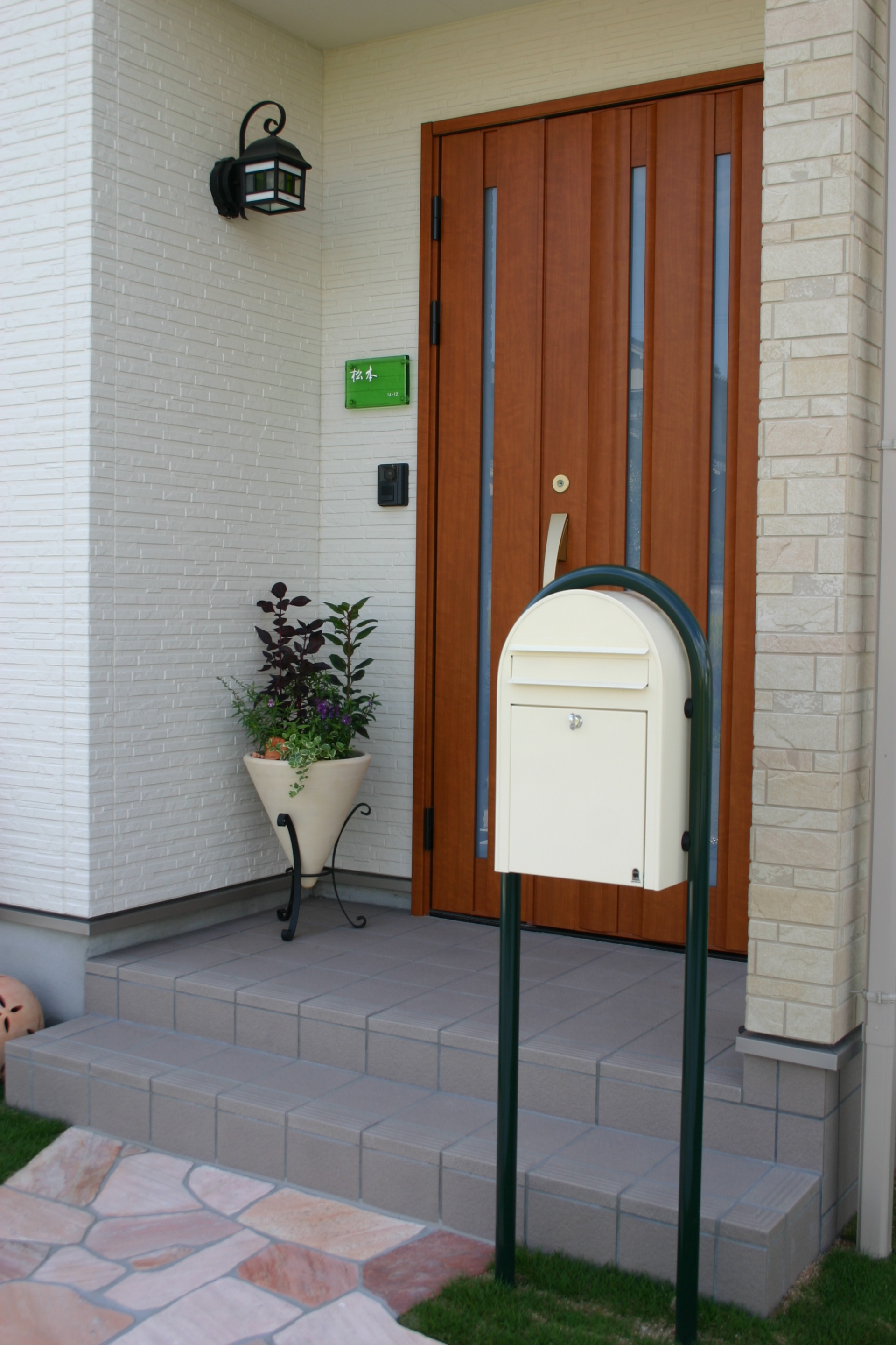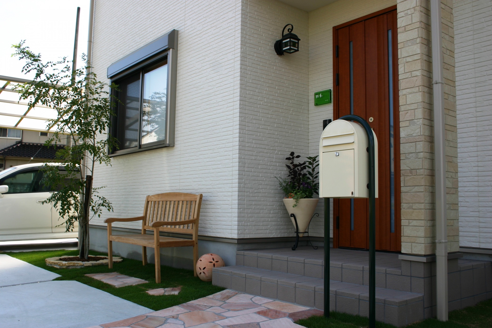 施工実績 緑が印象的なエクステリア 相生市M様邸 スッキリとしたシンプルな外構をご希望だったM様。 お好きな色が「グリーン」ということで、ポイントに深~い緑色のフレンチグラスの表札、ポストボビのポールを使用しました。 イチオシは木製のベンチです。 ピンク系でまとめた自然石乱張りアプローチ デザイン性のある独立ポスト:ボビ(フィンランド製) 玄関先に秋を感じる寄せ植えをディスプレイ