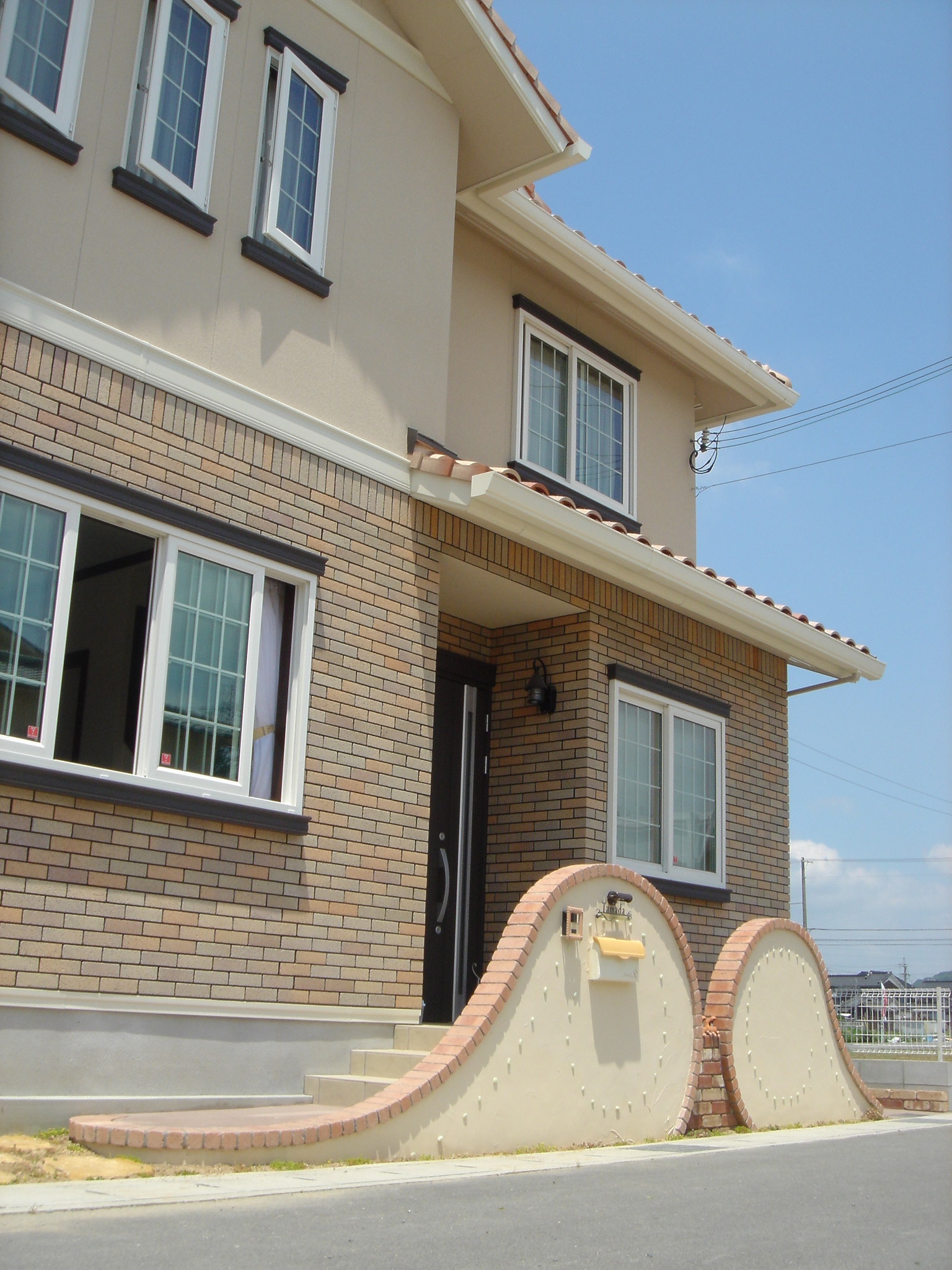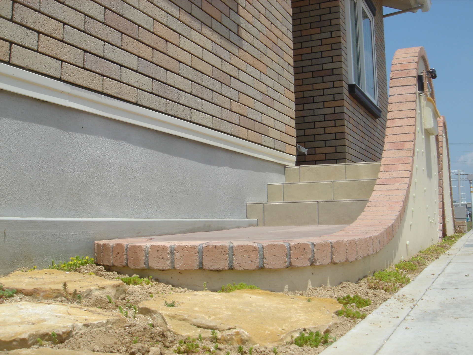 施工実績 門柱とステップを繋げるレンガ笠木 姫路市T様邸 可愛いイメージで門周りをデザインしています。 大きさの違う壁が玄関前のアクセントとして、道行く人を振り向かせます。 繋がりを持たすために、レンガ笠木がステップまで延びてきています。 門柱~ステップへと笠木レンガが繋がっています ステップ下の飛石周りにはセダムを植え込みました