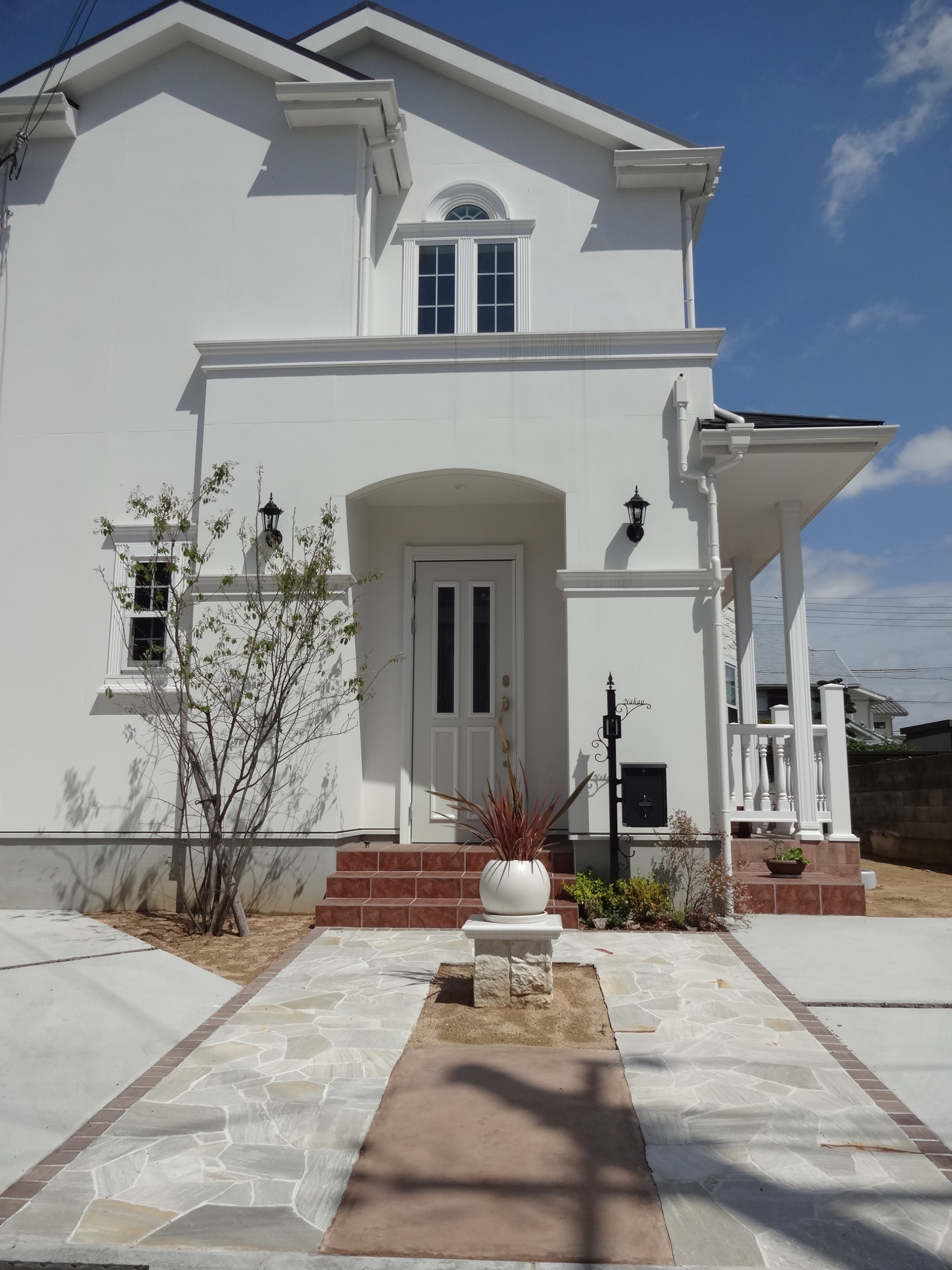 施工実績 姫路市新築外構 ピンコロで縁取られた白の自然石アプローチ 真っ白な外観に尖がり屋根が印象的な姫路市N様邸外構にも白を取り入れたエレガントなイメージをご希望されていました前面道路幅が狭いこともあり、1台分は斜め駐車でご提案させていただきました玄関前のピンコロで縁取られた白の自然石アプローチもシンメトリーなデザインで建物とリンクさせています 斜め駐車をすることでうまれる角の三角地帯は植栽スペースとして見せることで敷地全体に幅を持たせます アプローチの自然石乱張りを白目地で仕上げることで石の色むらが際立ち豪華な印象を受けます