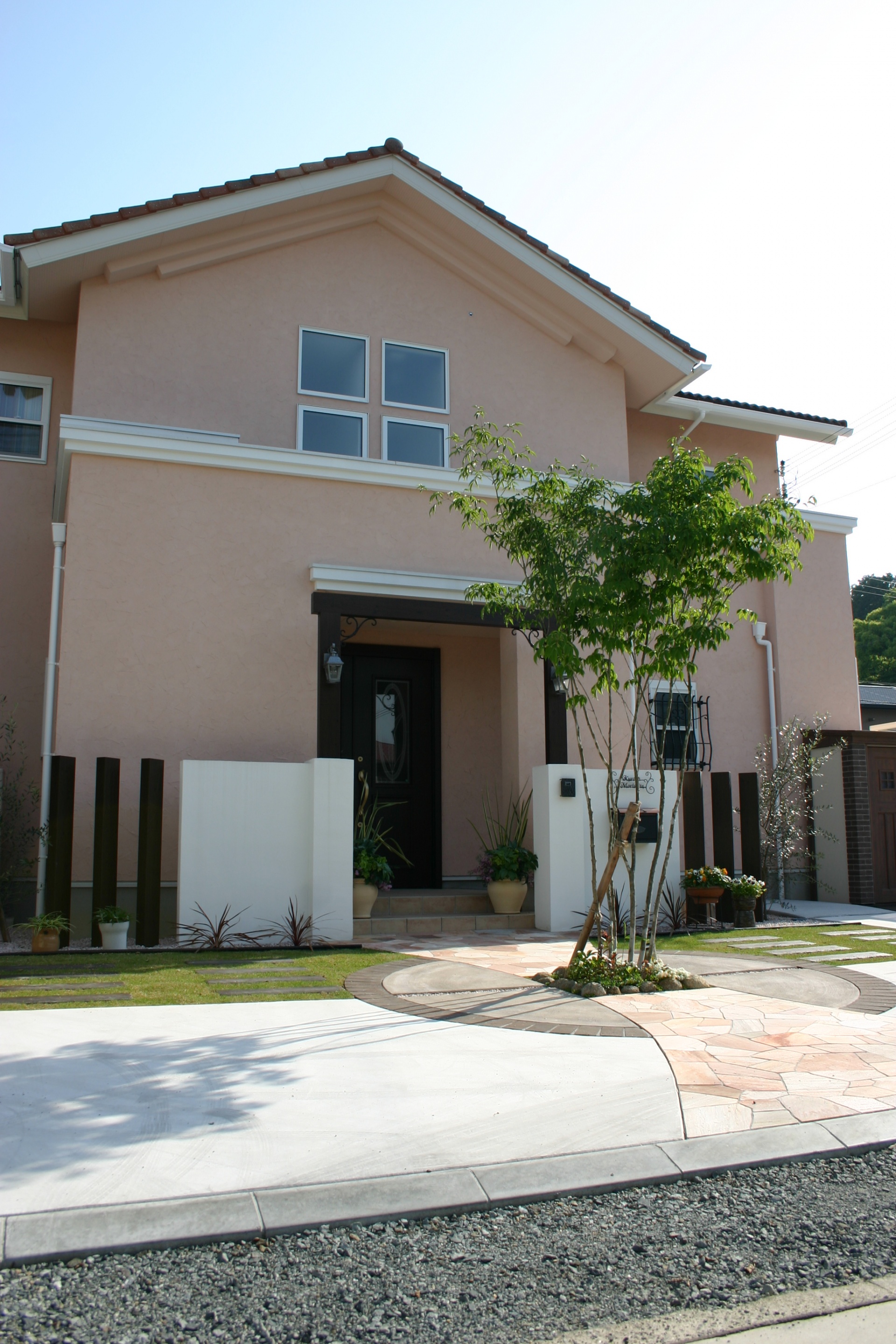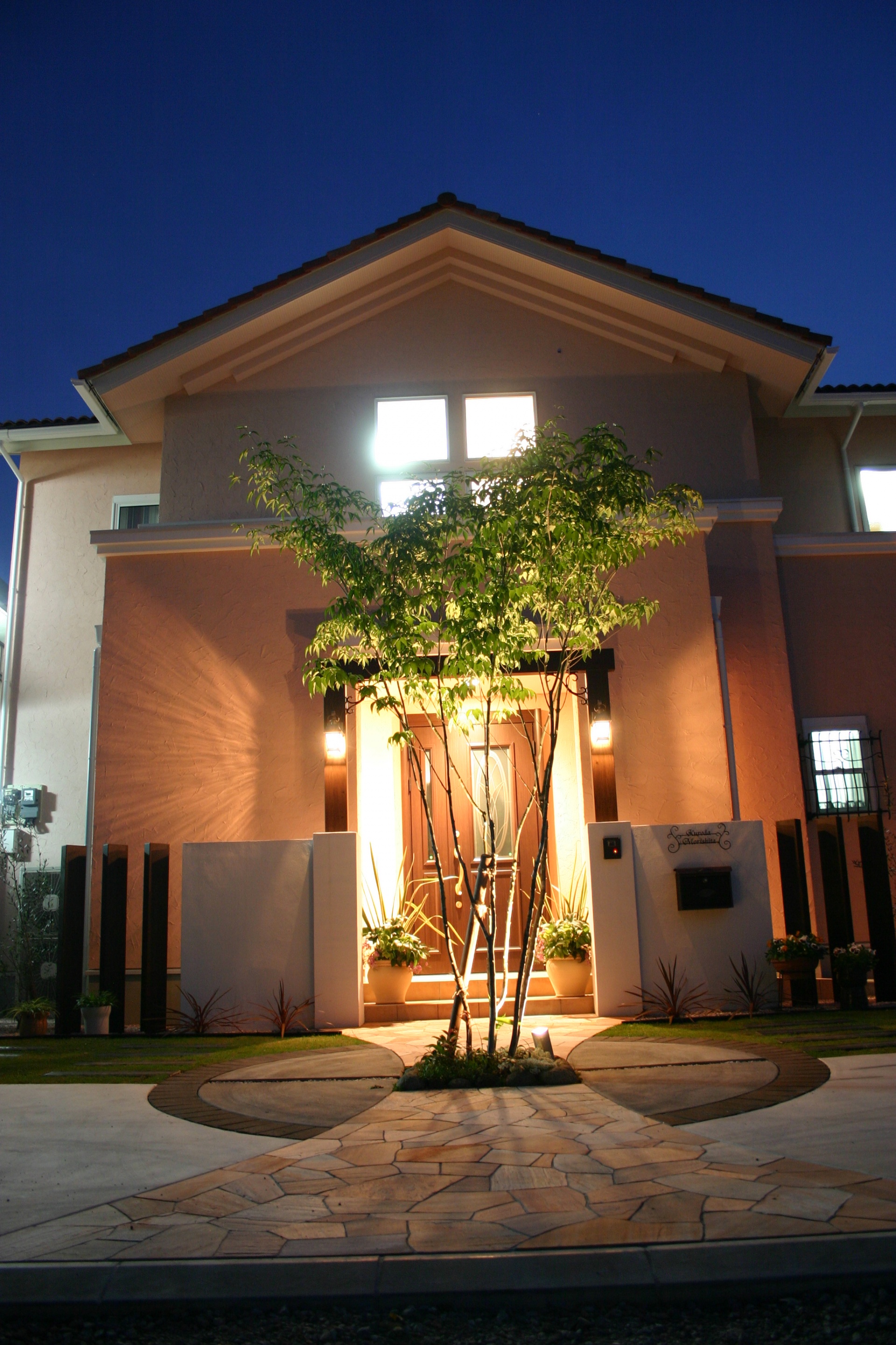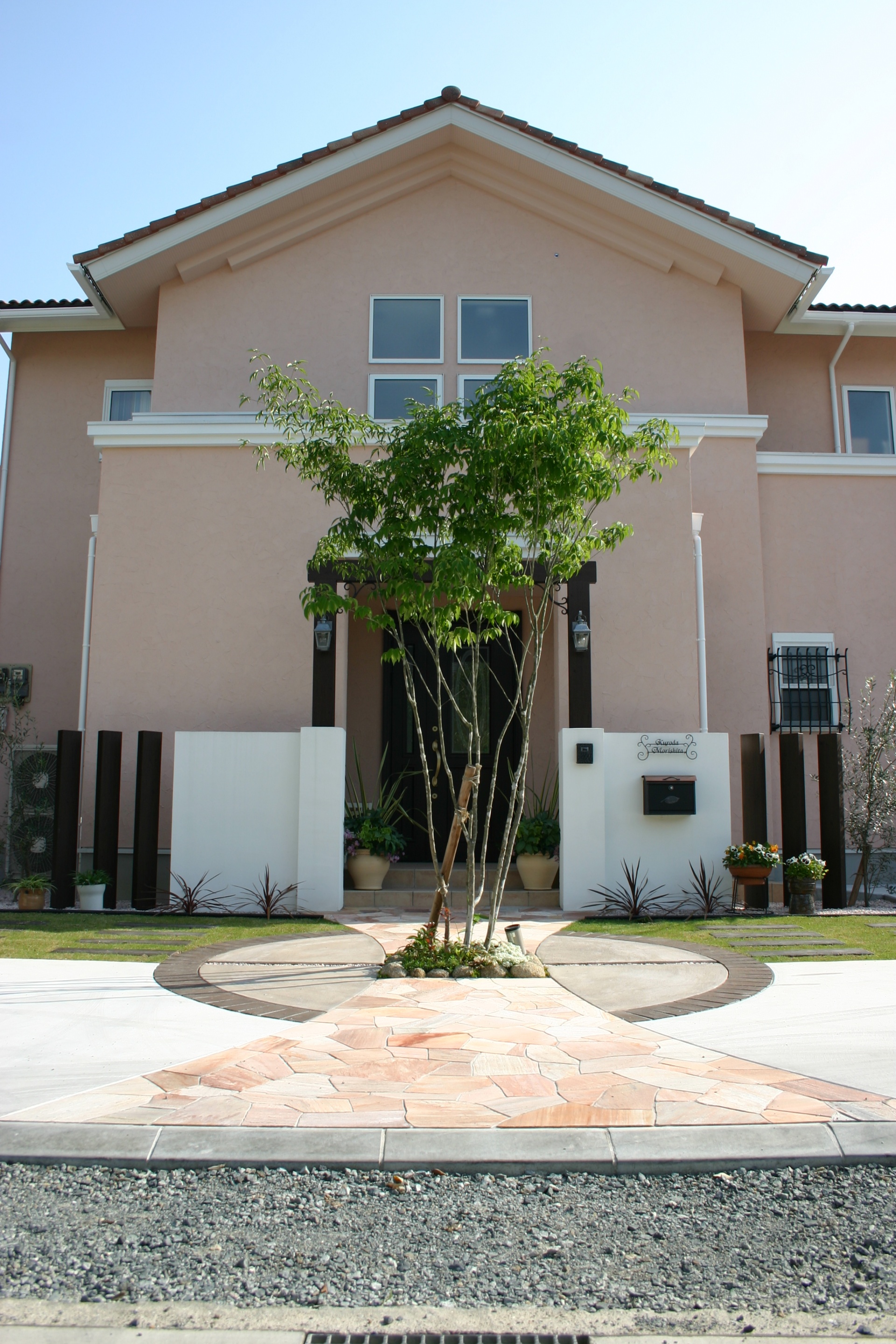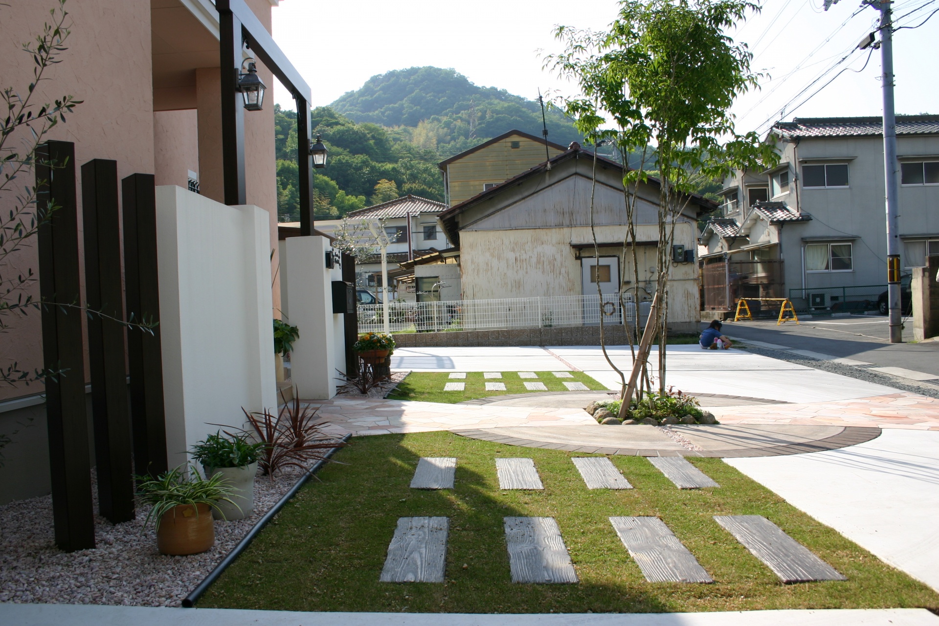 施工実績 ピンクの外壁を背景に四季を楽しむ庭 姫路市K様邸 建物中心(玄関前)に樹形の美しいシンボルツリーのアオダモを配置し、シンメトリーに門袖壁・アプローチをデザインしました。 門袖壁から繋がるアーチ+ライトで建物のボリュームに負けない一体感のある門周りになっています。 カンナ物置も庭のオブジェとしてもマッチしています。 新緑の季節には葉が青々として綺麗です 夜の表情ではダイナミックな表情に変わります 門袖壁から繋がるオリジナルアーチ 芝生とコンクリート製枕木を使ったサブパーキング