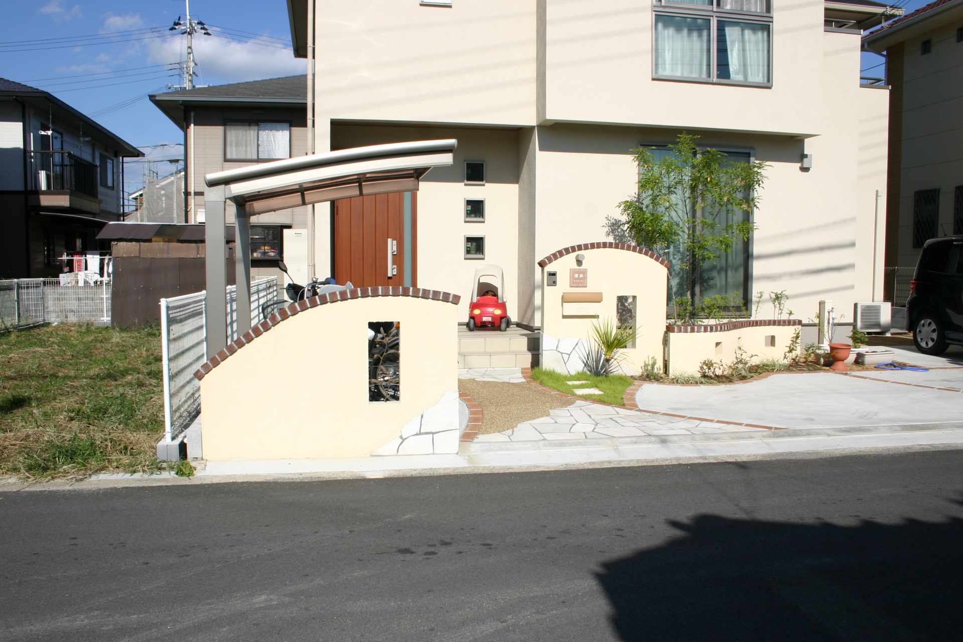 施工実績 レンガで曲線を強調したお庭 姫路市S様邸 シンプルな外観ですが、お庭は曲線を取り入れ可愛くしたいとのご要望でした。 クリーム色の壁にブラウンのレンガ笠木とホワイトの乱型石をデザインしました。 中でもお客様お気に入りのディーズガーデンポストがかわいいです。 アーチ状の塀の裏面に自転車置き場 ディーズガーデンポストがお客様お気に入り。