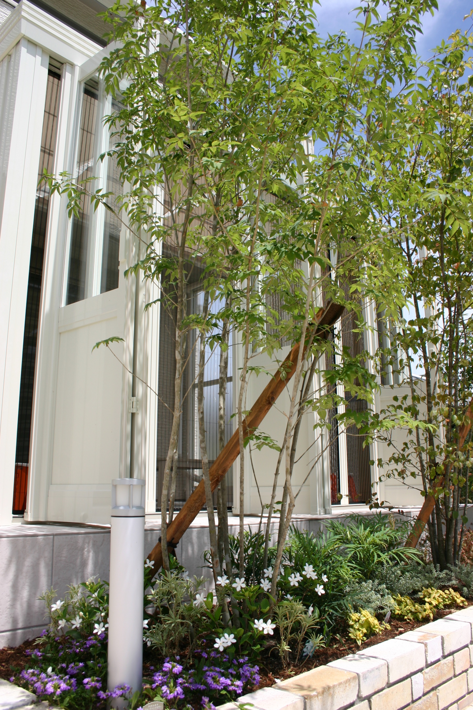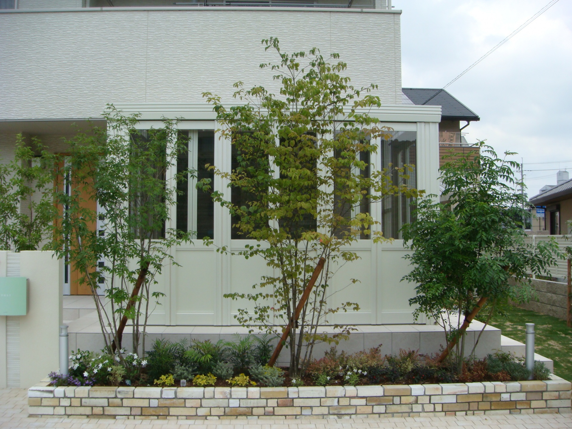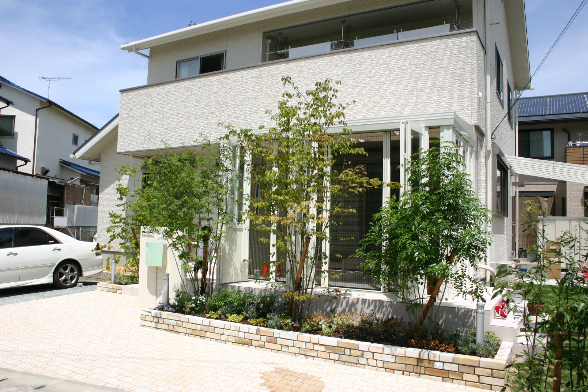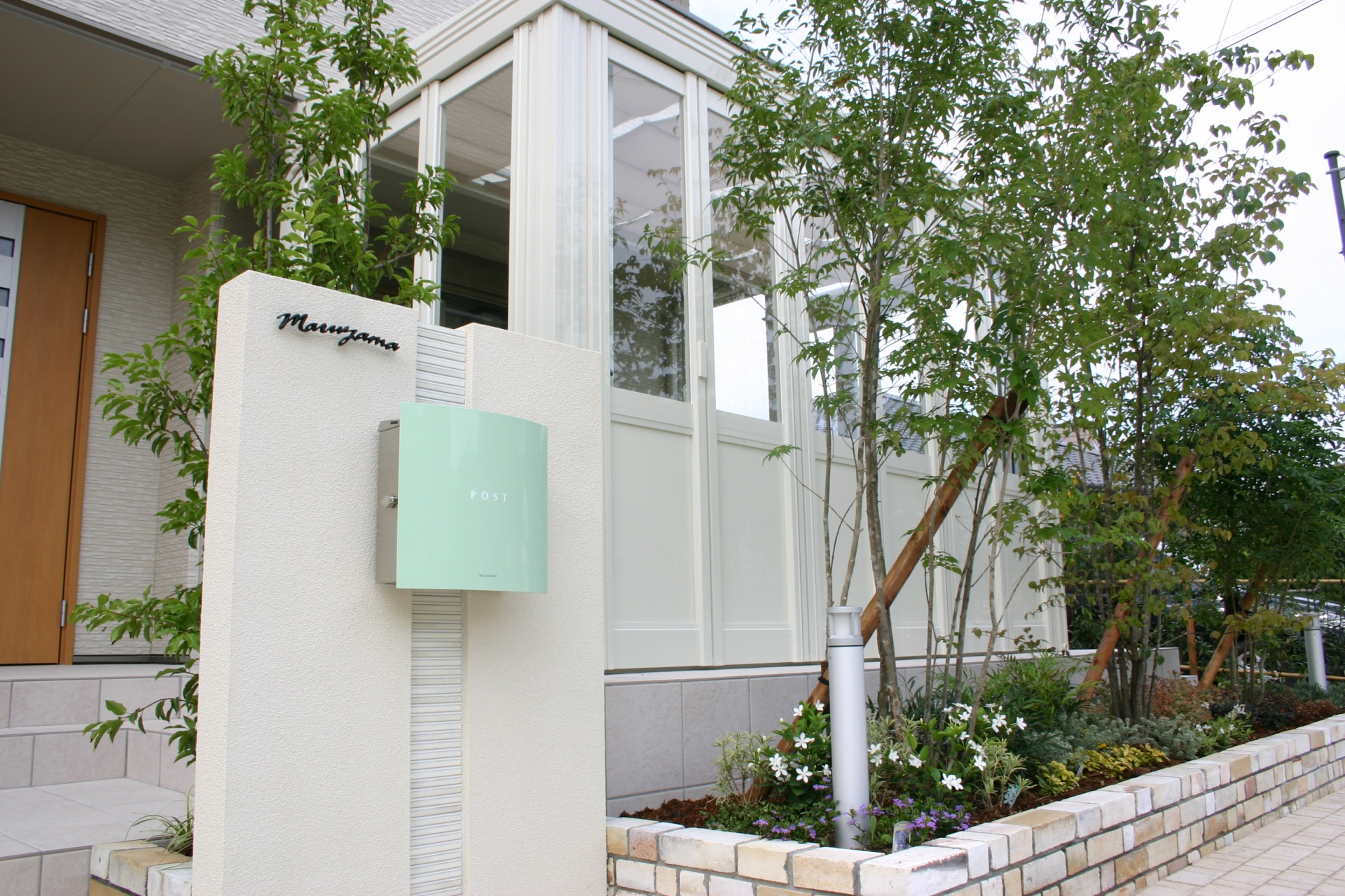 施工実績 爽やかな風を取り込む白のサンルーム 相生市M様邸 爽やかな色目が美しい相生市M様邸。 リビング前をNew暖蘭物語で庭空間とつなげ緑豊かなお庭になりました。 床面のタイルテラスは玄関ポーチと一体感を出すため白で統一。 テーマのカラーはホワイト&グリーン。 白の建物外観によく合ったプライベート空間を意識したお庭が仕上がりました。 白を基調とした中にアイスグリーンのポスト、植栽の緑が爽やかに映えるファサード。