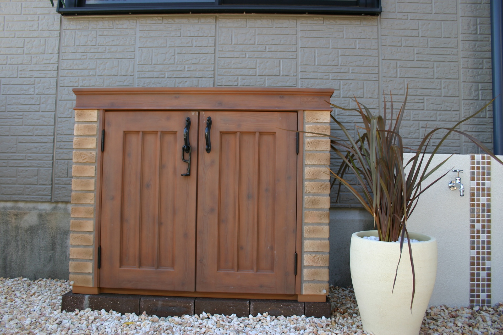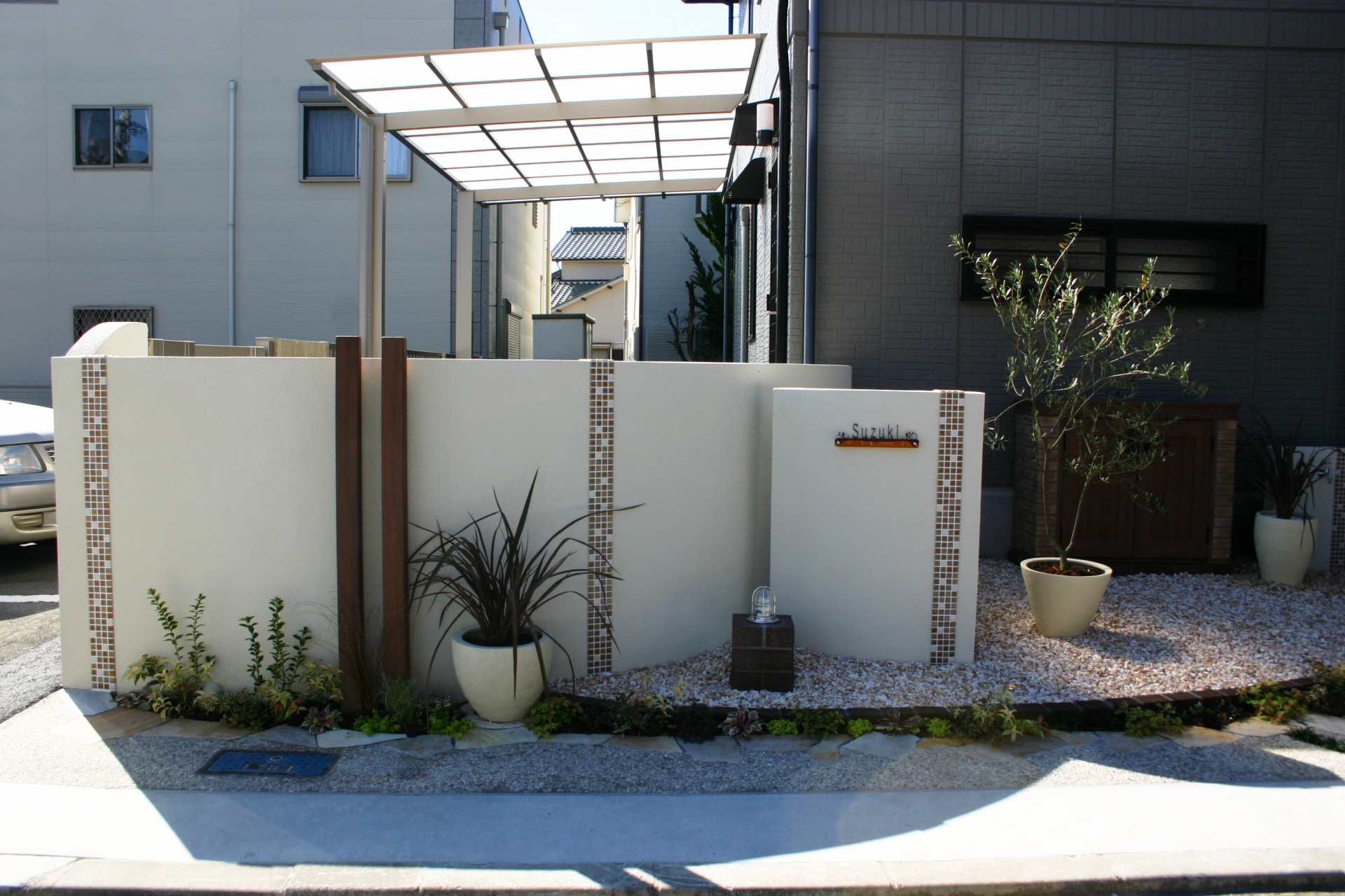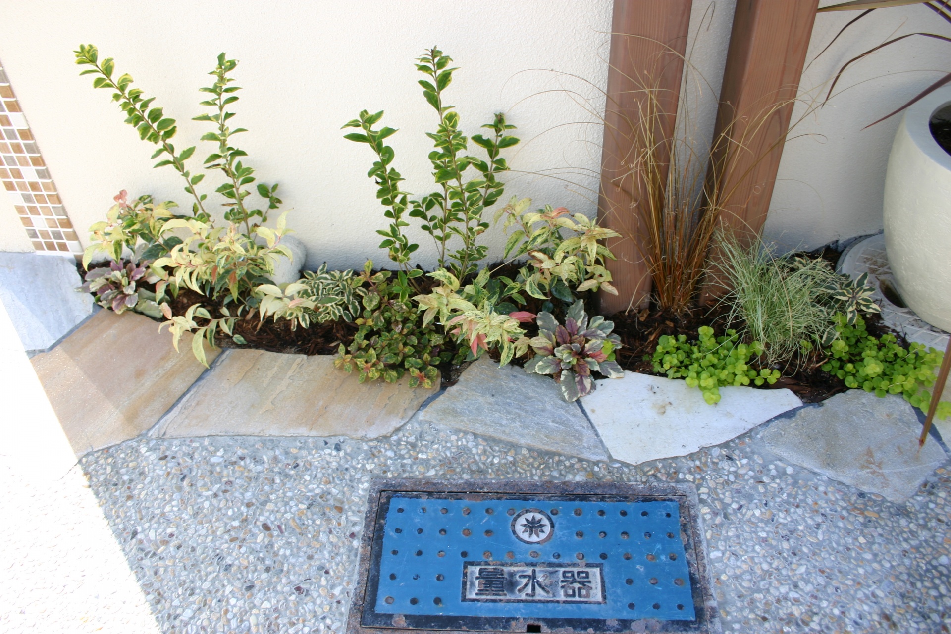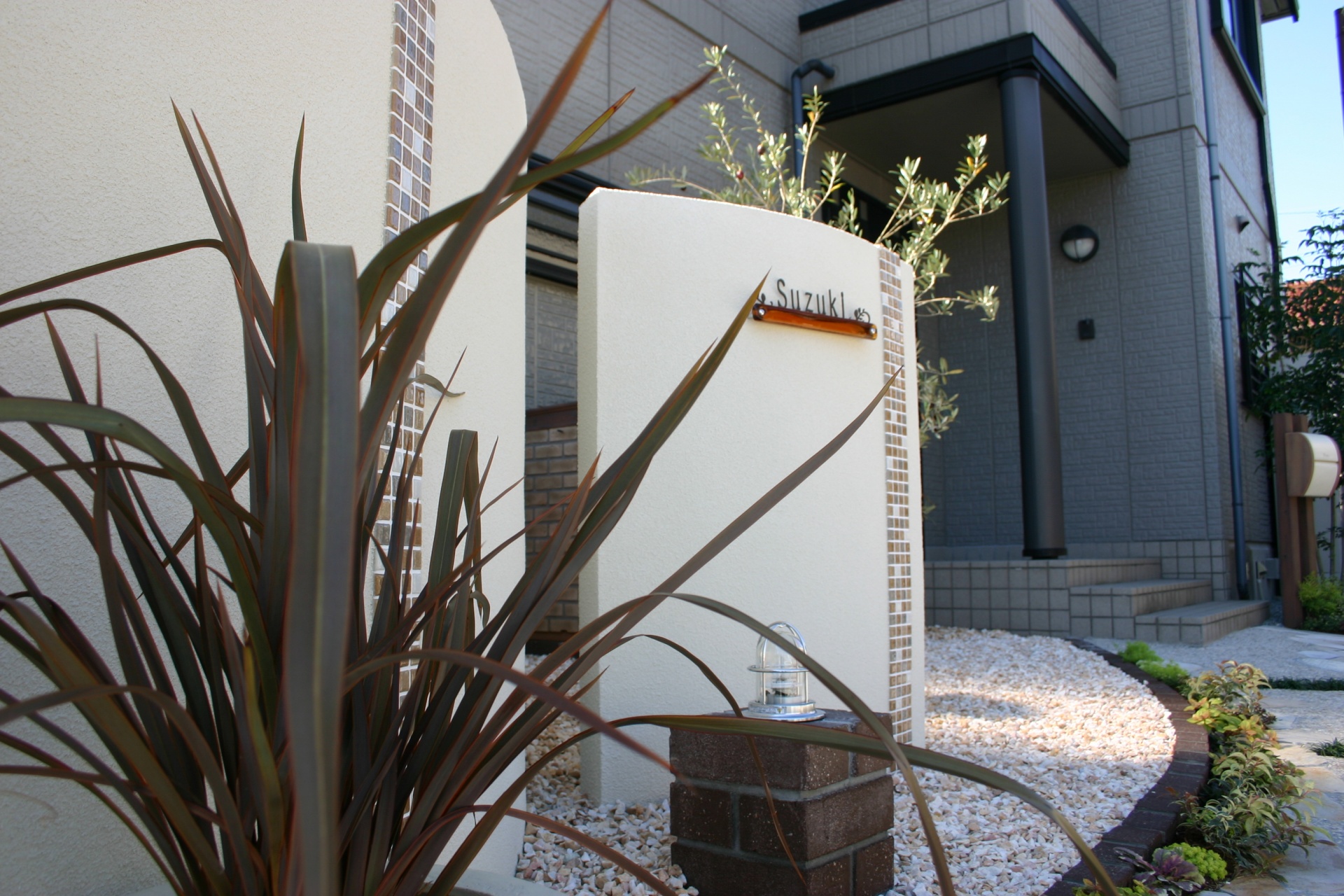 施工実績 爽やかオープンエクステリアにリフォーム 赤穂市S様邸 ホワイトベースのウォールにブラウンのモザイクタイルをデザインに取り入れました。 玄関先にはポイントにカンナミニの物置をセット。 小物をすべてディーズガーデンにてコーディネイトしました。 銅葉ニューサイランの美しいラインが特徴です。 乱形のイエロー自然石と自然石淡路砂利のアプローチ。 既設のブロックを一部残し、アルミのウッド調フェンスにて視線をカバーしています。 門袖壁の足元には爽やかな緑が入りました おしゃれな物置:カンナ ミニ 玄関先に置いても、とっても可愛いです。