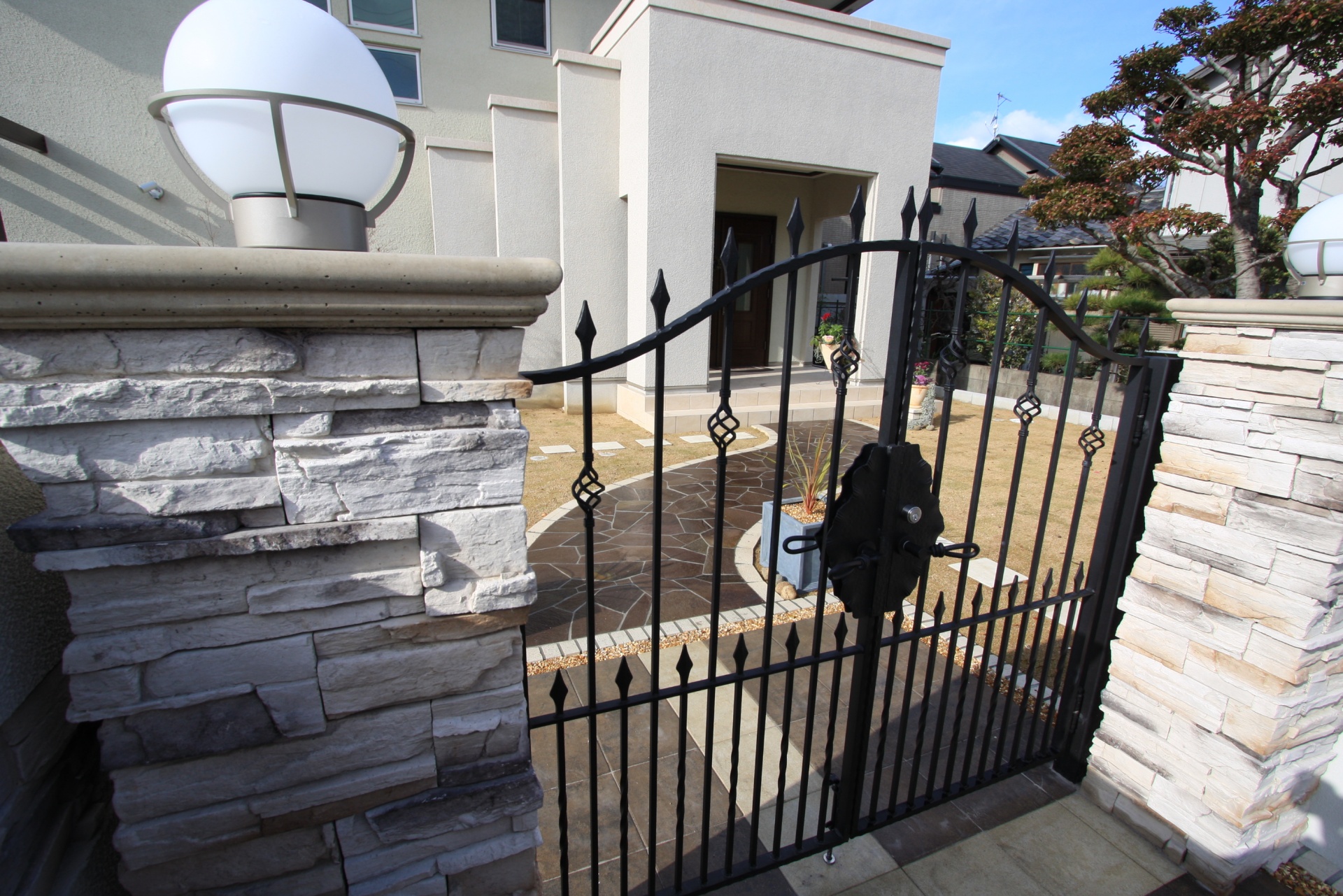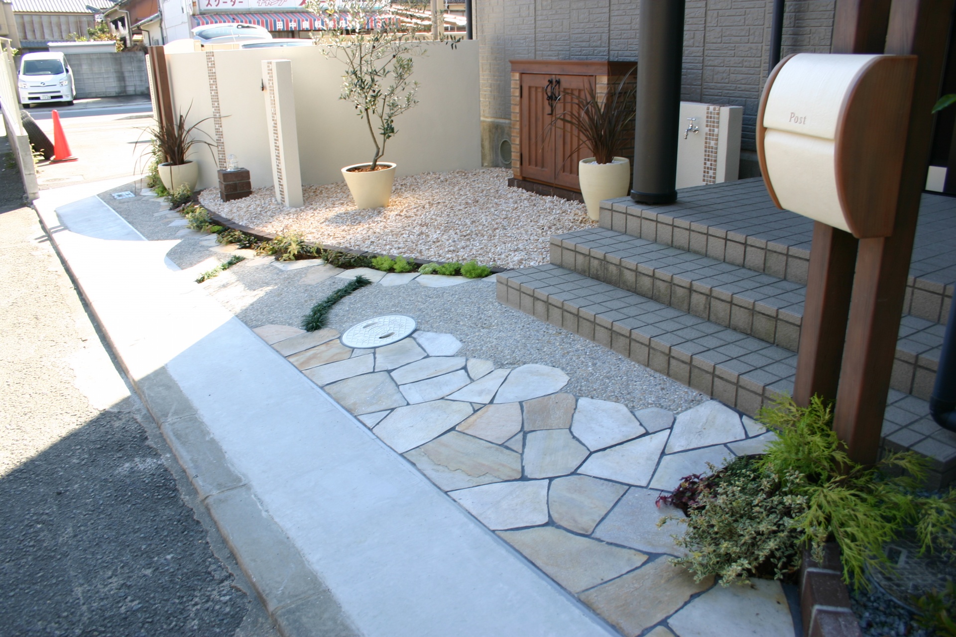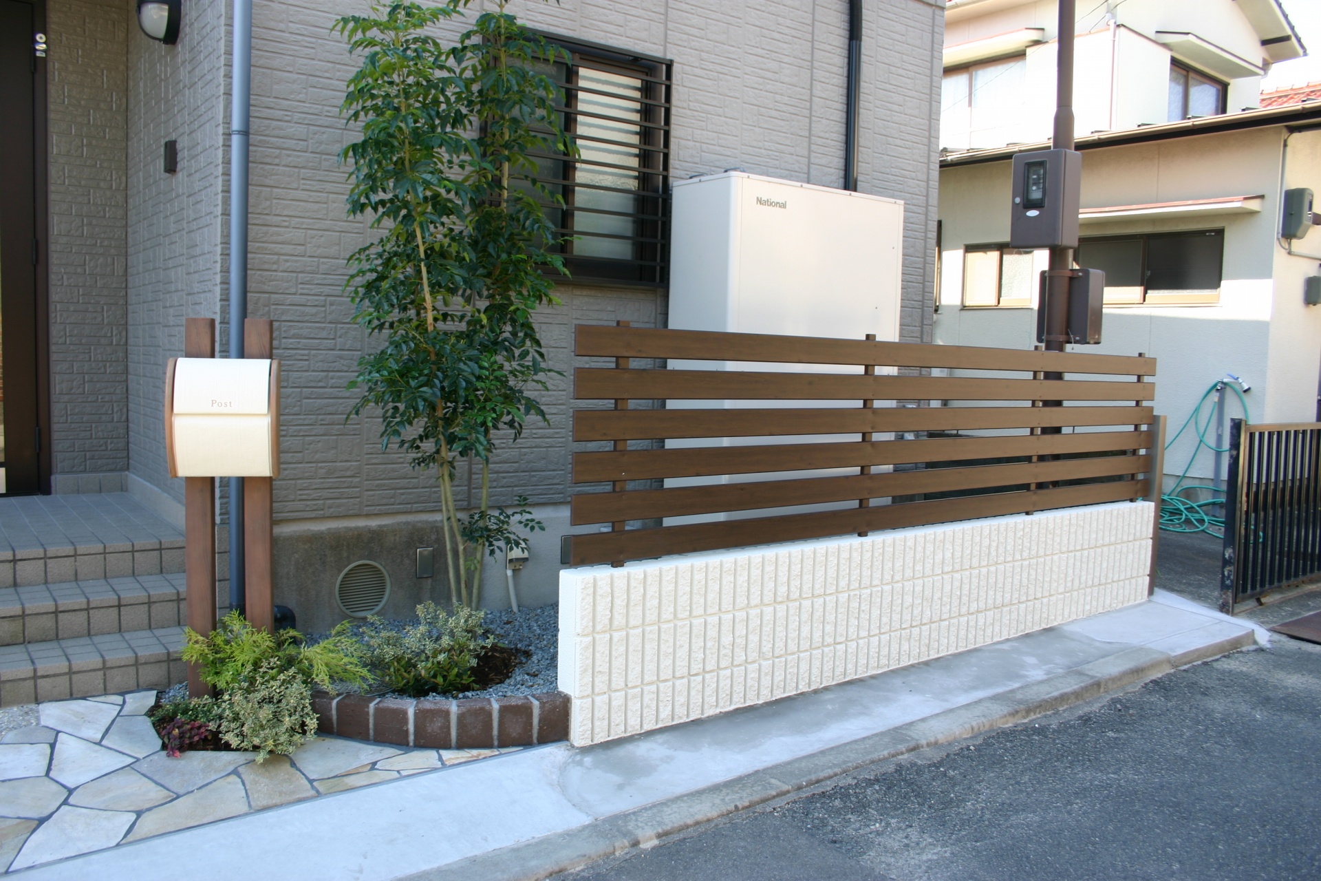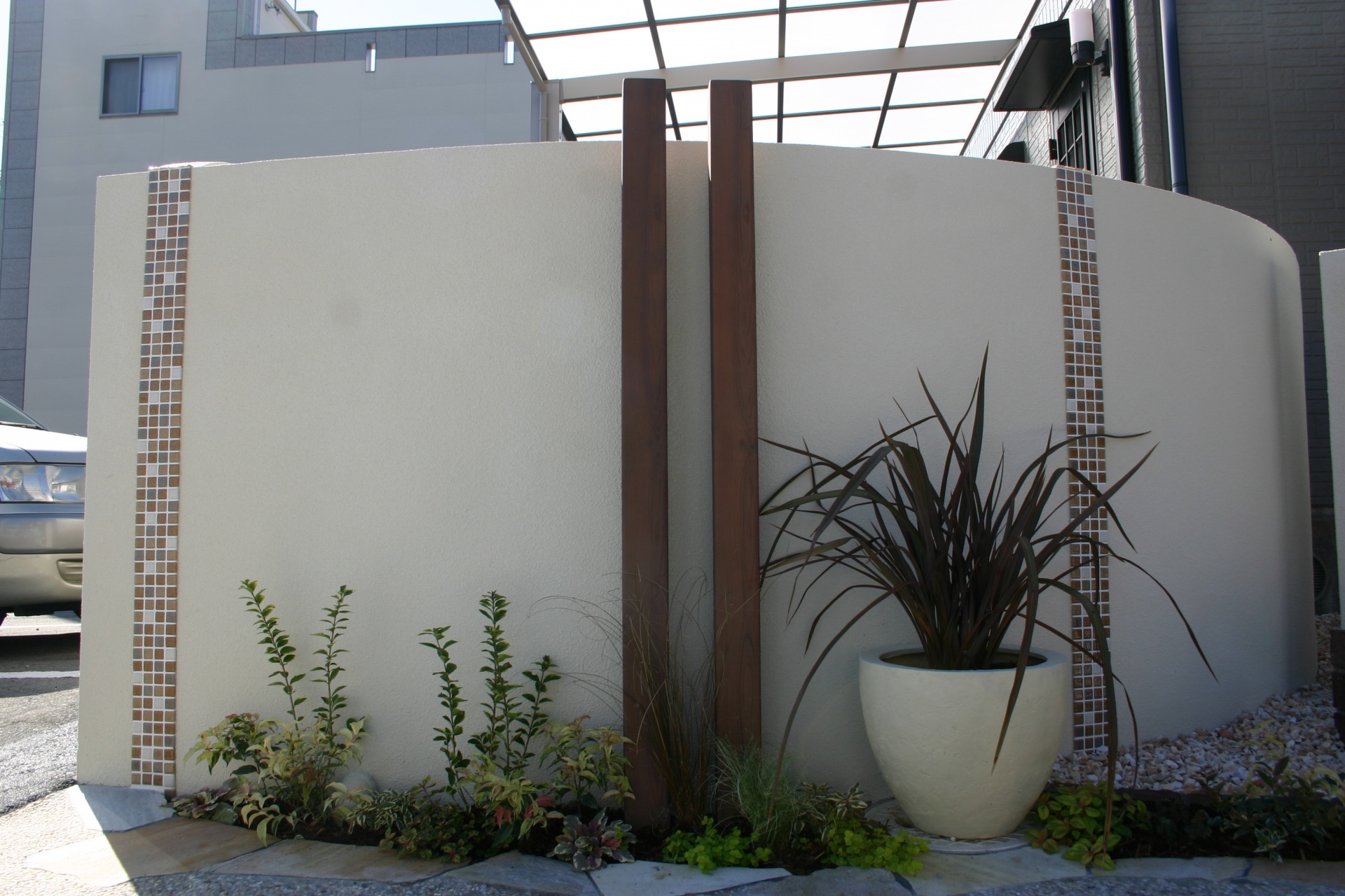 施工実績 爽やかオープンエクステリアにリフォーム 赤穂市S様邸 ホワイトベースのウォールにブラウンのモザイクタイルをデザインに取り入れました。 玄関先にはポイントにカンナミニの物置をセット。 小物をすべてディーズガーデンにてコーディネイトしました。 銅葉ニューサイランの美しいラインが特徴です。 乱形のイエロー自然石と自然石淡路砂利のアプローチ。 既設のブロックを一部残し、アルミのウッド調フェンスにて視線をカバーしています。 門袖壁の足元には爽やかな緑が入りました おしゃれな物置:カンナ ミニ 玄関先に置いても、とっても可愛いです。