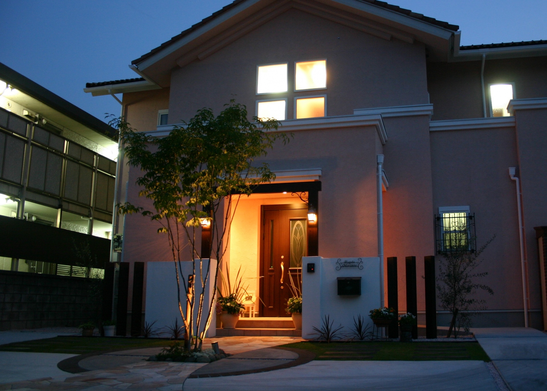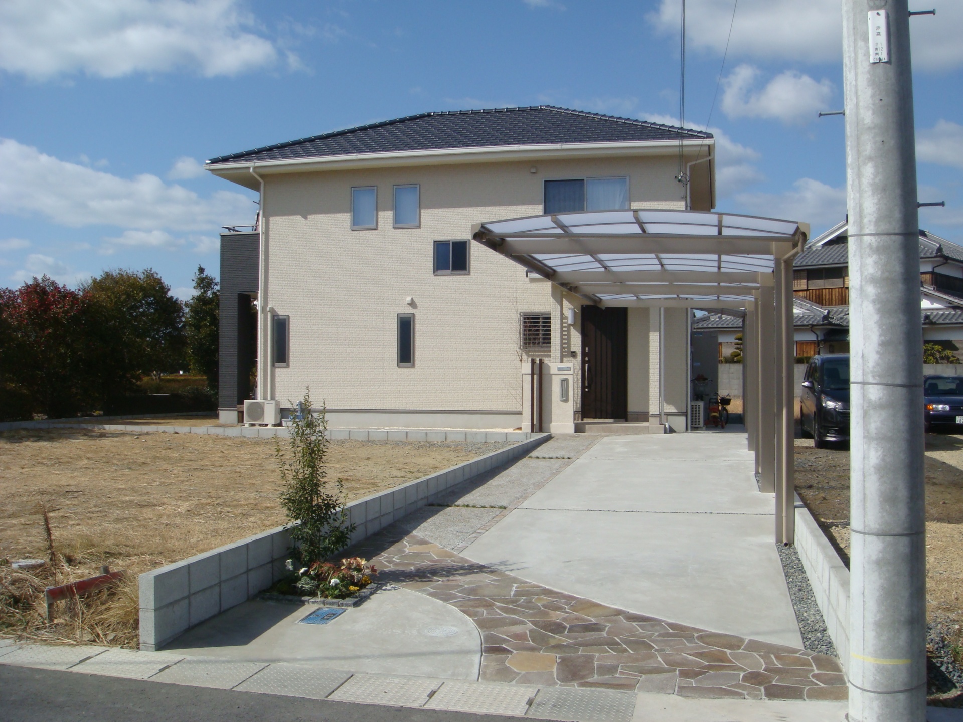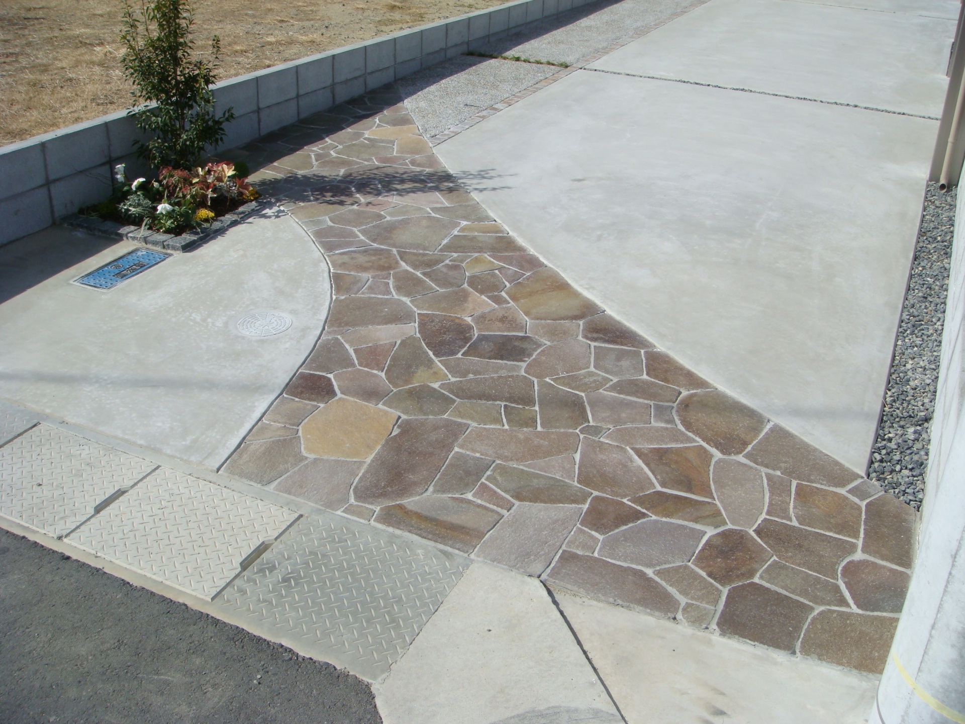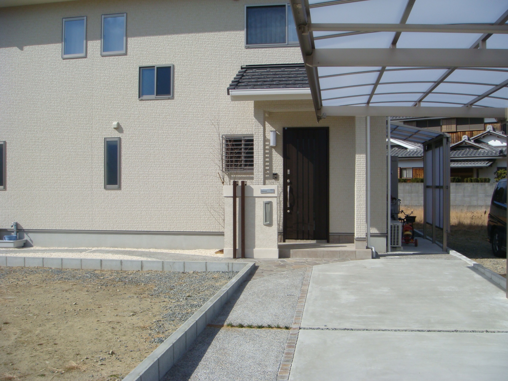 施工実績 シンプルエクステリア|凹凸にアーチをかける 赤穂市S様邸 4m幅の専用通路が約14mあり、その奥に玄関があります、赤穂市S様邸。 専用通路部分はアプローチ兼車庫スペース。 仕上げのメリハリをつける事、導線を考慮したゾーニングを意識しプランニングしました。 右側より人の導線は無いため自然石の乱張りで斜めに大胆に設け、後は自然砂利の洗い出しで玄関へと続いていきます。 固めるといったハードな部分が大半を占める為、前面の一部に植栽スペースを設けて奥との繋がりも意識しました。 門柱はシンプルに且つスリムに玄関前に。 シンプルながら凸凹や吹き付けの仕上げパターンを変え玄関扉にも使われているこげ茶の木目調アルミ材にて門柱をアーチで囲みました。 全体に落ち着いた色目でまとめ、道路部分からは敷地幅は狭いですがしっかりと主張したデザインになりました。 茶系の自然石乱張りアプローチ アプローチの直線部分には90□の自然石を敷きました ご家族揃っての記念撮影