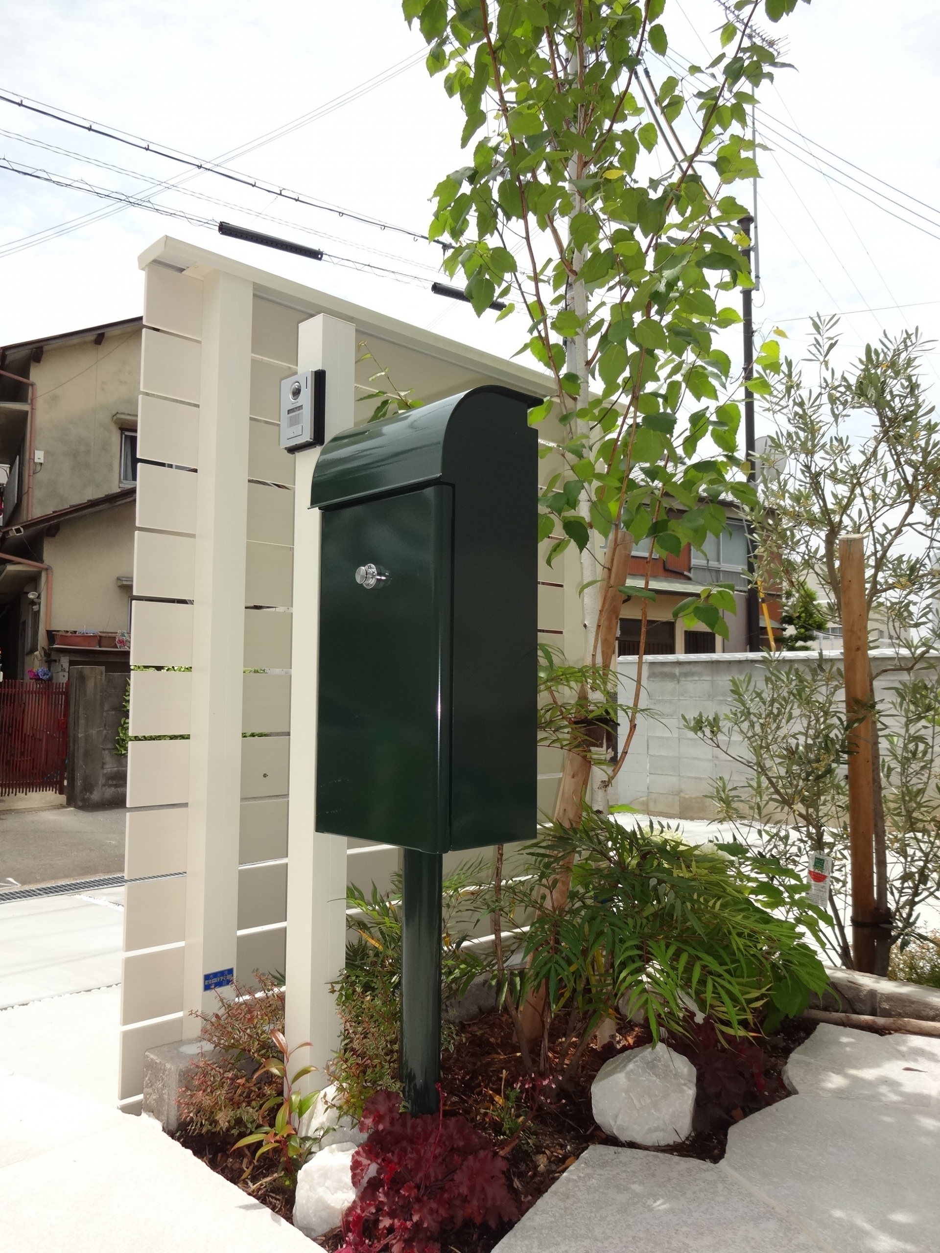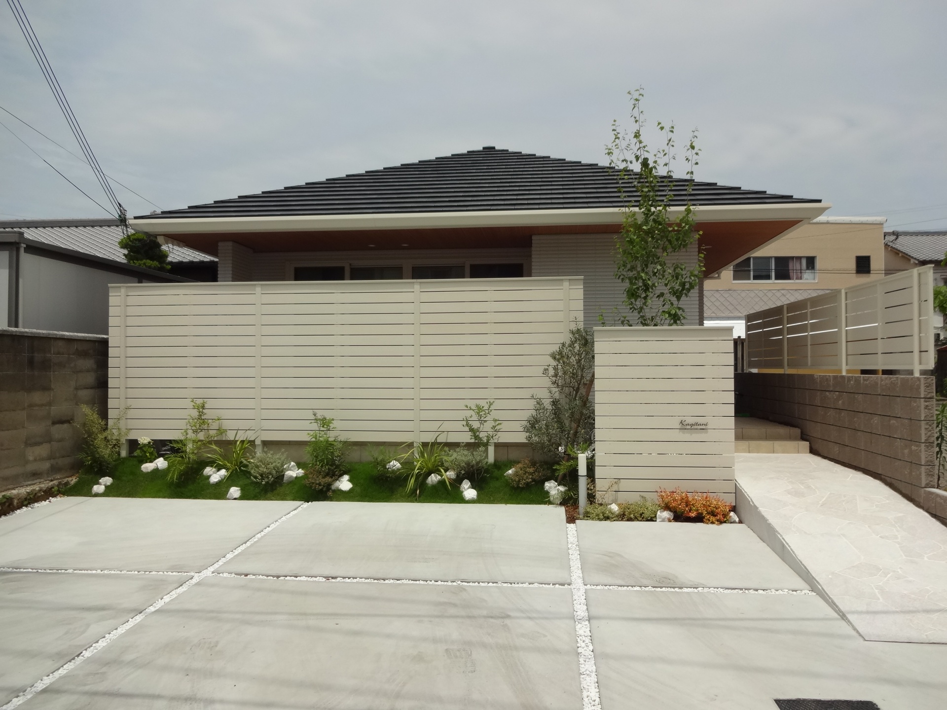 姫路市新築外構 白と緑でシンプルガーデン 白の自然石アプローチ