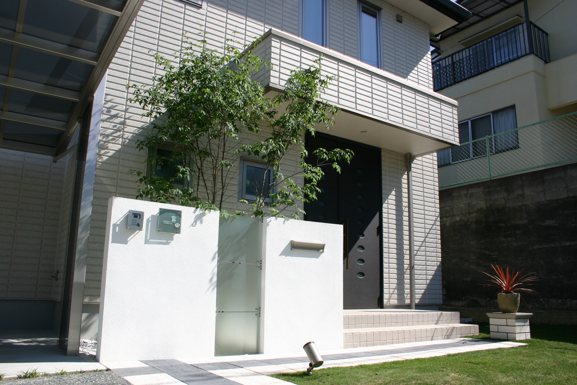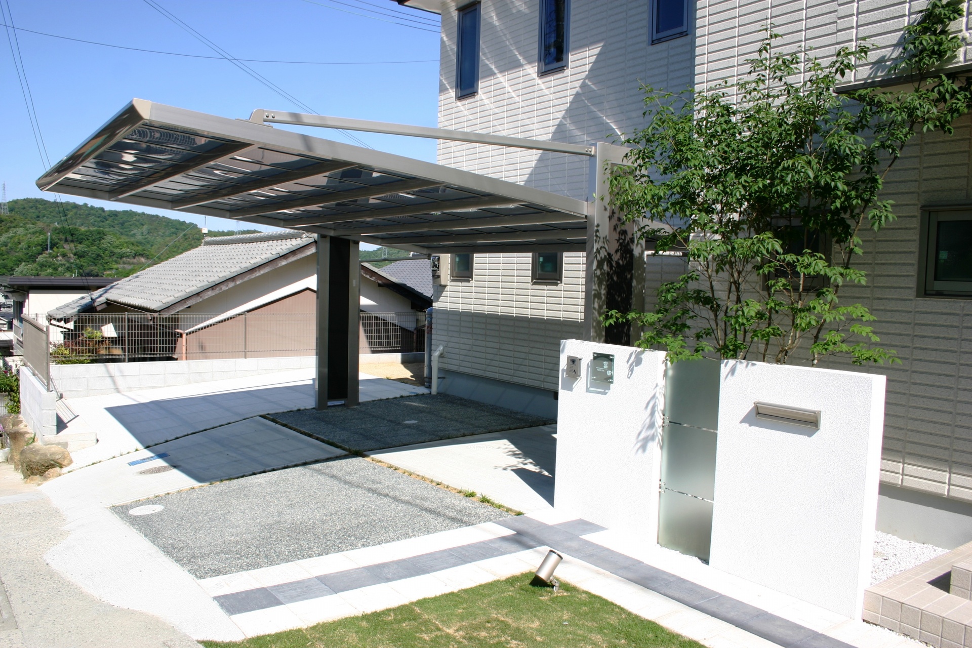 施工実績 白の門柱|アオダモの存在感 相生市T様邸 シャープなデザインのカーポートが良く似合う相生市T様邸 前面道路の勾配が急な為、カーポートをご希望されていました T様には後ろ2本足のマイポートワイドをご提案させていただきました。 建物に合わせたシンプルなデザインが、門周りのポリカパネルを使ったモダンな門柱と合います。