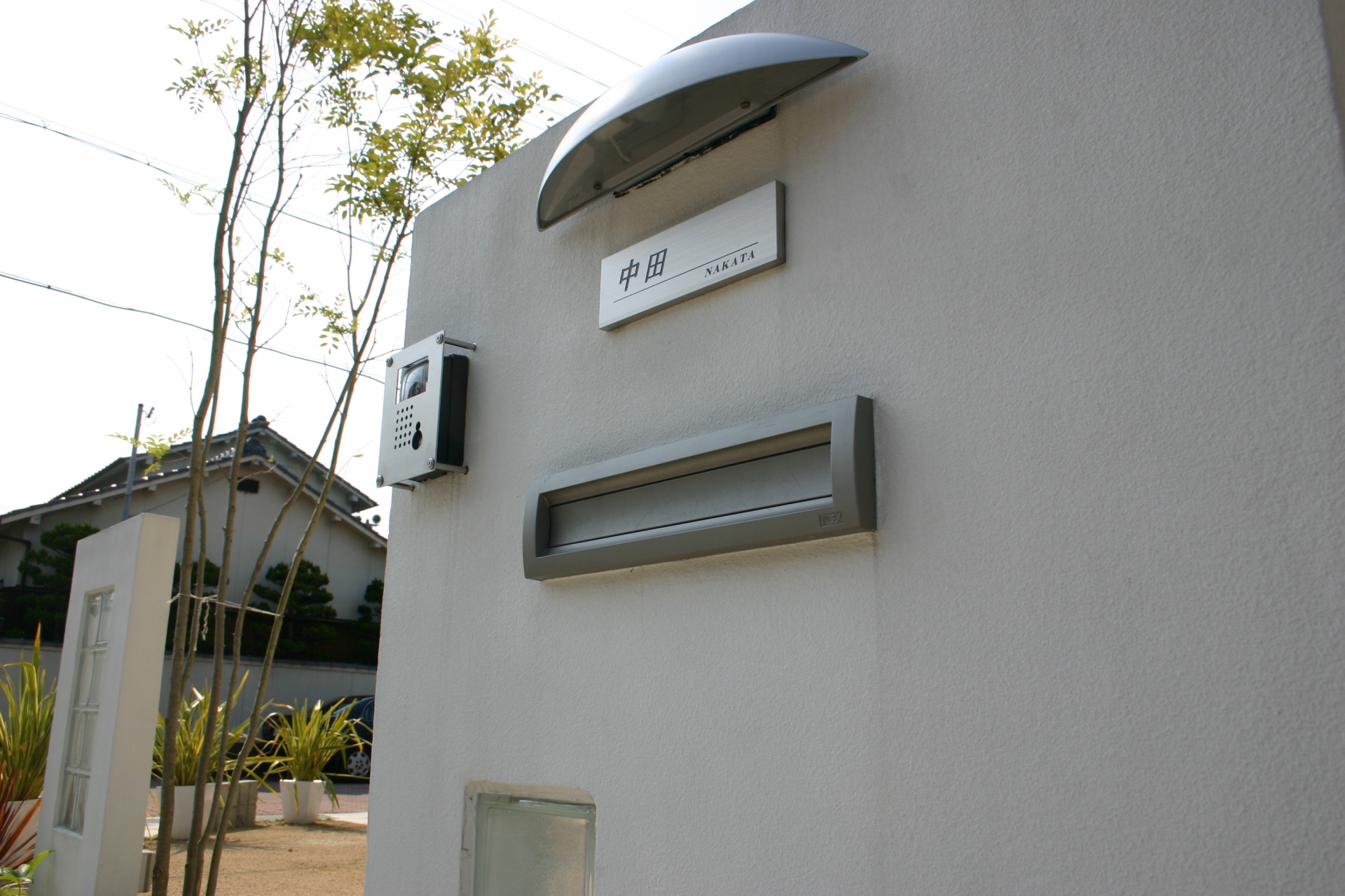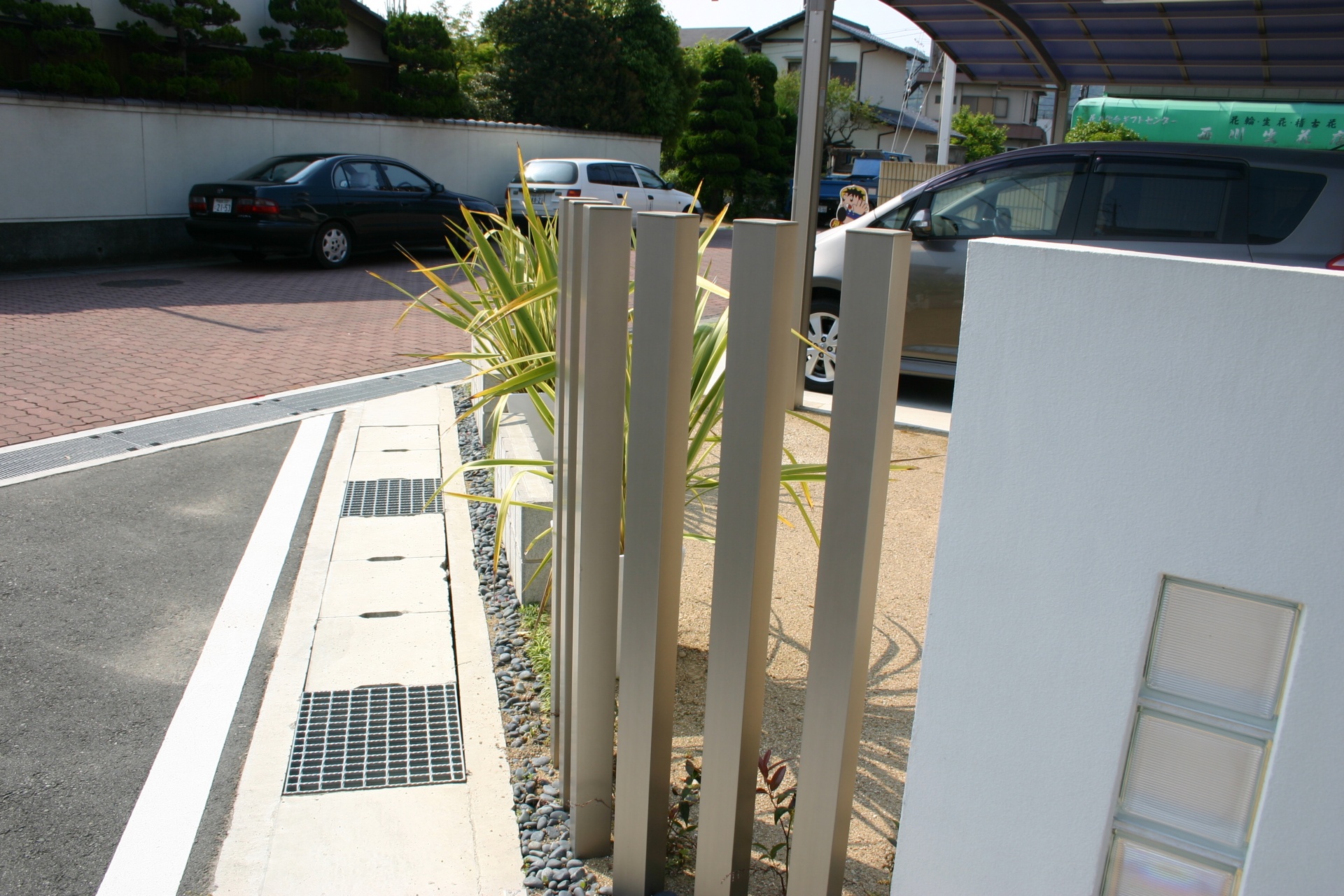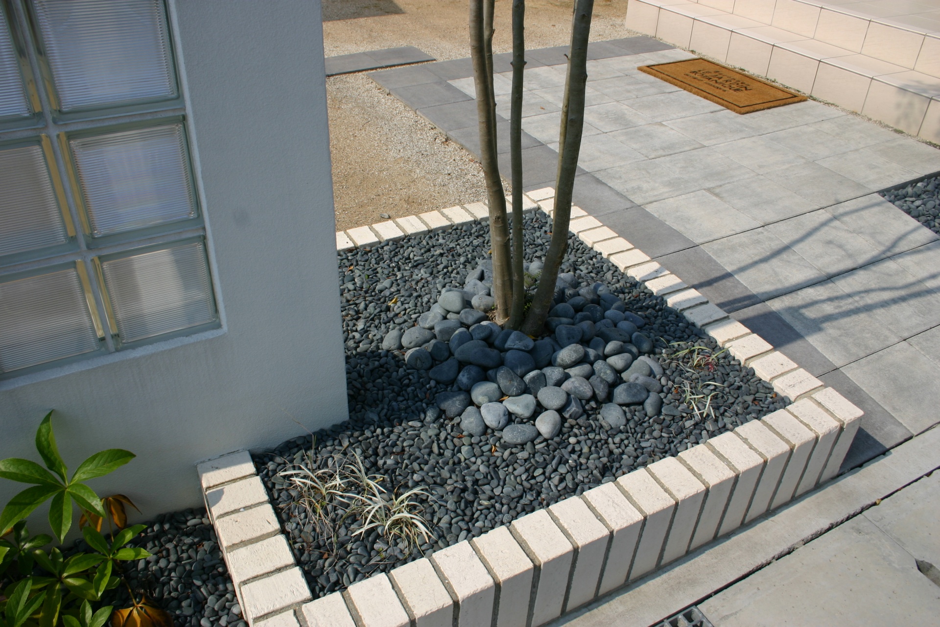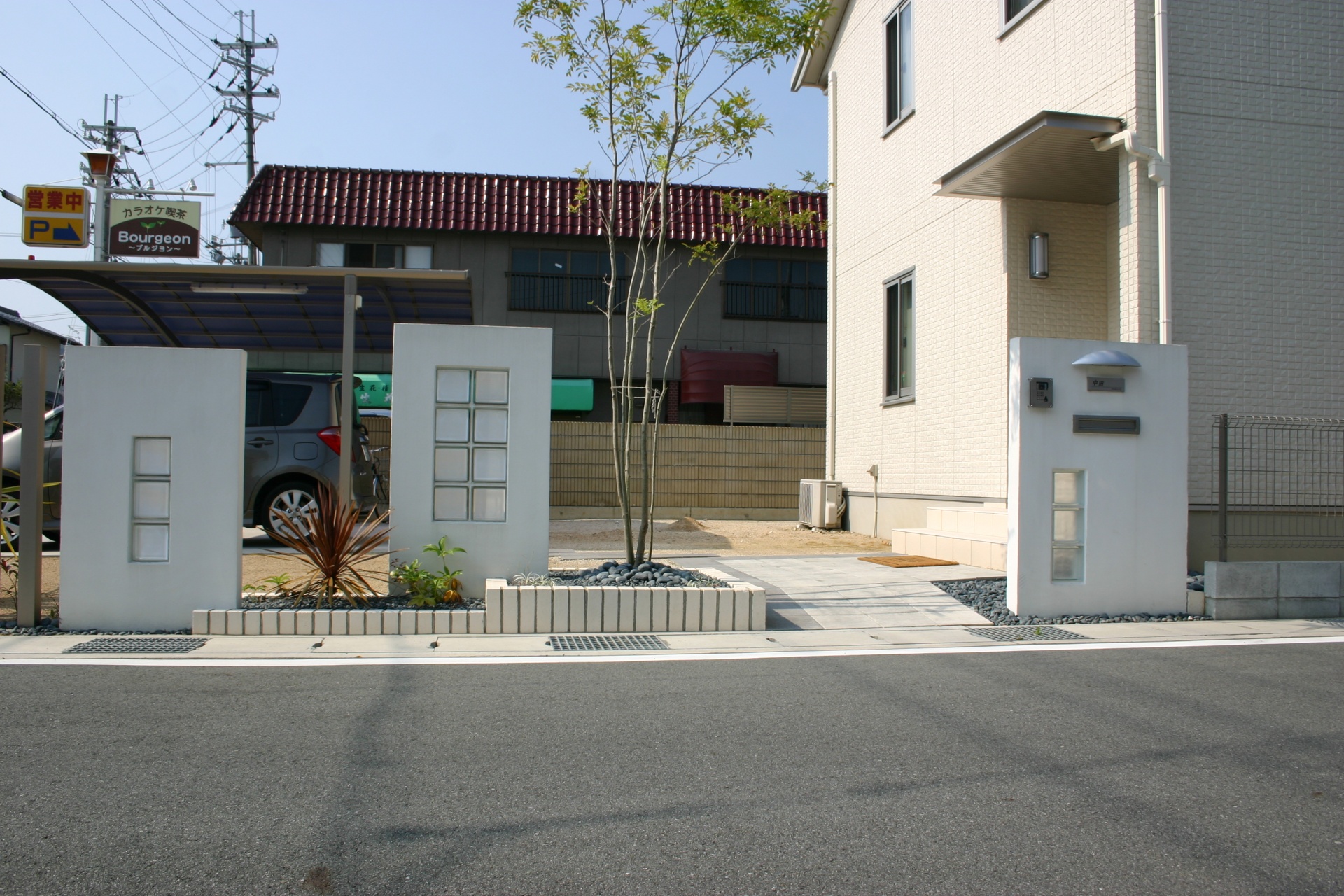 施工実績 白の塗り壁とガラスブロック たつの市N様邸 白い外壁のたつの市N様邸 門柱部ののみ施工されておられましたが、アプローチ・塀は手付かずのままでした。 シンプルで冷たいイメージをとのご希望で、ホワイトの塀にストライプのガラスブロックを組み合わせました。 ホワイトレンガのFBOXには黒の那智石を敷き詰めモノトーン調にデザインしました。