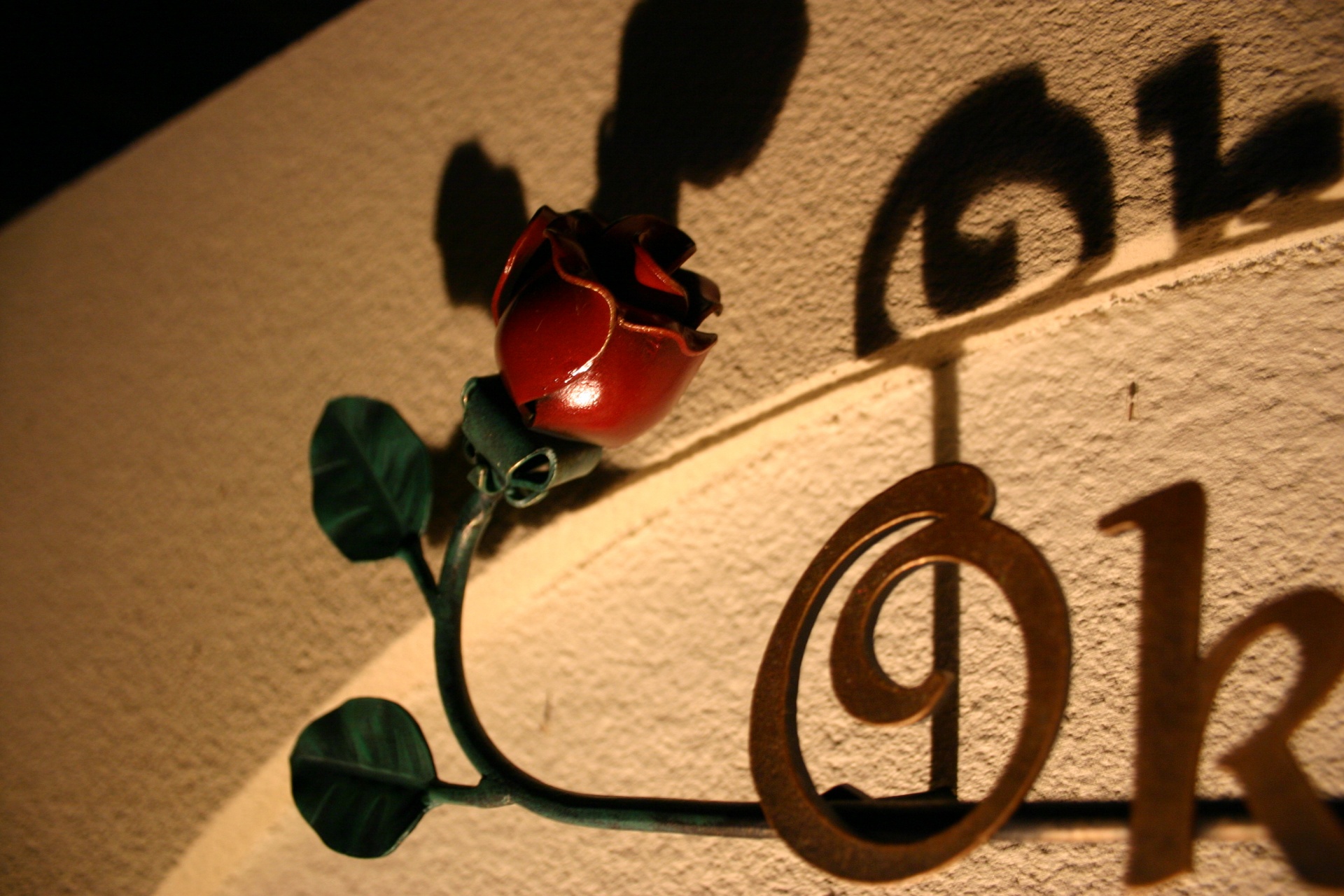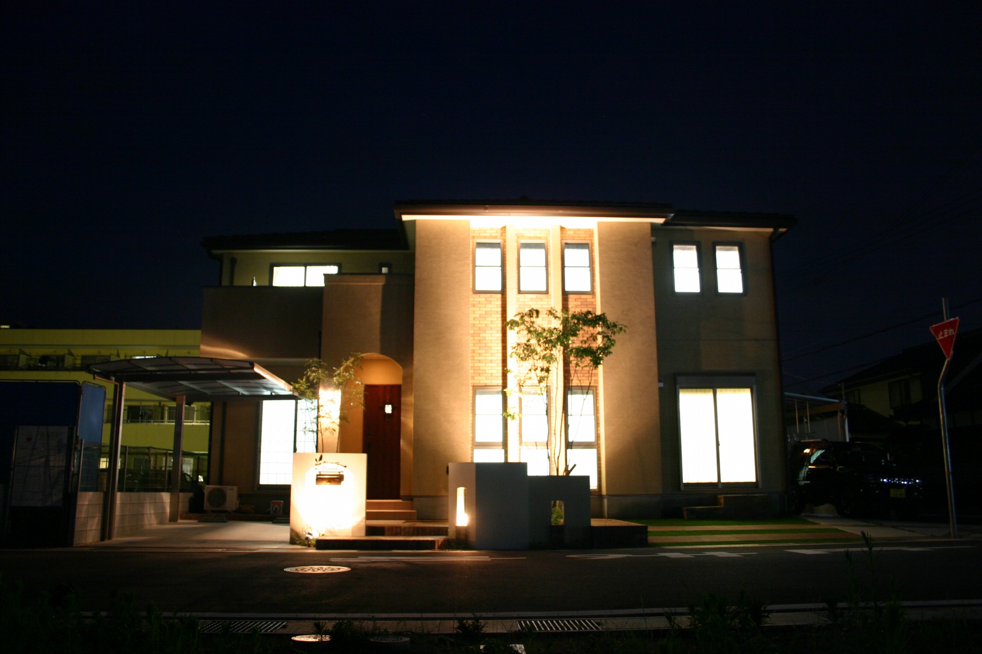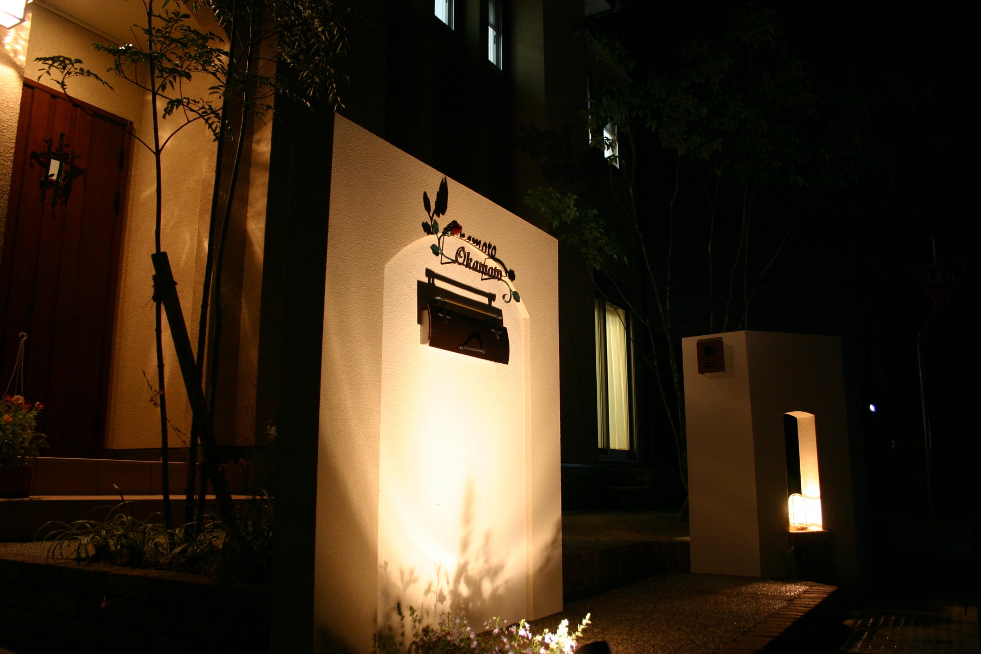 施工実績 薔薇のアイアンサイン たつの市O様邸 建物正面のメインウォール前にアオダモを植樹。ナイトシーンではやさしい葉の影が壁に映ります。 ニッチ加工の壁に照らされる薔薇のアイアンサイン お昼間の完成写真はこちら