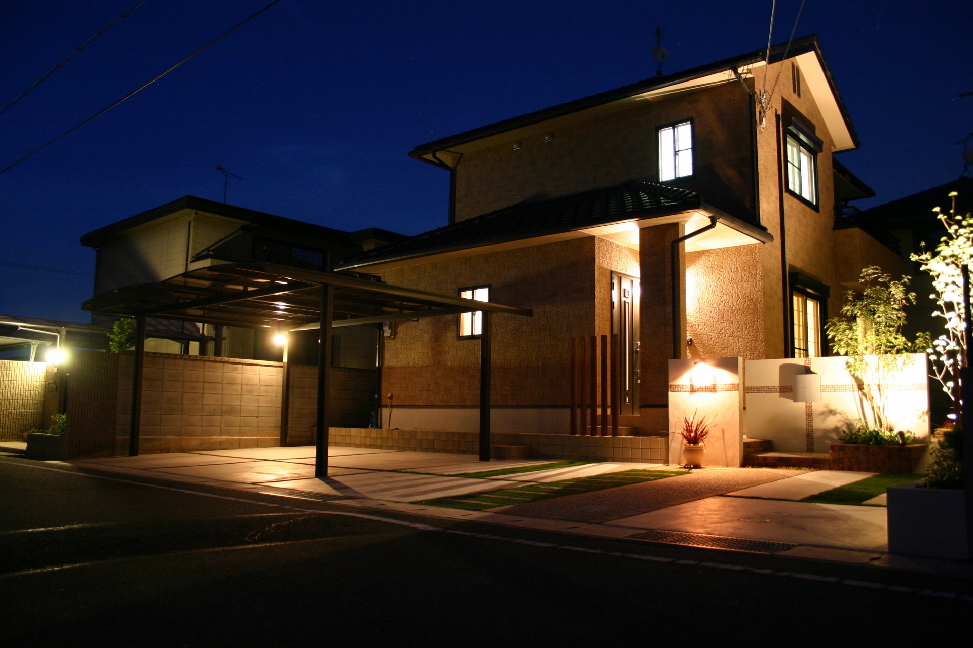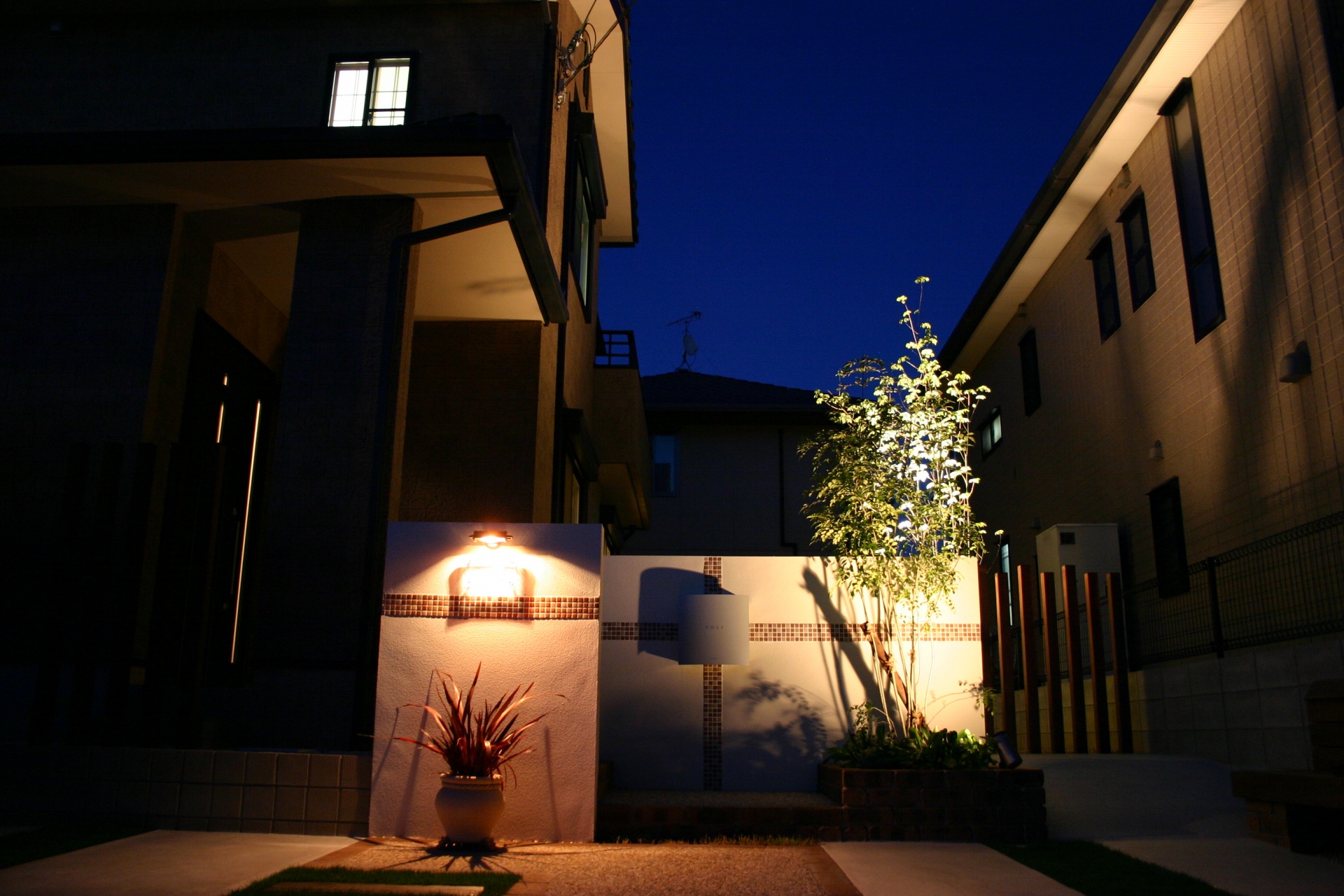 施工実績 ガラス表札をオレンジの灯りで照らす たつの市F様邸 前後に設けた壁。照明計画で、そのシルエットがはっきりと浮かび上がり、シマトネリコやアオダモも足元の光で樹形がはっきりと映し出されます。 可愛いガラスの表札には、オレンジの灯りが似合います。 お昼間の完成写真はこちらです 。