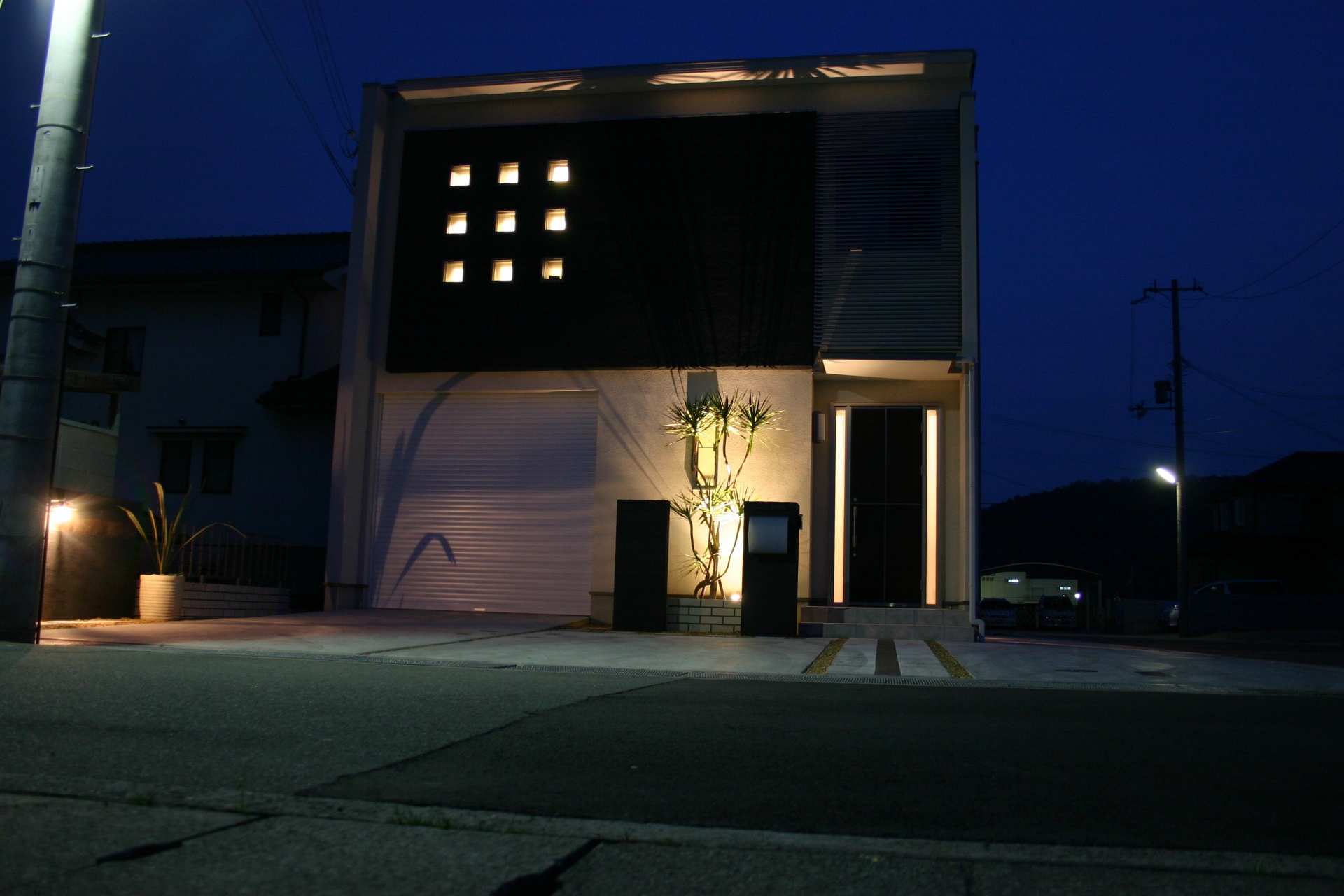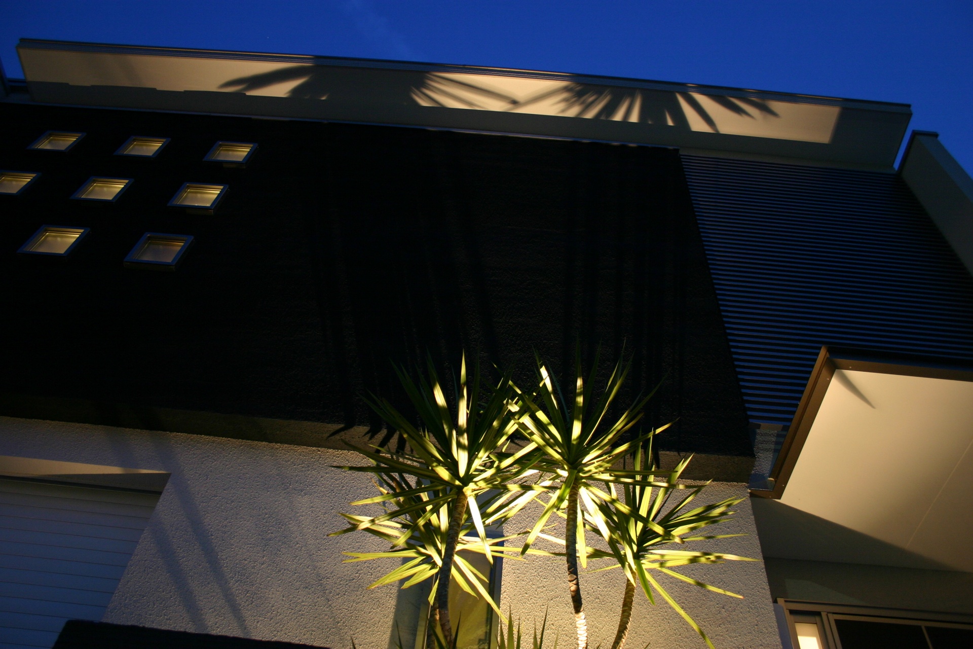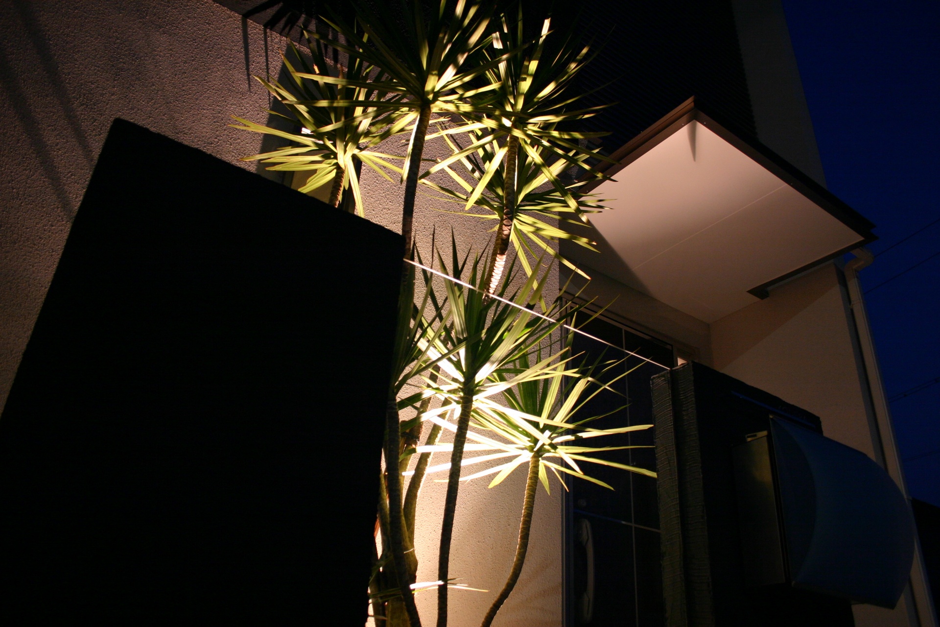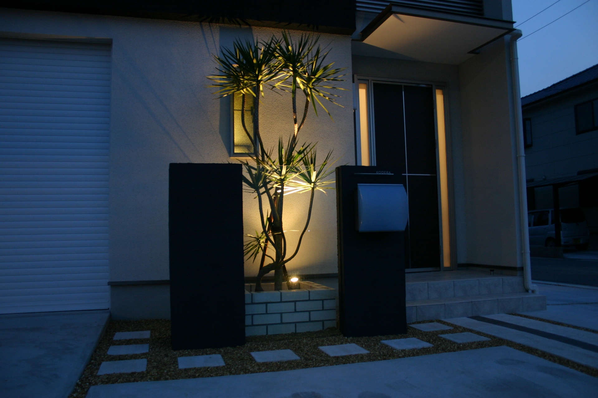 施工実績 ガラス越しのユッカをライトアップ 姫路市K様邸 姫路市K様邸。 都会的な雰囲気を出すのに、ガラスを門柱に使用し、ガラス越しに見えるユッカはまるで街中のショーウインドウ。 ユッカの葉先がよりシャープさを感じさせます。 ガラスを使ったシャープな門柱デザイン。 その他完成写真はこちら シンプルな建物に植栽の影が写り込みます。 ガラス越しのライトアップは街中の都会的な印象です。 下からの光で影が写り込みます。
