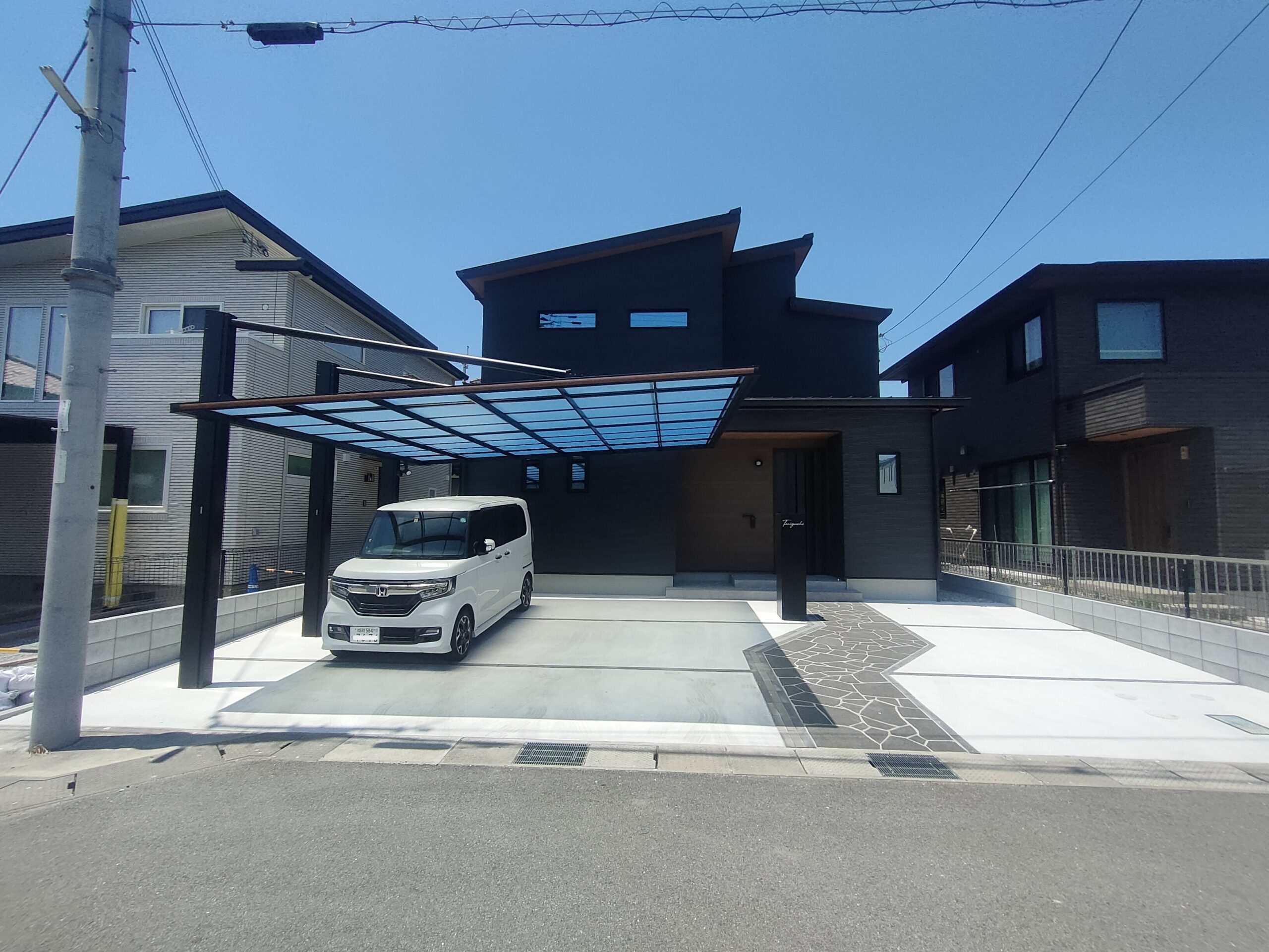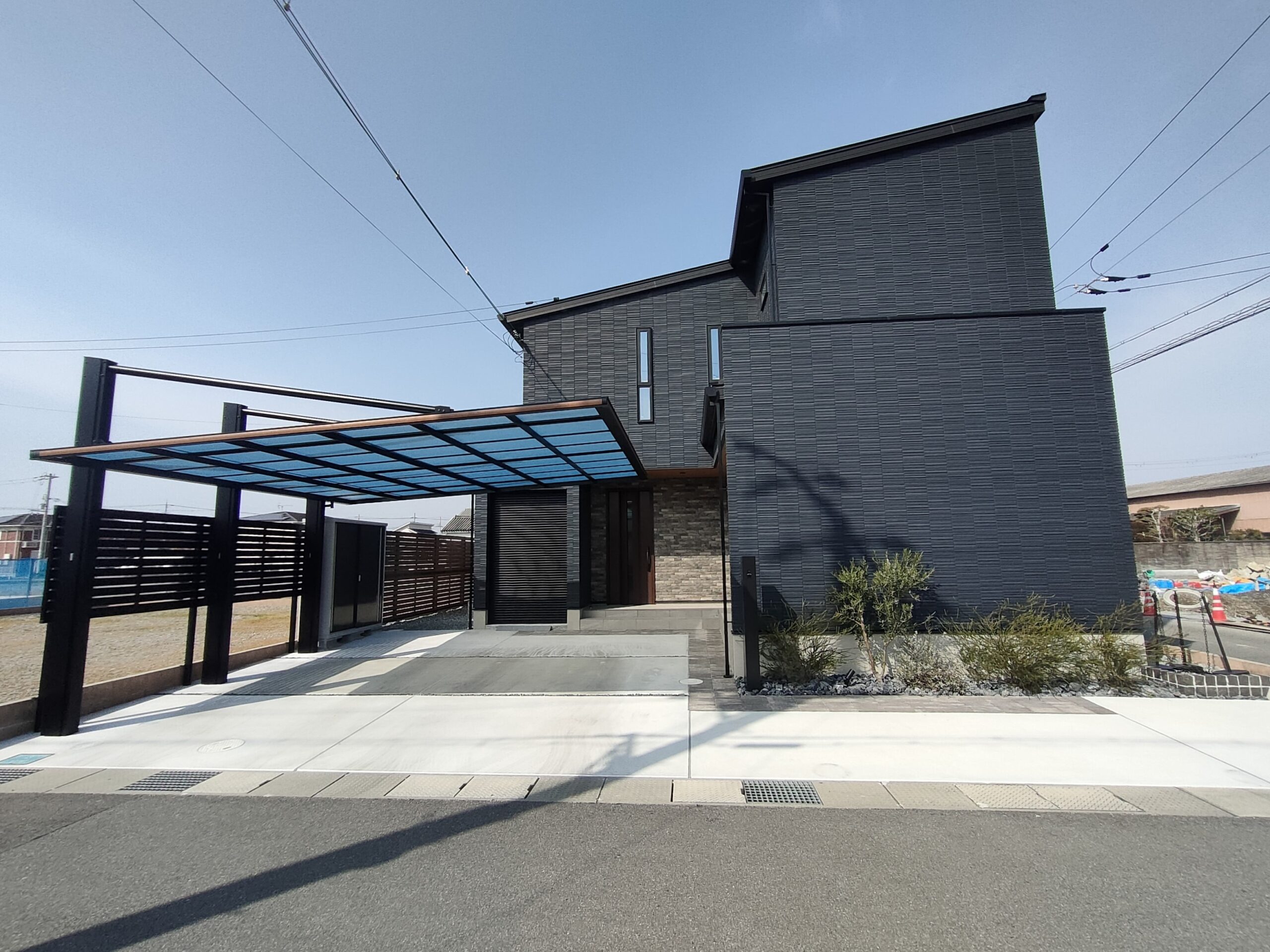 太子町新築外構 黒のモダンデザインカーポート ダブルフェース