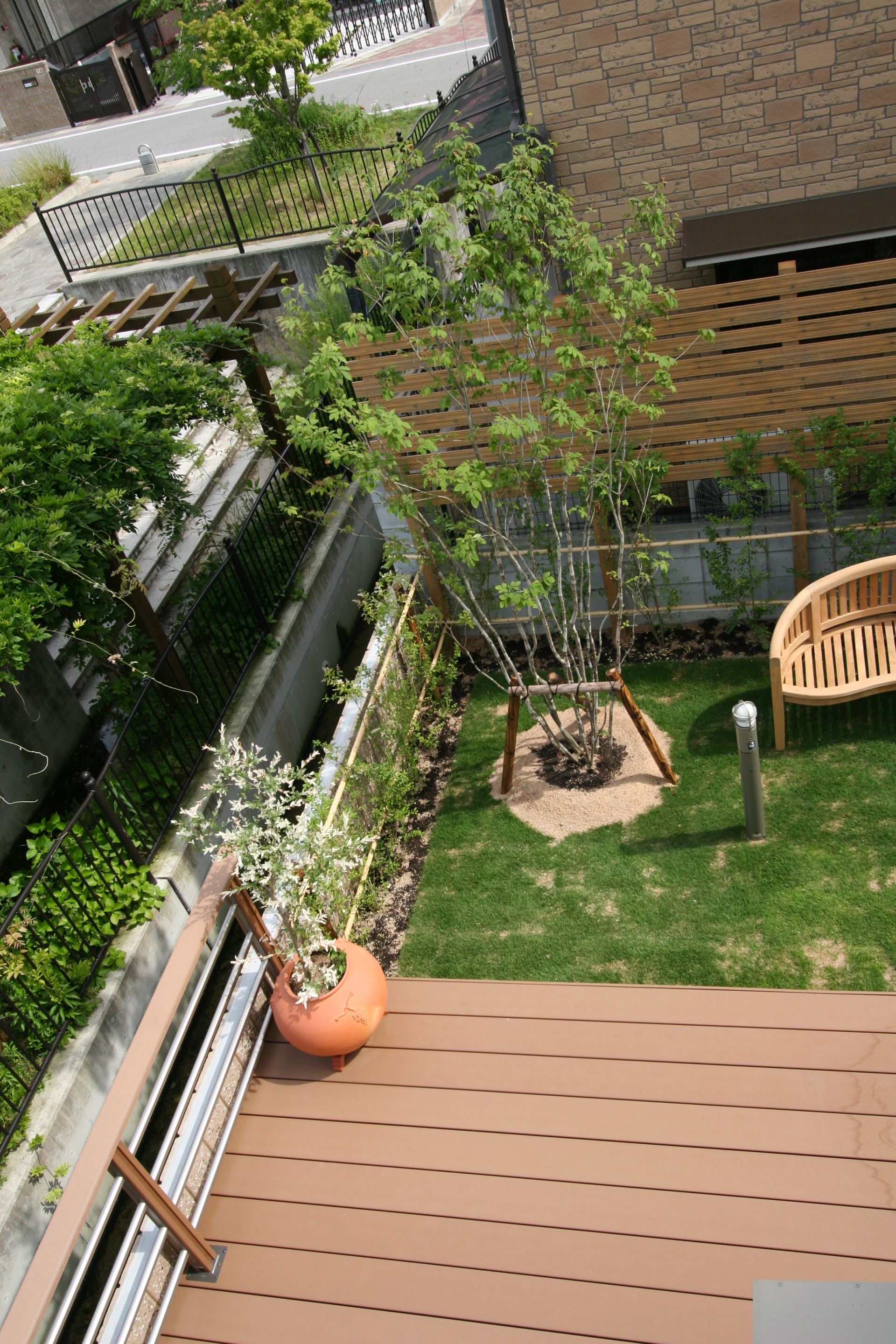 施工実績 目隠しされたお庭のメインツリー|アオダモ たつの市T様邸 南向きのお庭のメインツリーにアオダモの配置 木目調フェンスを背景に室内からの眺めも考慮しました 全体の完成写真はこちらからどうぞ アオダモの育て方・剪定 詳しくはこちらからどうぞ