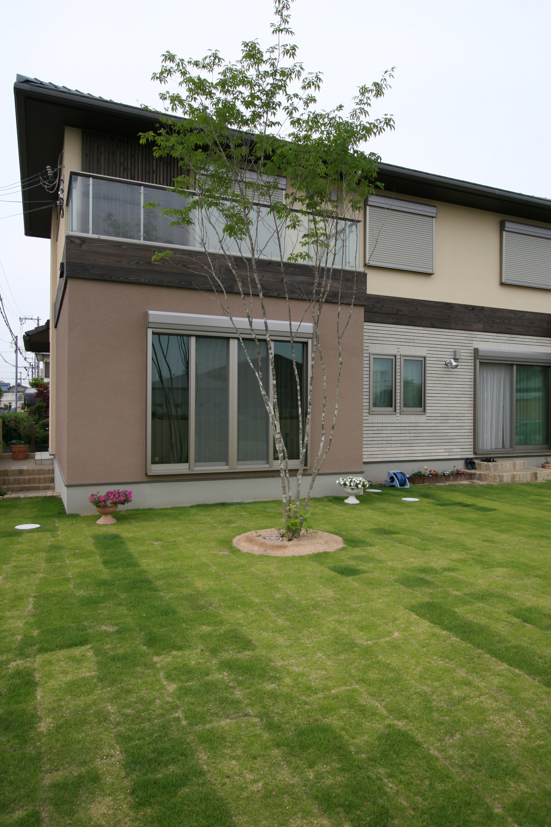 施工実績 モダン和風な外観に雑木|アオダモ 太子町M様邸 モダン和風な雰囲気がある建物外観に雑木のアオダモを植樹しました 広々とした芝生ではお子様の遊ぶ姿が目に映ります このアオダモが入った全体の完成写真はこちらです アオダモの育て方・剪定 詳しくはこちらからどうぞ