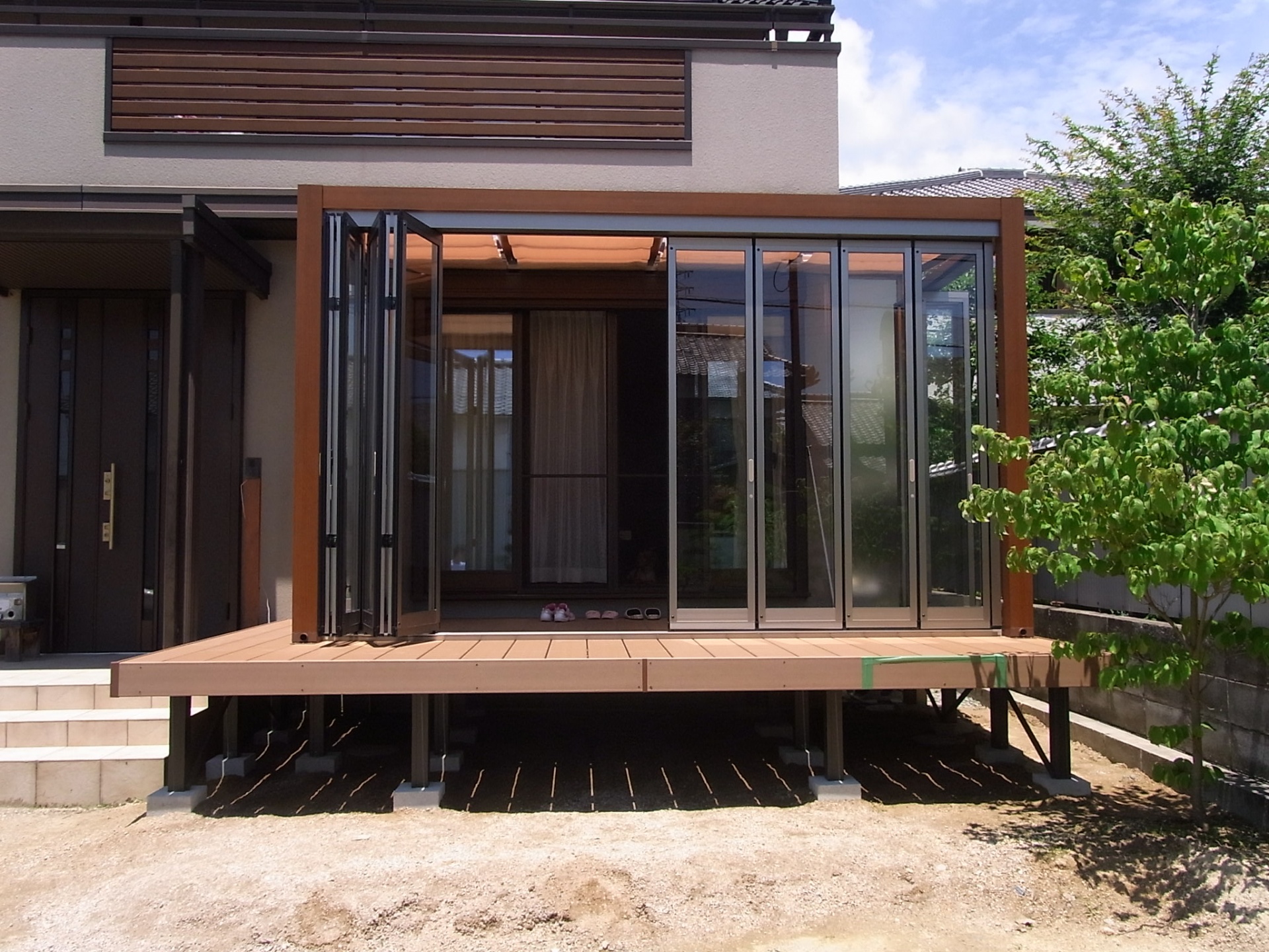 施工実績 バロックチークカラーのジーマガーデンルーム 姫路市O様邸 路市O様邸ガーデンルームZIMA。バロックチークのご紹介です。建物のバルコニーのアクセントカラーのウッド色に合わせ、シャイングレーとバロックチークの組み合わせにてデザインしました。 before 以前は、少し高めの吐き出しの窓でここからは出入りが困難でした。 オプションの日除けで夏場の日差しを和らげでくれます。