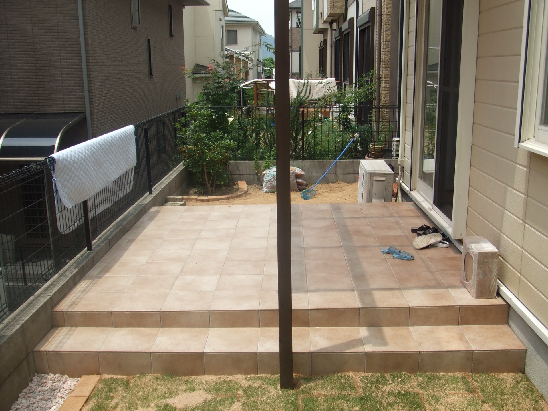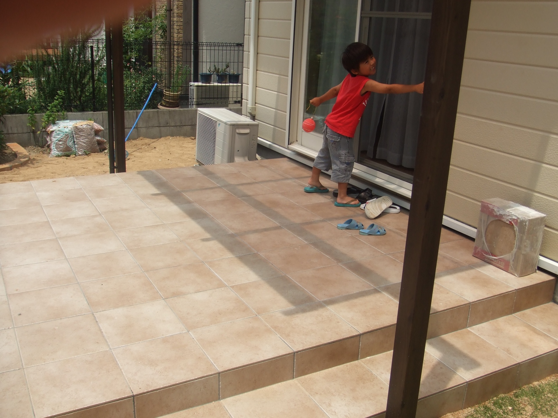 施工実績 三協立山ナチュレテラス+300角タイルテラス 揖保郡T様邸 三協立山アルミのウッド調テラス ナチュレ。通常のテラスとは違いパーゴラ調になっているのが特徴。 条件によって柱移動が可能でデザインもおしゃれです。庭の部分に通常のテラスではちょっととお思いの方にお勧めです。 このテラスは柱移動が出来、通常タイルテラスに入る柱をテラスの外側に施工する事が出来ます。 お子様も快適に遊べる空間が出来ました。