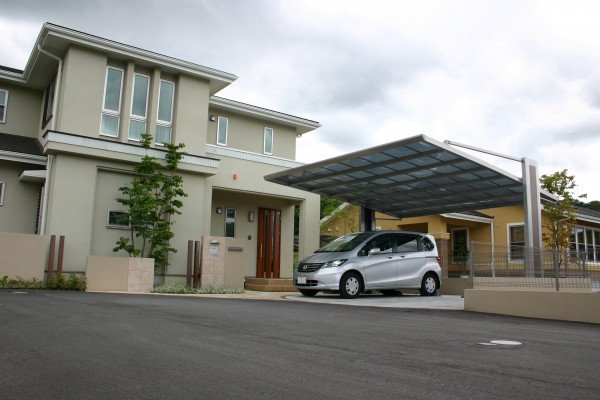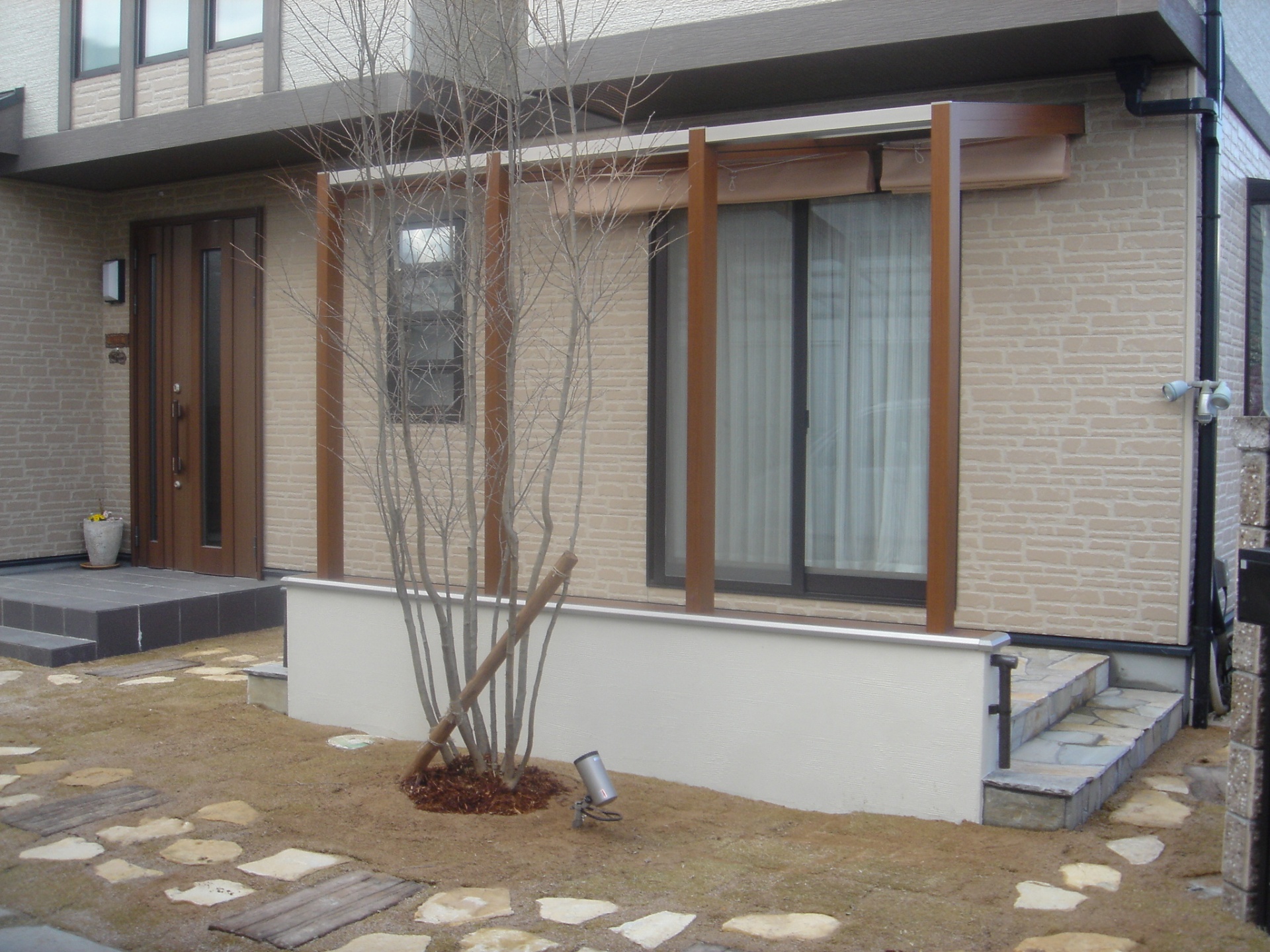 施工実績 加西市新築外構 ヤマボウシを中心に高さの違う壁でアクセント メインツリーに紅花ヤマボウシがインパクトのある加西市A様邸。門柱は300角タイルと建物同系色のシンプルな仕上げで、木製のスリットフェンスをアクセントに立てました。車庫スペースには玄関アプローチと干渉しないように二本柱の(四国化成)マイポートをセレクト。屋根は標準で熱線遮断のため夏場の車にやさしい設計になっています。地面には手入れの要らないヤブラン・フッキ草などで構成しました。 車庫全景 メインツリーのヤマボウシは春先に薄い紅色で楽しませてくれます。