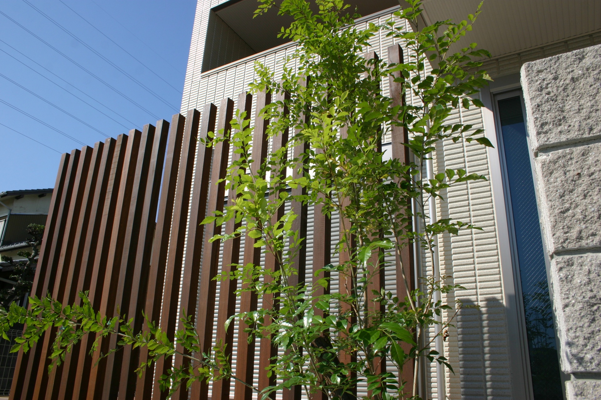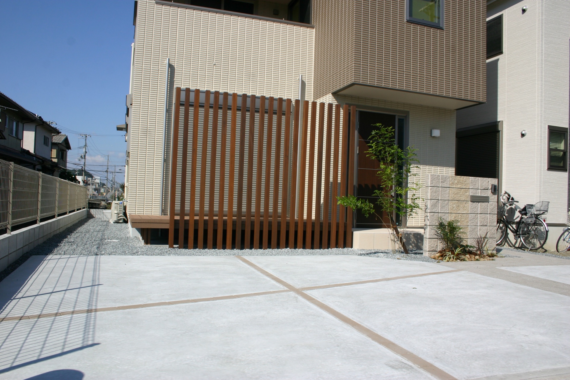 施工実績 姫路市新築外構 ブラウンカラーアクセントでモダンエクステリア ブラウンとべージュのツートンカラーがポイントの姫路市U様邸。玄関扉のブラウンに合わせデッキ前の目隠しを同系色のウッドで連続スリットフェンスでデザインしました。門柱も落ち着いた色合いのデザインブロックでツートンデザインに施工しました。 シマトネリコの植栽のグリーンとウッドの連続スリットのカーラーコーディネイト。 ウッドのカラーを基調にした落ち着いたデザインに完成しました。
