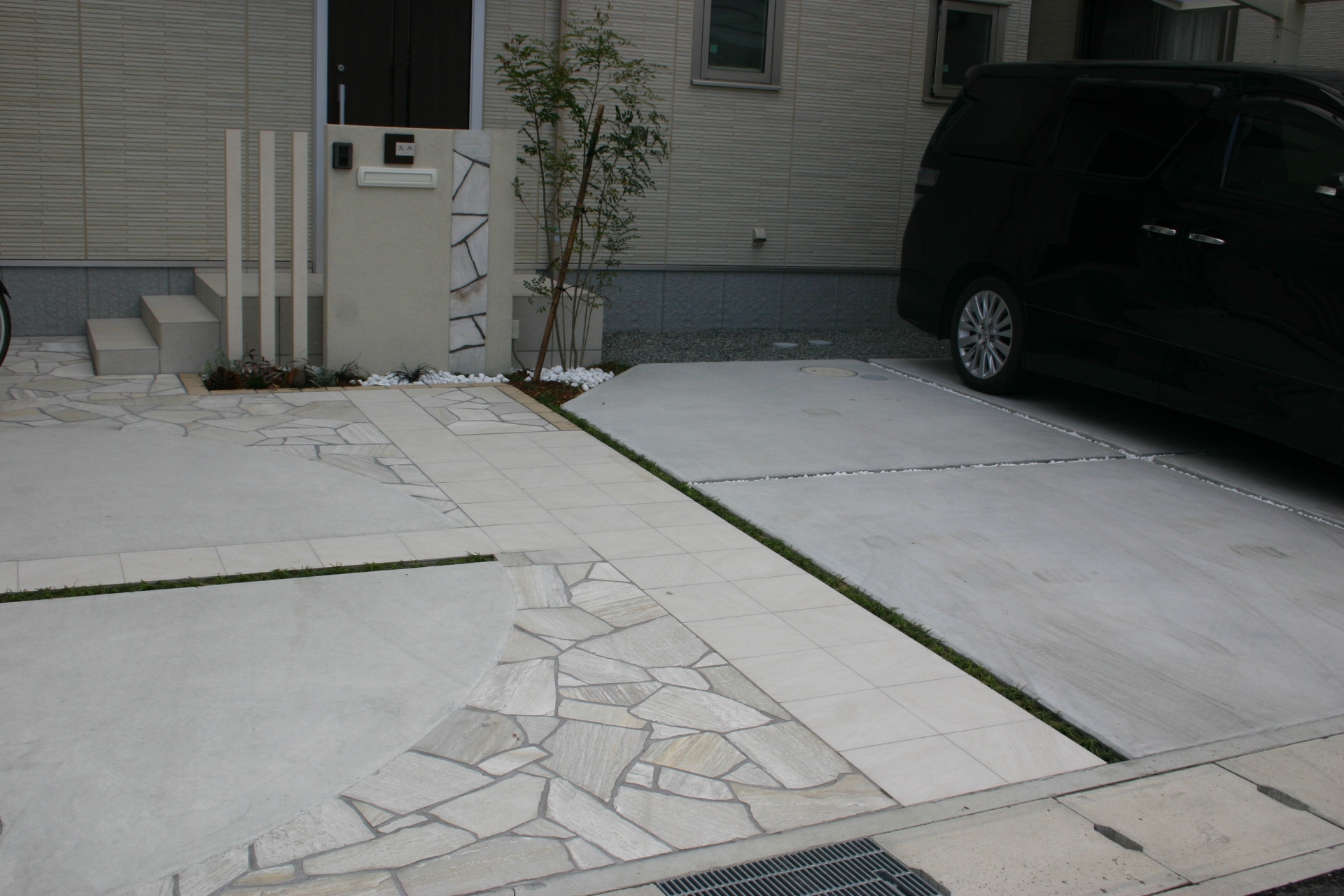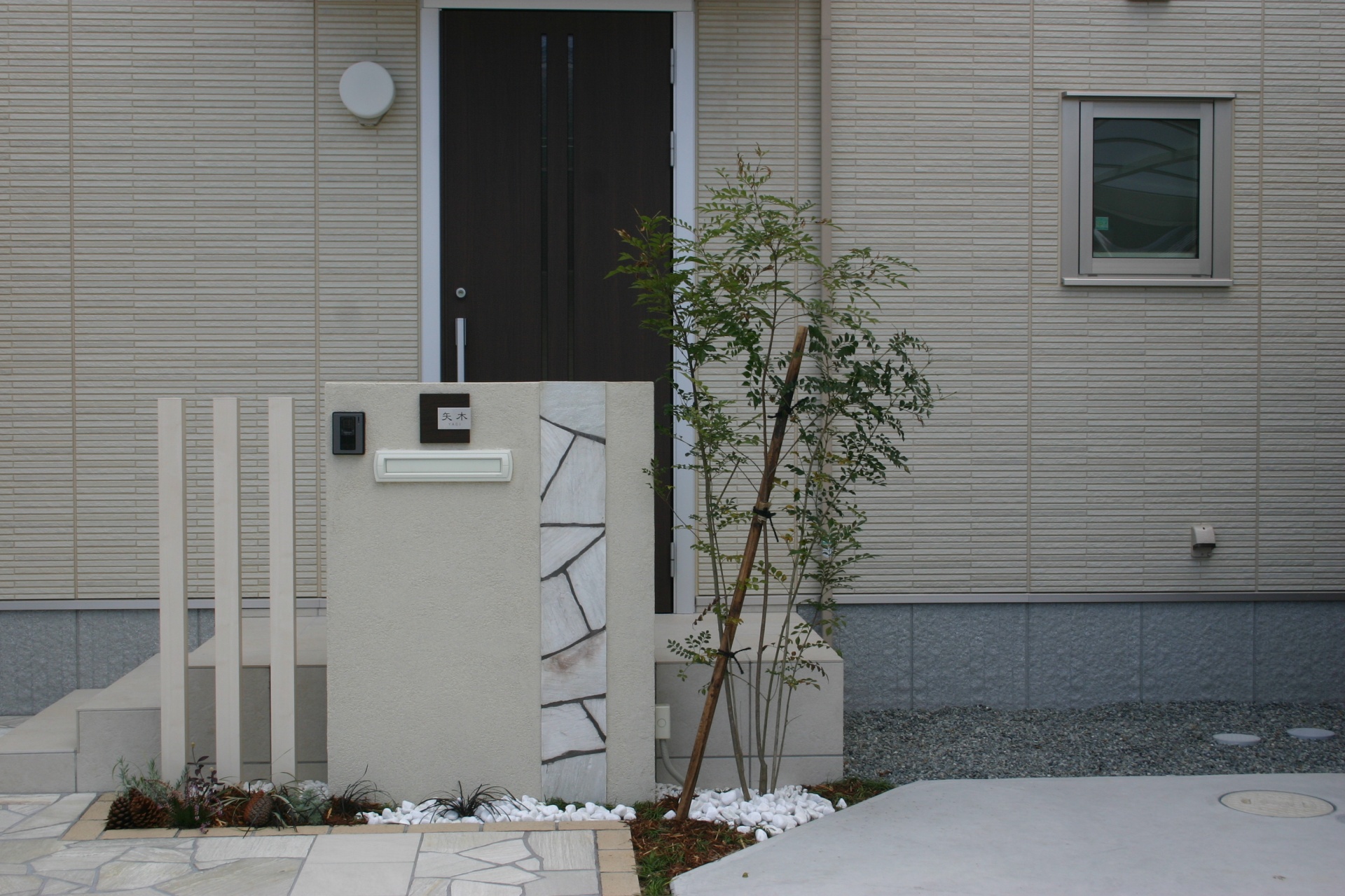 施工実績 太子町新築外構 ホワイト門柱のクールエクステリア ホワイトでまとめたクールなエクステリアプラン。全体的に明るい印象になりました グリーンのラインの延長上にシンボルのシマトネリコ自然石のホワイトもインパクトあります。 ホワイトカラーでまとめたエクステリアデザイン門柱玄関扉のプライバシーも考慮しているデザインです 大胆なR状のホワイト自然石のアプローチデザイングリーンのラインもワンポイントです。