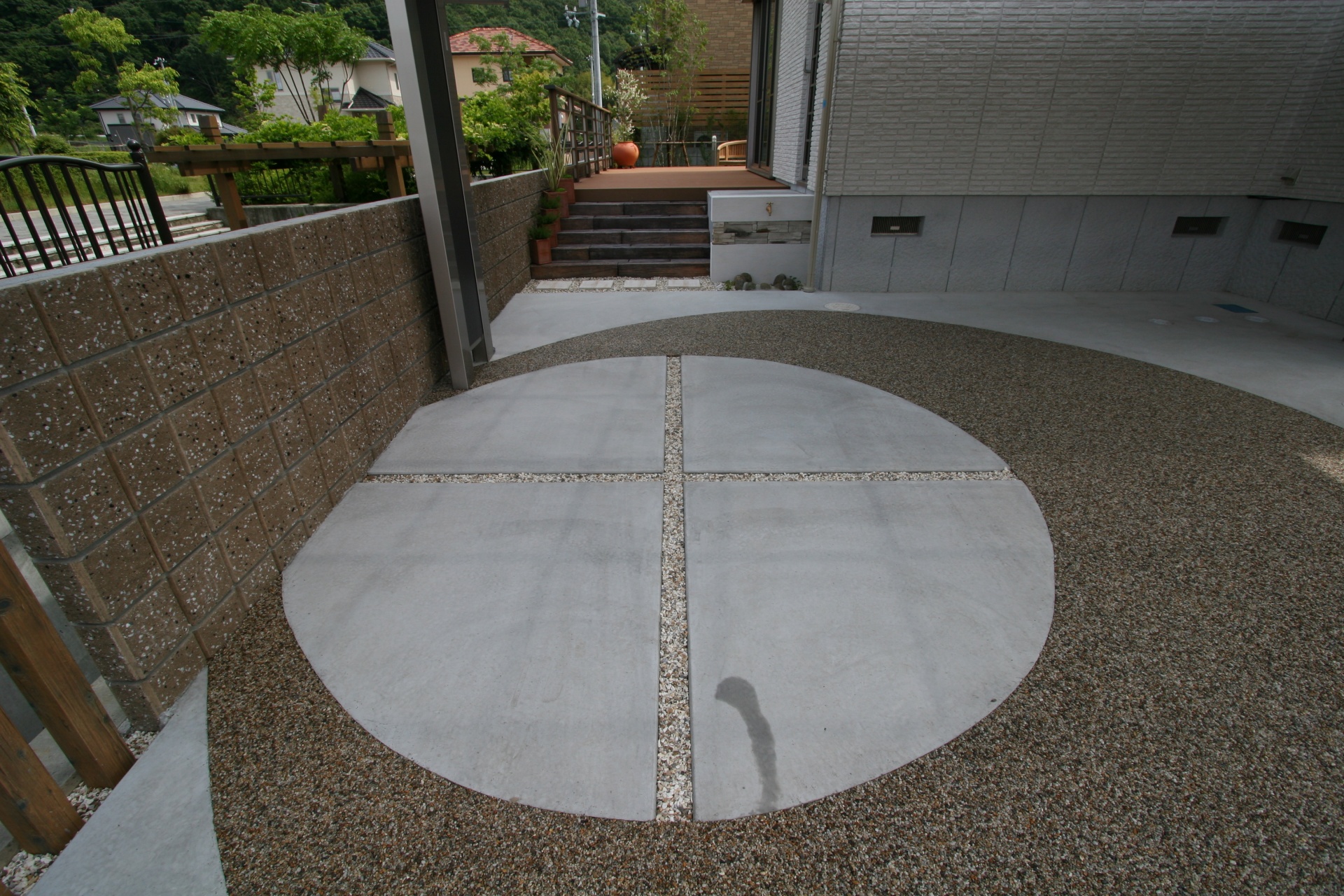 施工実績 たつの市新築外構 欧風デザインが可愛い緑のオリーブ 建物のフォーカルポイントを引き立たせるデザインを意識しました。玄関ポーチタイルをナチュラルウッドの横張りフェンスを使い目隠し+足元の引き締め役で使用。オリーブの鉢植えは施主様好みでしたので、メインツリーとして配置し、門柱にも同じ開口部分を設け、額縁を作りその中にオリーブをモチーフとした鋳物フェンスを取り入れました。花壇も建物正面、庭部分にも設け視覚効果が得られます。フロントガーデンにはホワイトデッキ。プライベートガーデンには石貼りテラス。敷地条件をうまく使ったエクステリア・ガーデンが出来上がりました。 車庫スペースは洗い出しとタマリュウの組合わせ。クロスのデザインがポイントです。 レトロ門灯とアイアンサインの組み合わせ。センターのアイアンサインがポイントです 正面からのアングルです。ホワイトの玄関扉に映るオリーブが印象的です。 ホワイトレンガのFBOX。色様々な植栽が楽しめます。 アプローチステップは自然石仕上げにて自然な感じに演出。