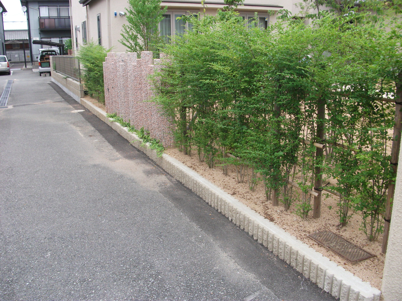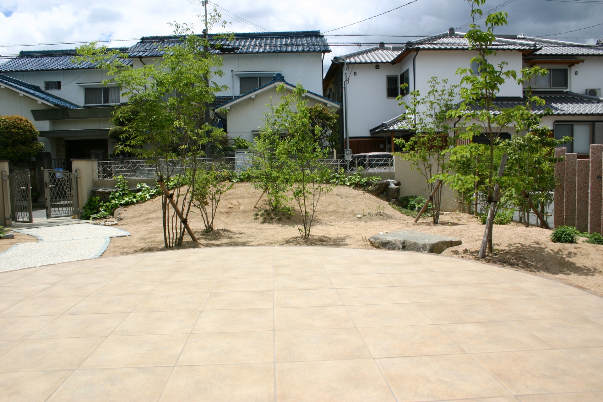 施工実績 姫路市新築外構 既存石垣を使用したクローズエクステリア 既設の石垣を残し門周りと庭廻りを工事させていただいた姫路市I様邸。道路面には奥様のお気に入りのアイビー・アベリアなどを絡ませるアルミワイヤーフェンスをセレクトしました。 庭に入ると大型の円形タイルテラスがポイントとなります。アプローチには自然石淡路の本洗出し仕上げで緑に囲まれた通路が玄関まで導いてくれます。 円形タイルテラスからの眺め。木々の成長が今後楽しみです。 道路面には、特注の赤御影石のスリットフェンスをデザインしました。プリペットとの緑もコラボレーションが美しいです。